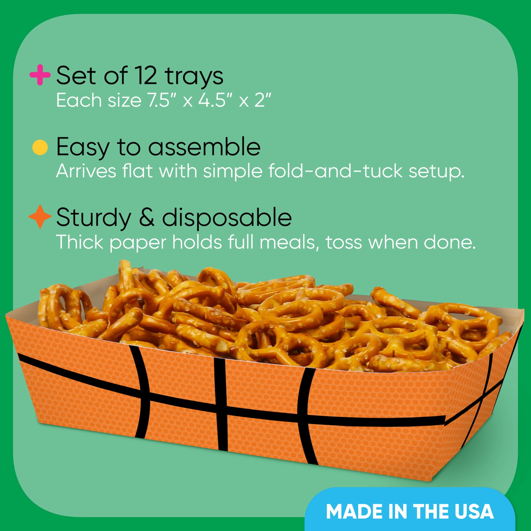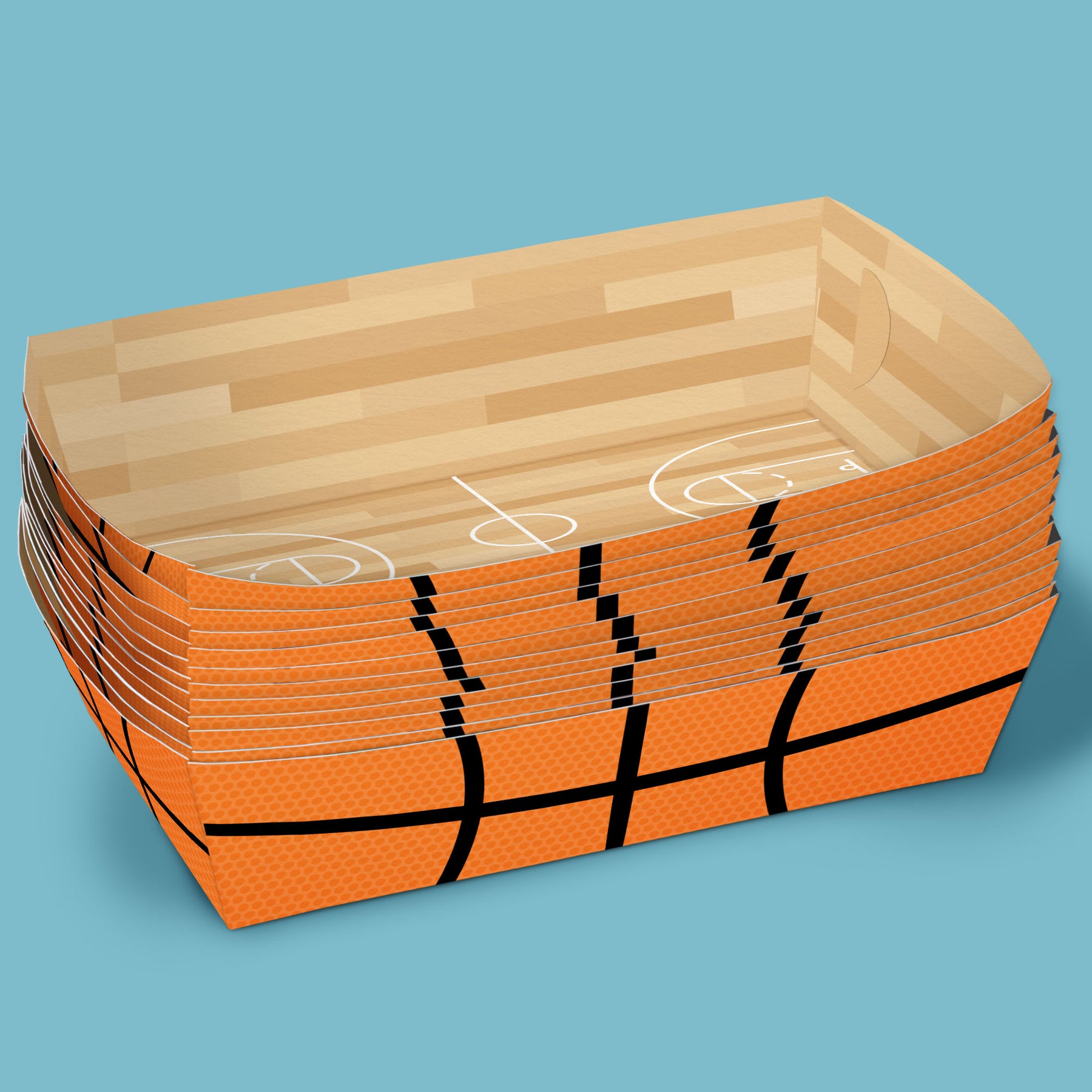 Serve up fun with this set of 12 disposable paper food trays, the perfect way to add a festive flair to your Basketball party table! Each tray is double-sided with vibrant, professionally printed patterns on both the inside and outside, making your food setup look effortlessly cute. Measuring 7.5” x 4.5” x 2”, these sturdy trays can hold everything from hot dogs and French fries to nachos, burgers, appetizers, or even slices of cake. Perfect for kids’ birthday parties, backyard BBQs, school events, and summer gatherings, these food boats are an easy upgrade from plain paper plates. They ship flat and assemble quickly with simple folding — no glue or tape needed. Whether you call them food trays, paper boats, or snack holders, you’ll love how these add style and function to your food display. Plus, they’re proudly designed & made in the Midwest.