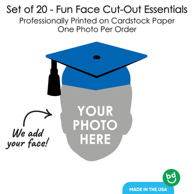 Make your graduation party unforgettable with our custom Fun Face large-shaped cutouts -complete with a festive blue grad cap! Featuring your grad’s smiling face, these decorations are perfect for banners, centerpieces, photo booths, or even the buffet table. Whether you hang them up, prop them on tables, or use them for fun photo ops, these personalized cutouts will make your celebration stand out. Each one arrives with your grad’s face printed on the front, topped with a bold blue graduation cap, and a white back. Get ready to cheer on your graduate in the most fun way possible—because their big day deserves BIG decorations!