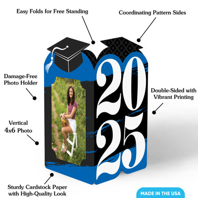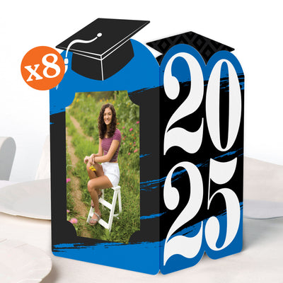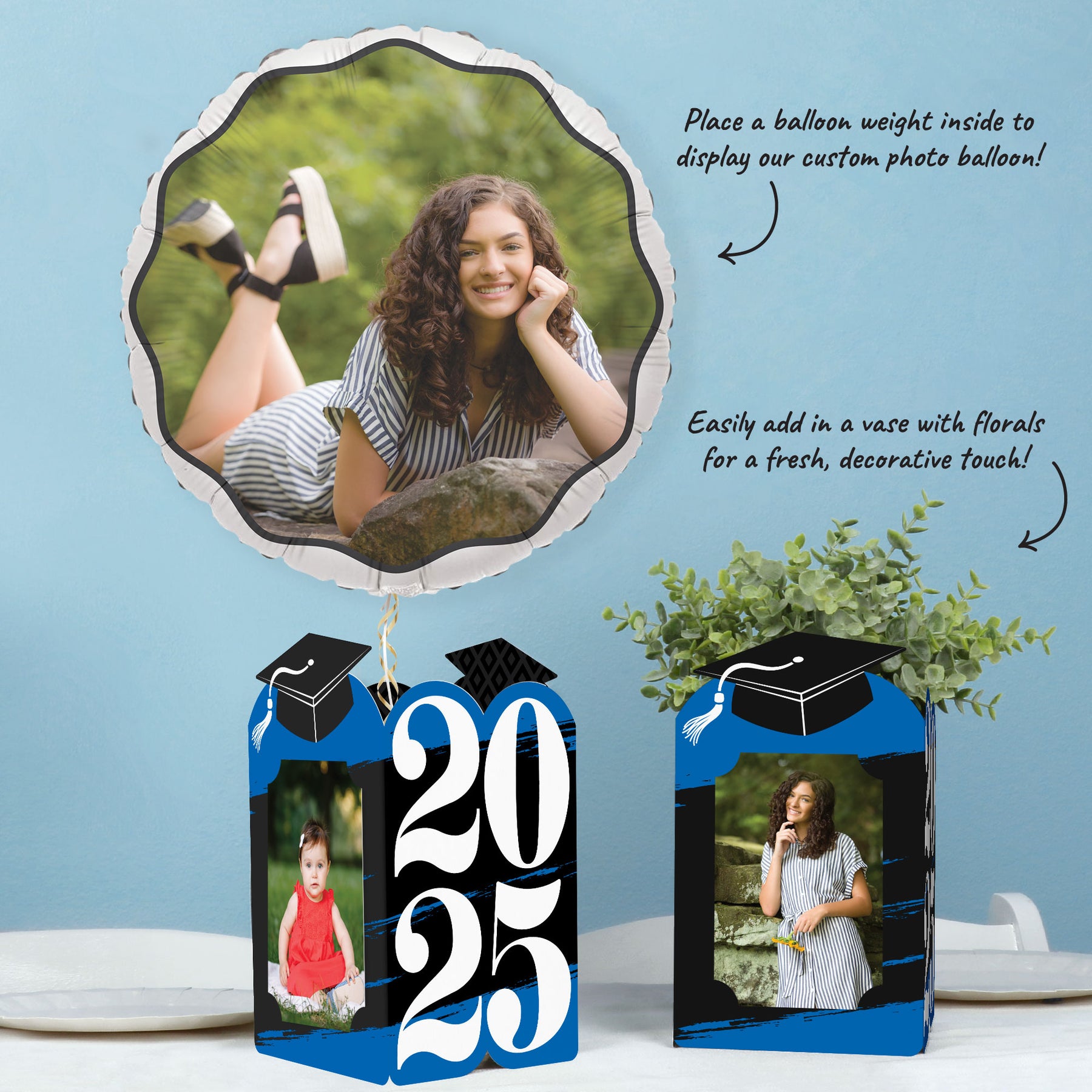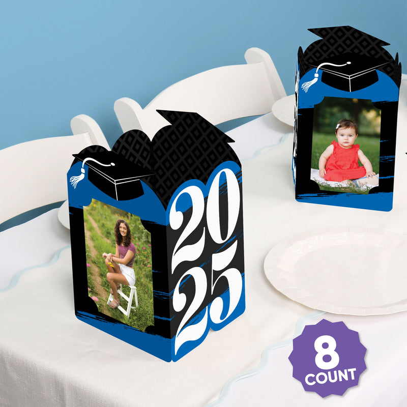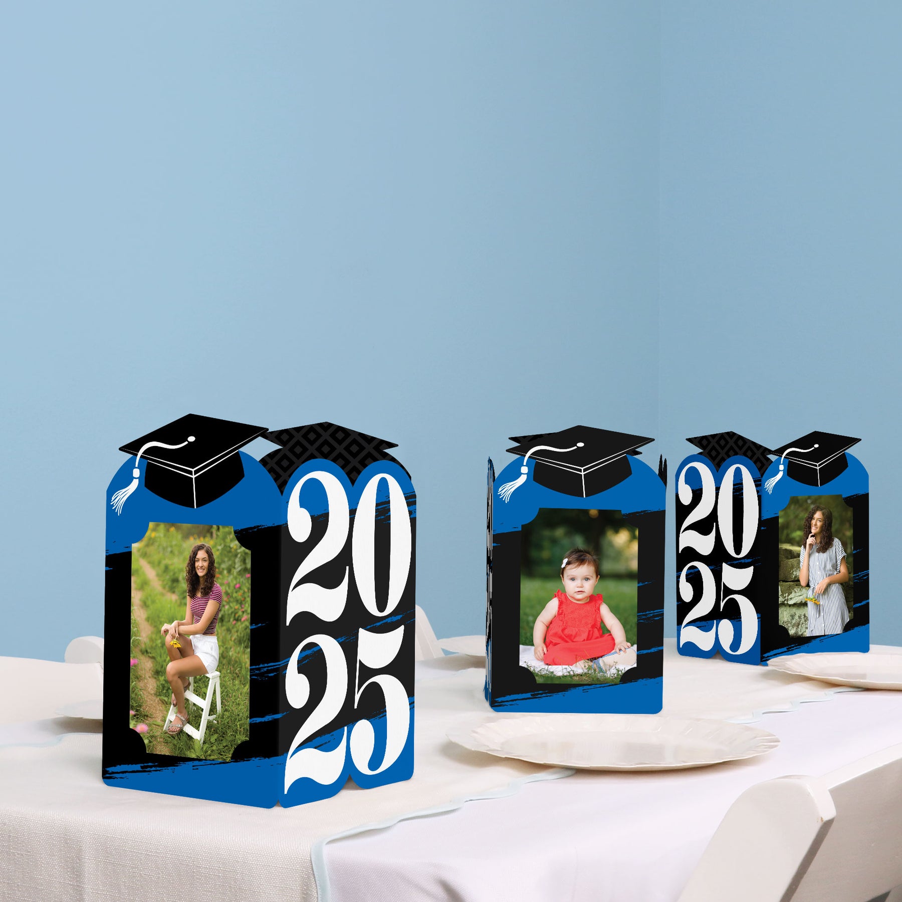 Planning a graduation party is no joke, but adding a personal touch has never been easier! These Blue Graduation Party Photo Holder Centerpieces are a painless (and seriously fun) addition! This set of 8 cube-shaped centerpieces lets you show off your grad’s journey from kindergarten to senior year—perfect for displaying their K-12 school photos in one place. With space for up to 16 vertical 4x6 pictures, each centerpiece features two sides with secure tabs for photos and two sides with a bold “2026” design, making them a total conversation starter. Whether placed on dining tables, dessert stations, or the gift table, these centerpieces instantly add a personalized and festive touch. Want to get creative? Use them to hold 3-5” vases, 5” flower boxes, or even balloons for a custom party look. Made from sturdy cardstock paper with a glossy, photo-like finish, they arrive pre-assembled and ready to party—no DIY disasters here! Plus, with a coordinating interior pattern, they bring that polished, picture-perfect vibe to your blue-themed grad celebration. Proudly made in the Midwest, these Class of 2026 centerpieces are an easy win for any grad party!