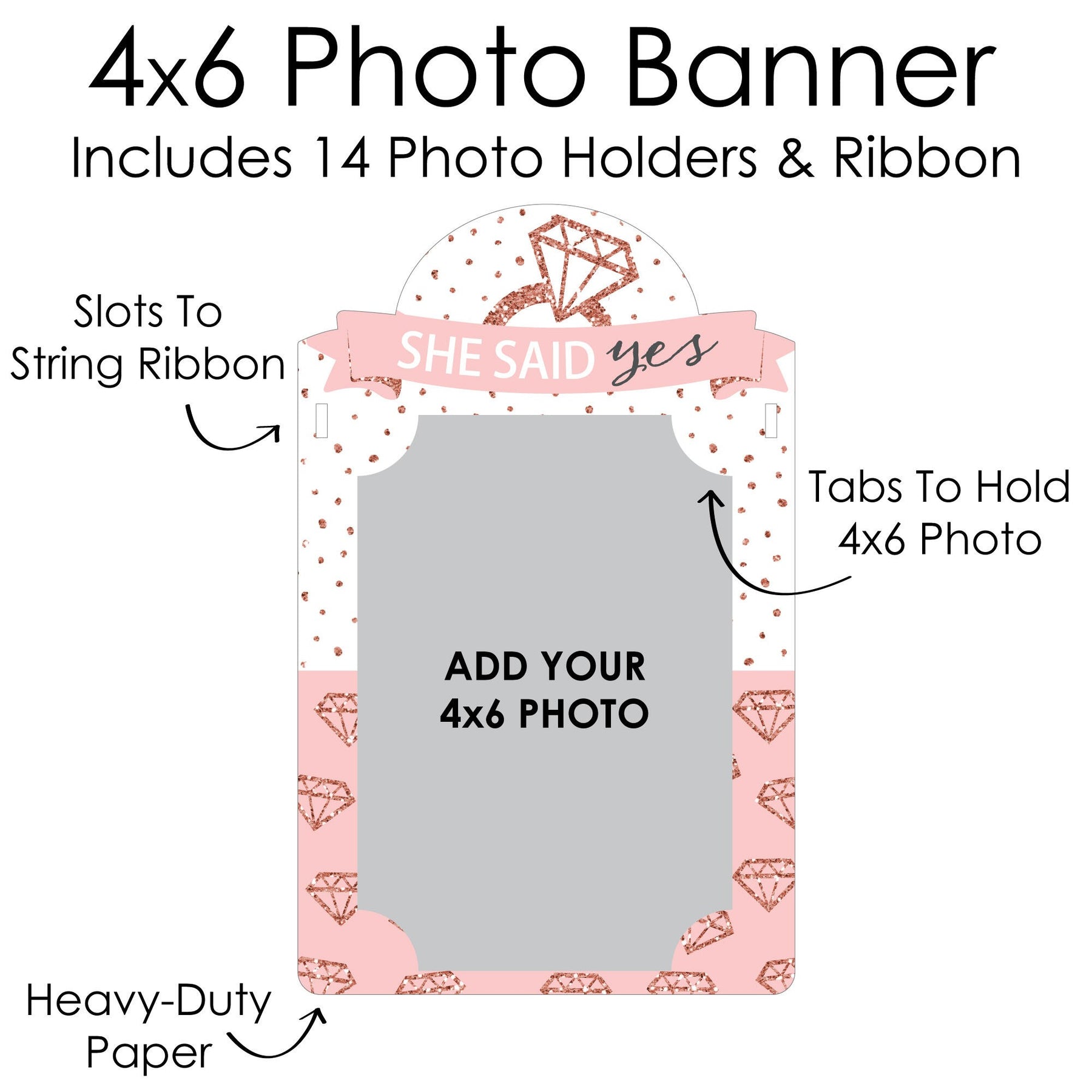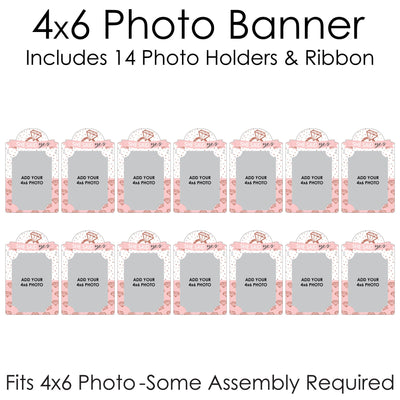 Start by inserting your vertical 4x6 photo into the pre-cut corner tabs of each photo holder. Following the number sequence on the back of each photo holder, simply string the included satin ribbon through the slots. Create multiple rows by cutting the ribbon to your desired length or hang as one long banner. This Photo Banner will look great in all areas of your bridal shower or bachelorette party venue. Hang the Photo Banner at the front of the buffet table or behind the dessert table. It will also be great at the entrance to greet guests or above the guest of honor’s seat for a fun photo op.