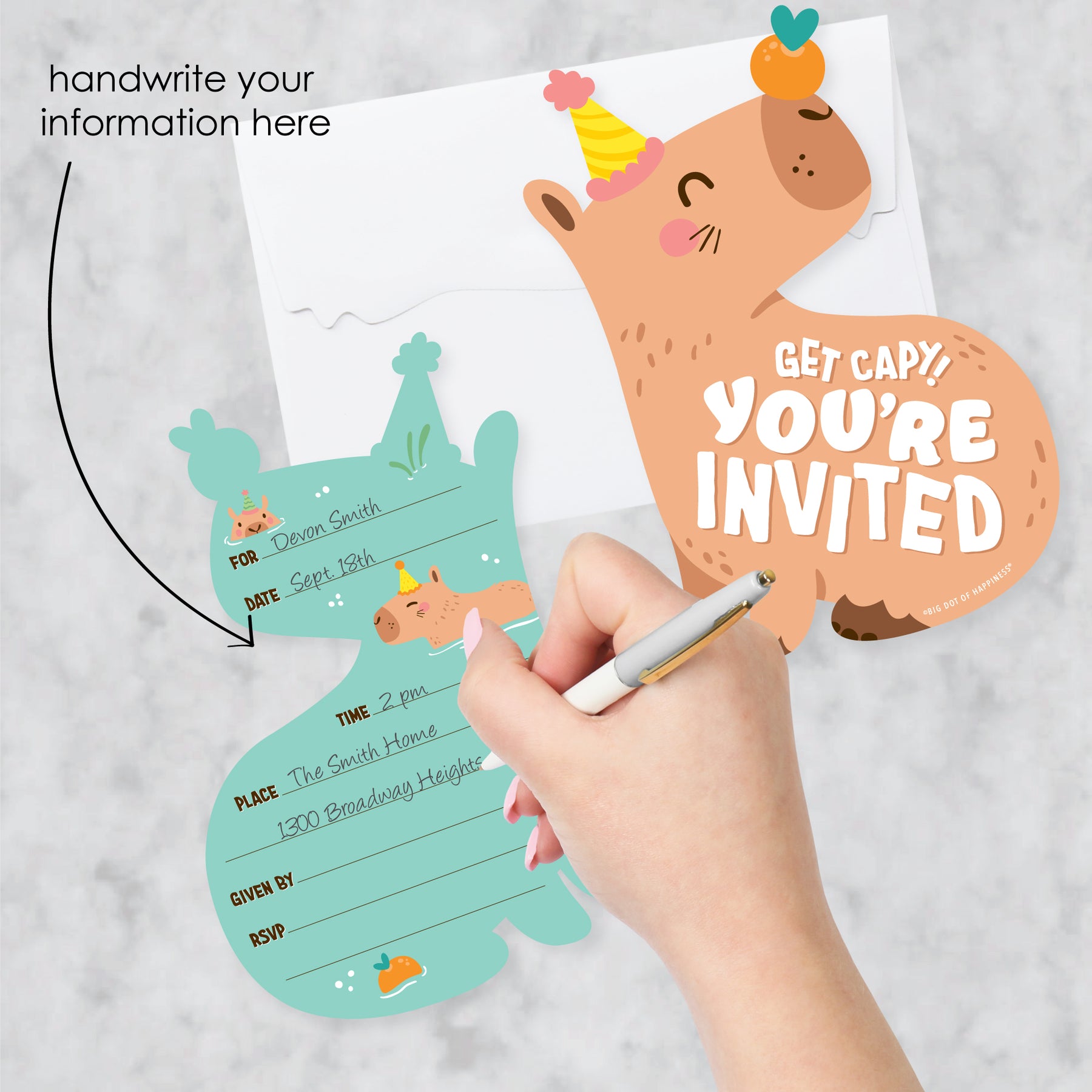 Invite friends and family to your Birthday Party with Capybara invitation cards. These fun party invites are printed on sturdy cardstock paper and have plenty of space to add the party details. Plus, their unique shape will be adored by all your guests. Each set of 12 shaped fill-in invitations includes 12 white envelopes, making it easy to get your party invitations into the mail. Begin planning the perfect Party with these invites!