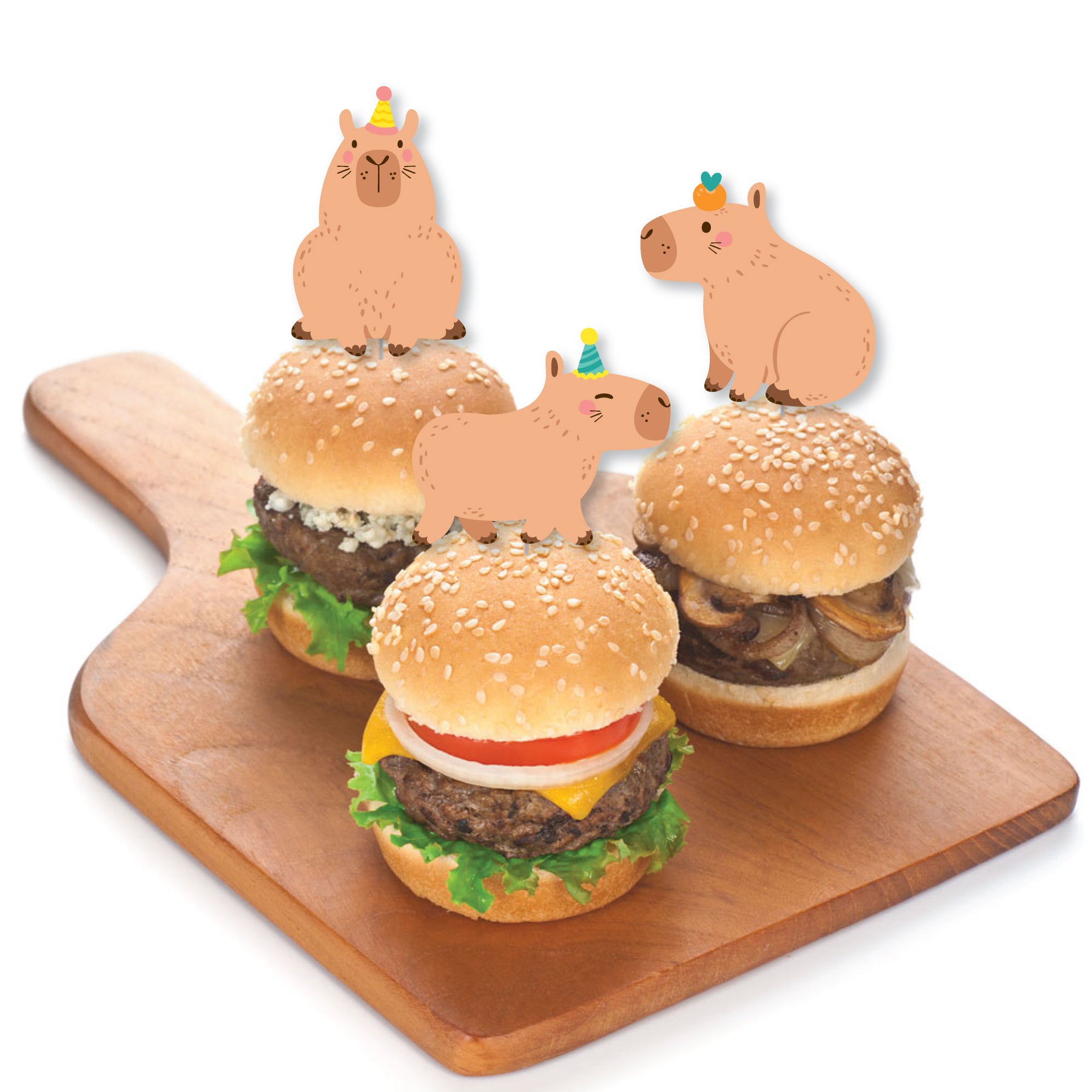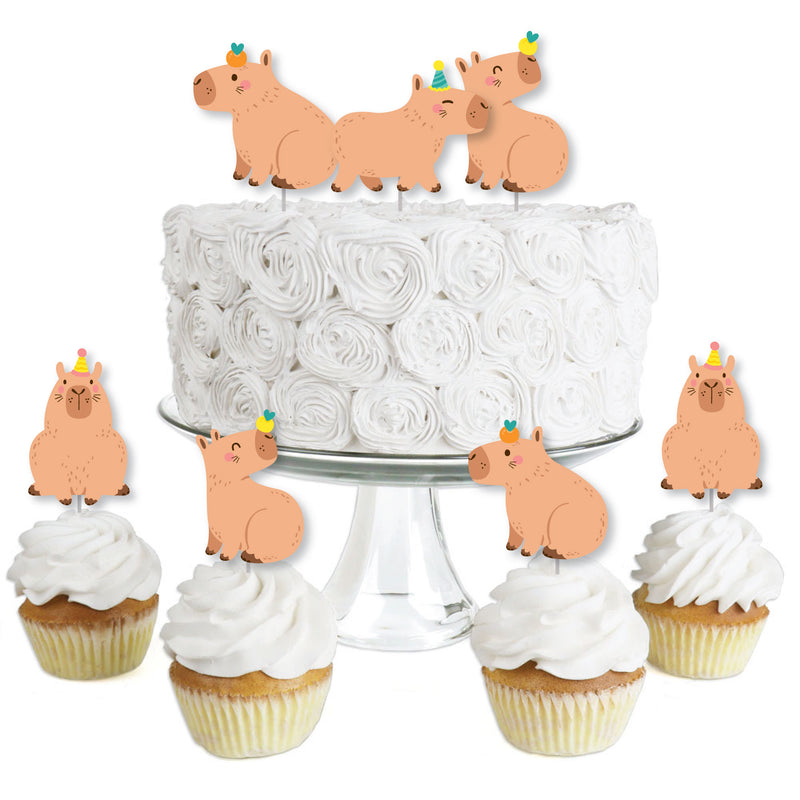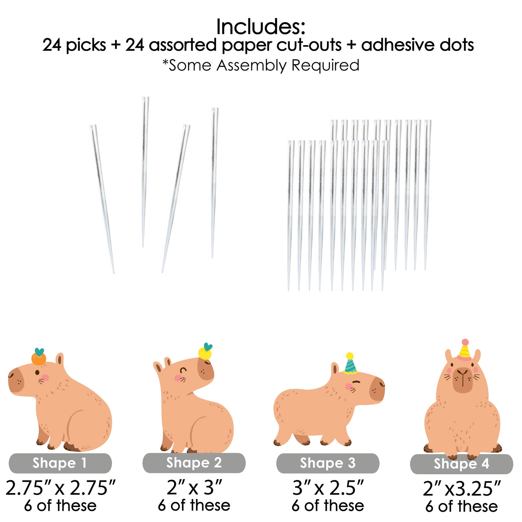 Create a unique dessert bar at your Birthday Party with Capybara Dessert Cupcake Toppers. This do-it-yourself kit includes clear treat picks and fun shaped cut outs. Simply attach each double-sided paper cut out to a clear plastic pick with the included clear stickers. Dessert Cupcake Toppers look great on standard cupcakes or add them to other baked goodies such as brownies or donuts. Other appetizers and miniature fruit kabobs are also easy to make with these fun food picks.