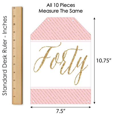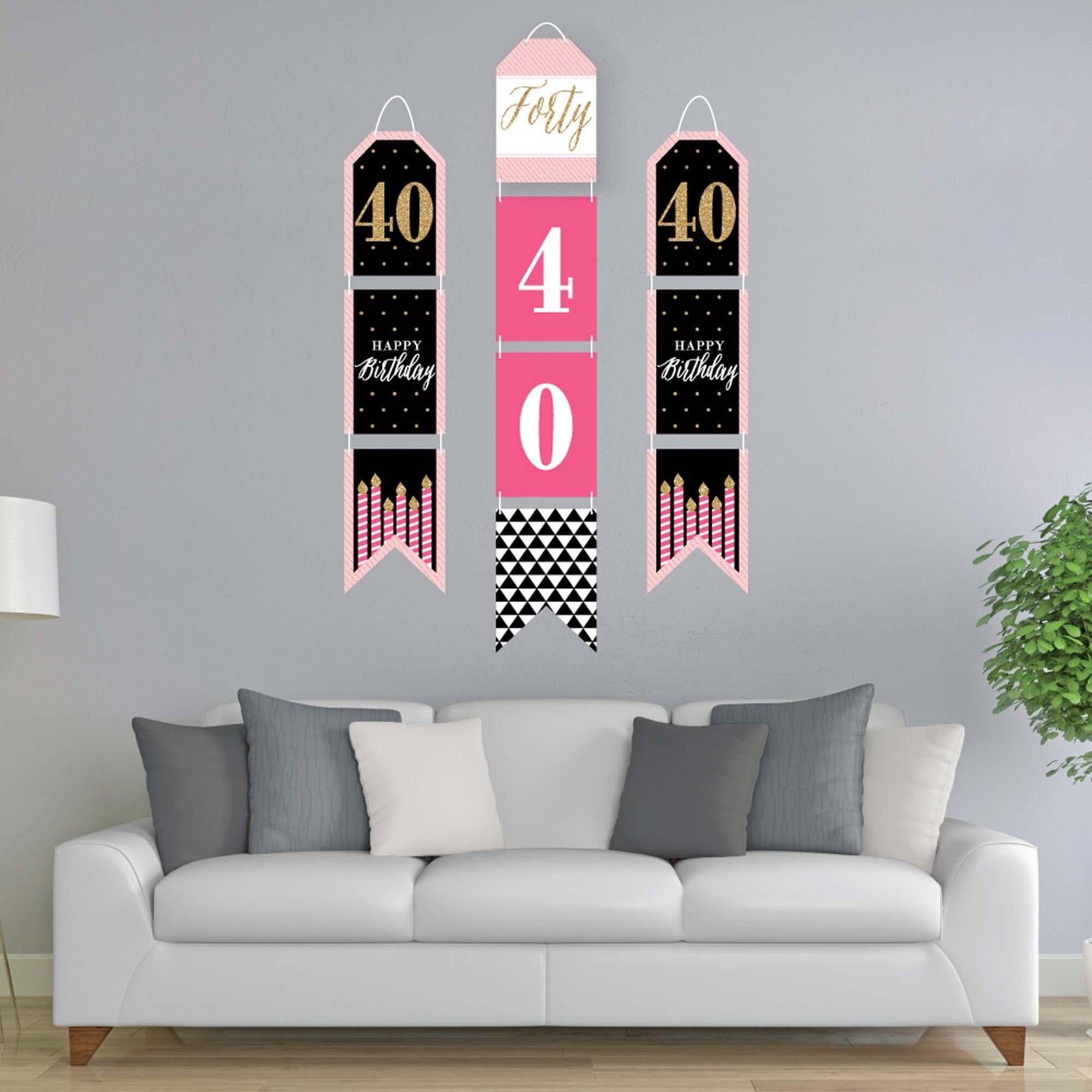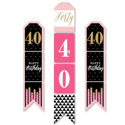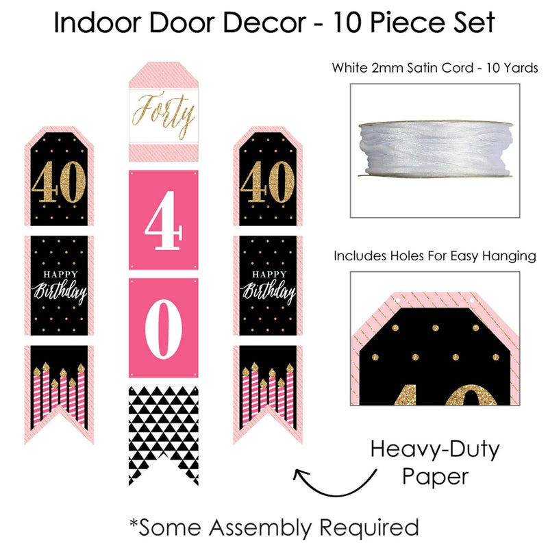 Give your celebration that wow-factor when you add Chic 40th Birthday - Pink, Black and Gold Indoor Door Decor to your Girl Birthday Party. This must-have wall decoration kit includes 10 banner pieces professionally printed on heavy-duty cardstock paper. Quickly assembly each vertical hanging banner with the included cording & instructions. Each banner piece is numbered in sequence, making party decorating easy for even the last-minute hostess. Hang at the entrance of your event space, over the food or gift table, or any open wall space to create a fun focal point at your Chic 40th Birthday - Pink, Black and Gold Party.