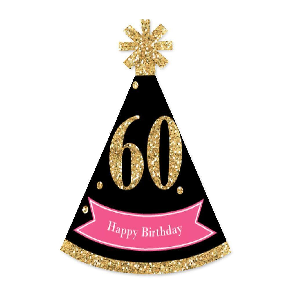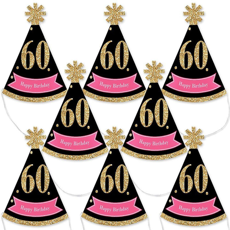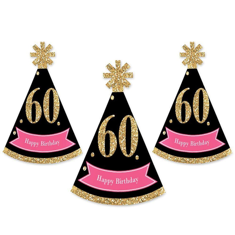 Chic 60th Birthday - Pink, Black and Gold - Mini Cone Birthday Party Hats - Small Little Party Hats - Set of 8