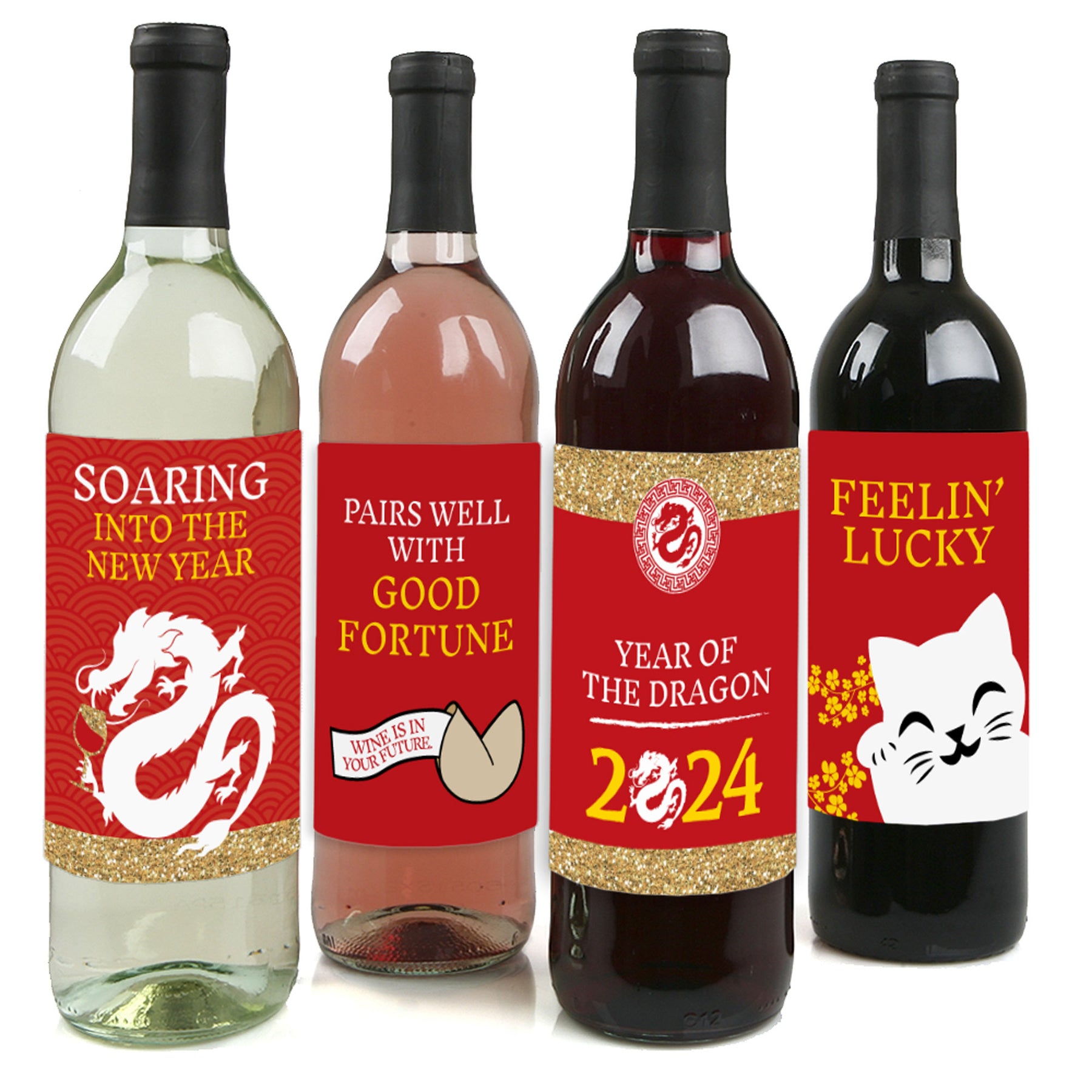 Make the Chinese New Year Party decorations stand out when you add these fun 2026 Year of the Horse wine bottle labels to your beverage bar. Each set of four wine bottle labels has four different yet coordinating designs. Add them to standard-sized bottles, either over the original labels or onto bottles that have had their labels removed. Chinese New Year wine bottle label stickers will dress up your beverage bar and entertain all your guests.