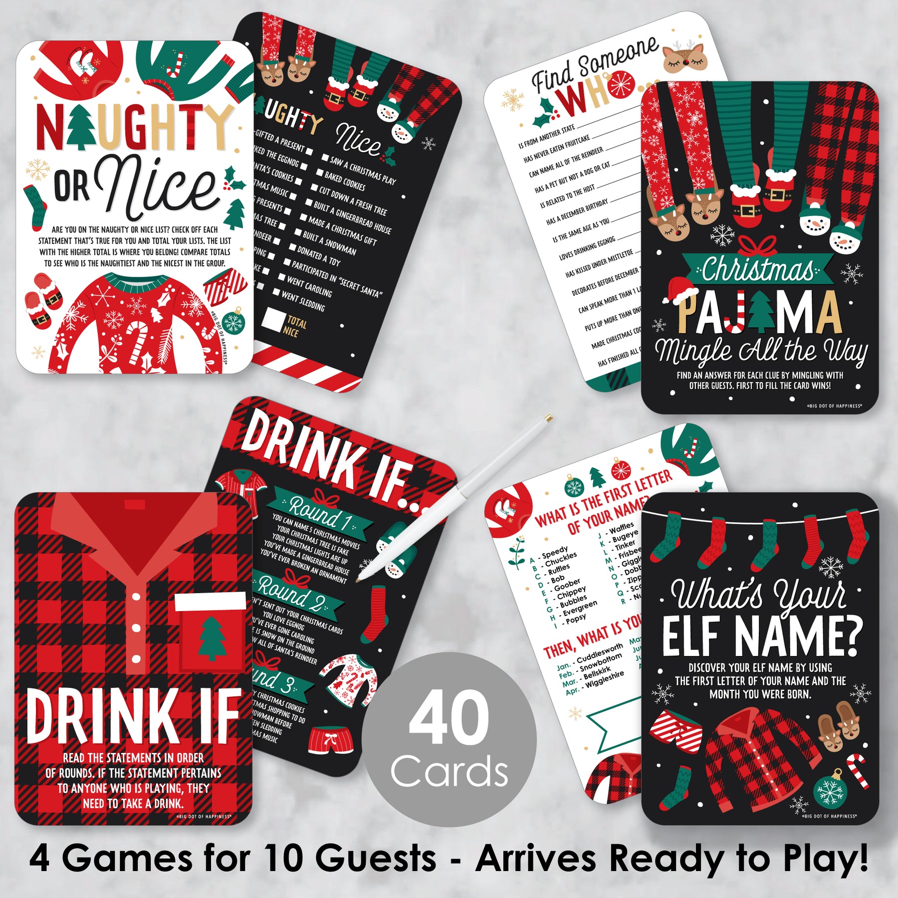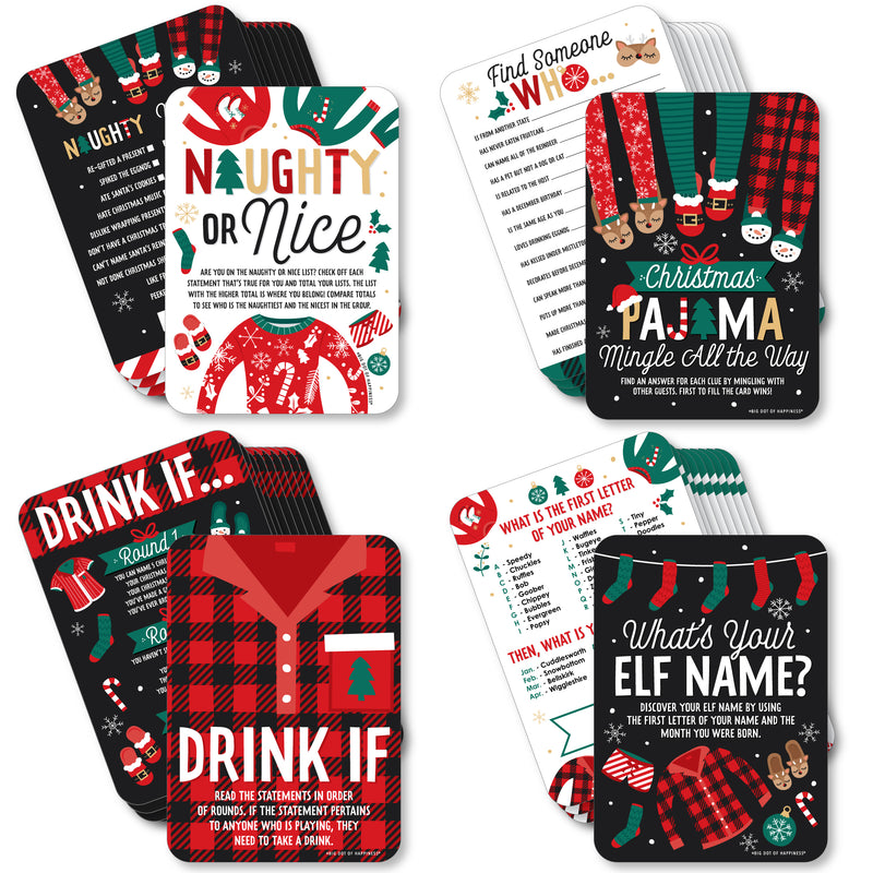 Create a memorable Holiday Plaid PJ Party when you play Christmas Pajamas Gamerific Bundle. This game pack includes 4 different games: Naughty or Nice, What’s Your Elf Name?, Mingle All the Way, and Drink If. Professionally printed on sturdy cardstock paper, our Gamerific Bundle will arrive ready to play and each game card is printed with easy-to-follow playing instructions. For added fun, make each game competitive by adding a time limit and offering a prize to the winning party guest.