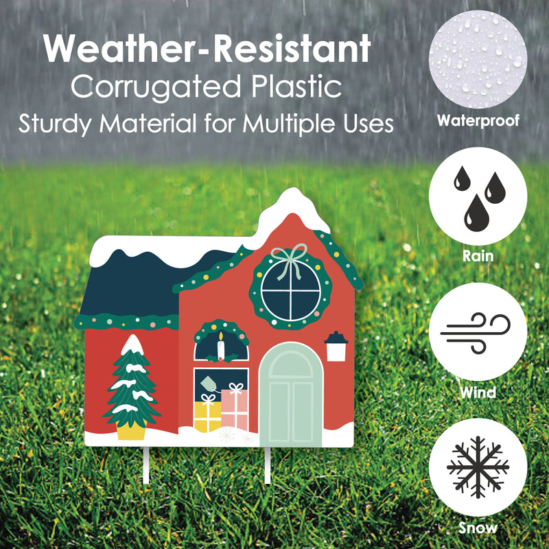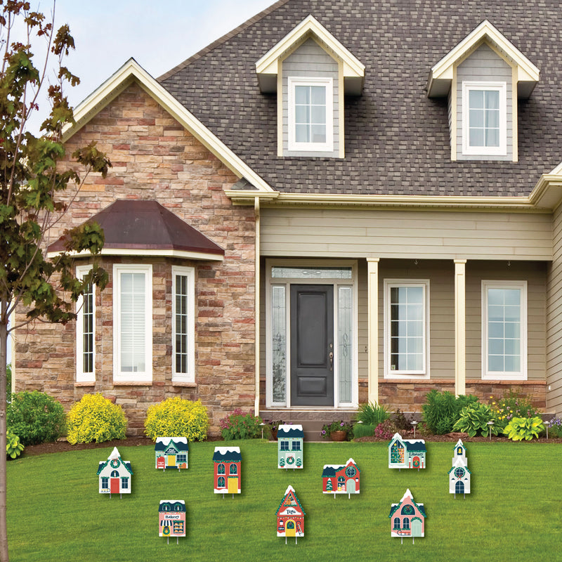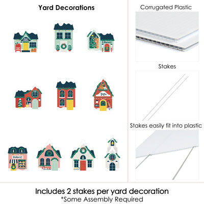 An impressive Christmas Village yard sign is sure to delight your guests and surprise everyone. This 10-piece set of Holiday Winter Houses lawn decorations is professionally printed and will make a statement wherever it is used. Each shaped outdoor Christmas Village sign comes with two stakes, making it easy to display on lawns, driveways or courtyards. Best of all, Christmas Village shapes are cut separately so you can arrange them any way you please. This decorative lawn decoration is made of waterproof plastic and is weather resistant, perfect for short-term display but can be used again and again with proper care.