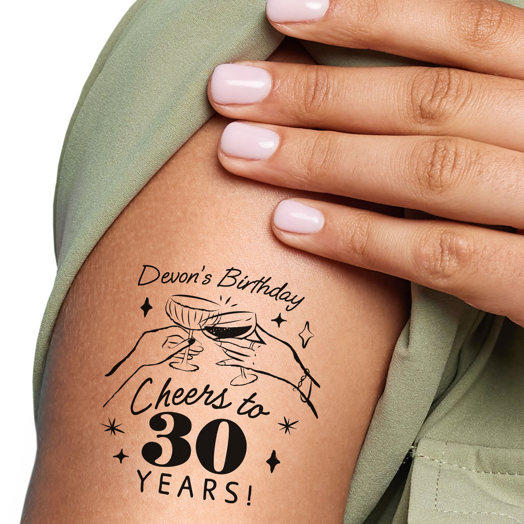Say hello to our festive and fun Cheers to {AGE} Years! Birthday Temporary Tattoos! Featuring a line-drawing of two hands toasting and a custom name, these tattoos are the ultimate party favor for any birthday bash.