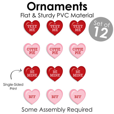 Trim your tree with this set of 12 coordinating Conversation Hearts Ornaments. Made of a flat and sturdy PVC material, this adorable collection of Valentine's Day decorations is printed single-sided, back will be white. (TIP: Use the blank, white side to handwrite dates and years or other memories for a fun keepsake.) Ribbon is included for easy DIY hanging. With the included pre-cut ribbon, thread the ribbon through the hole on the top of each Ornament. Next, tie the ribbon ends together and hang the ribbon loop on a tree branch. This flat ornament set can be used for all kinds of holiday decorating and can be used as a fun gift wrap accessory.