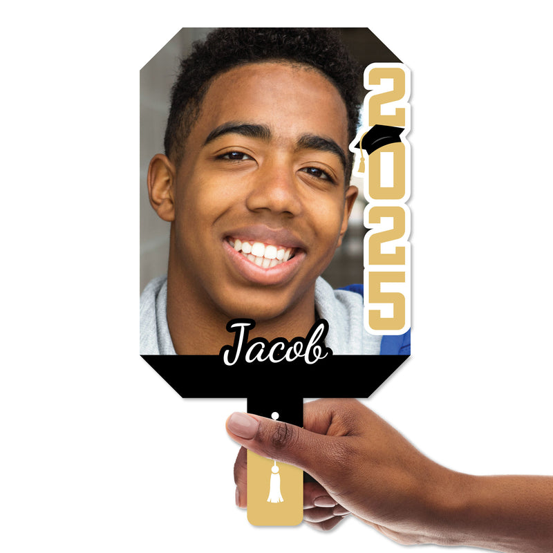 Whether it’s a high school grad party or college commencement, cheer on your graduate with the Class of 2026 Photo Cutout Paddle! This custom head cut-out features 1 photo cutout that is approx. 13 inches tall, including the handle making the cut-out fan easy to hold. Simply upload one photo & share your personalized name text and we do the rest! Perfect for celebratory graduation events, the 2026 Grad Photo Cutout Paddle is professionally printed, one-sided on durable corrugated plastic. Waterproof and weather resistant, the personalized Grad Head on Stick can be used at indoor and outdoor events. With proper care, they can be used at multiple events. The Grad Face Fan Paddle guarantees lots of laughter and memories that will last a lifetime. Prepare for a fun event when you celebrate your guest of honor with the Custom Photo Graduation Paddle.