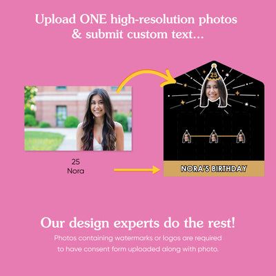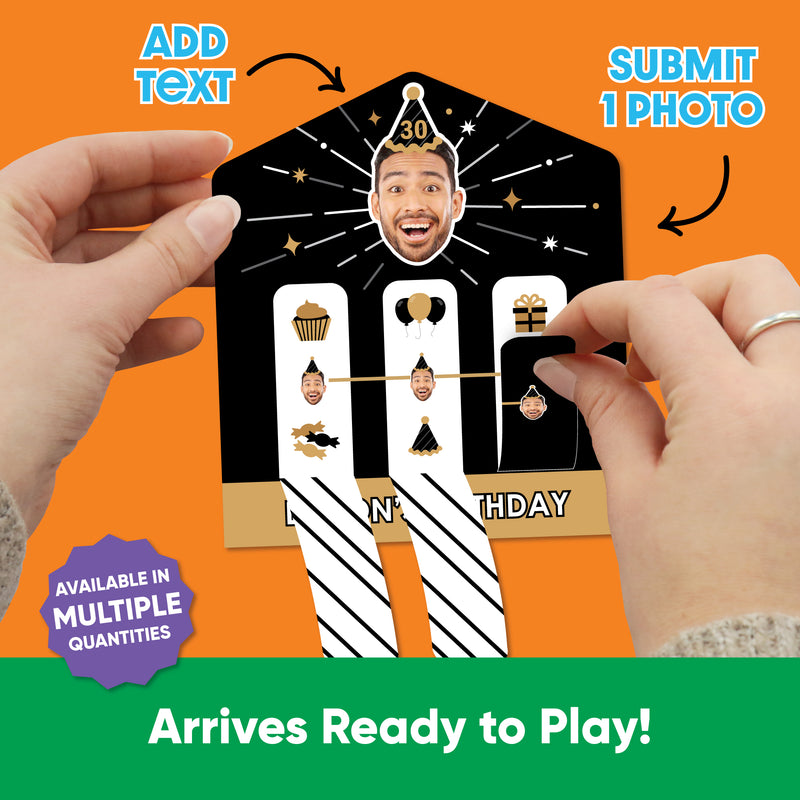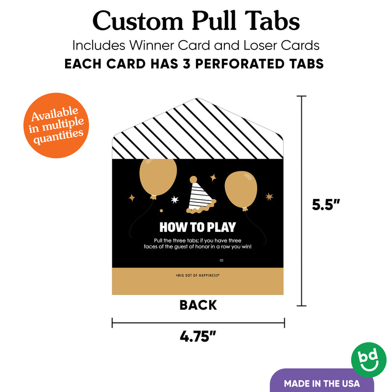 Make your birthday celebration extra special with Personalized Pull Tabs 3 In A Row Game Card in our black & gold Party Time theme! Perfect for birthday parties of all ages, this game includes winning & losing cards to keep the fun going. Upload 1 photo of the guest of honor, and our design experts will create a face-only cutout complete with a party hat graphic that showcases their age. Personalize the text with birthday wishes, the event date, a fun phrase, or even an inside joke to make the game uniquely yours. Guests pull 3 tabs, and if they get 3 matching faces in a row, they win! Each 4.75 x 5.5-inch card is printed double-sided on sturdy cardstock with a glossy finish, and instructions are printed on the back for easy play. Made in the Midwest, these custom pull tabs are a fun addition to any celebration!