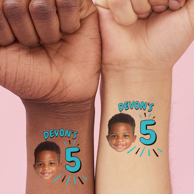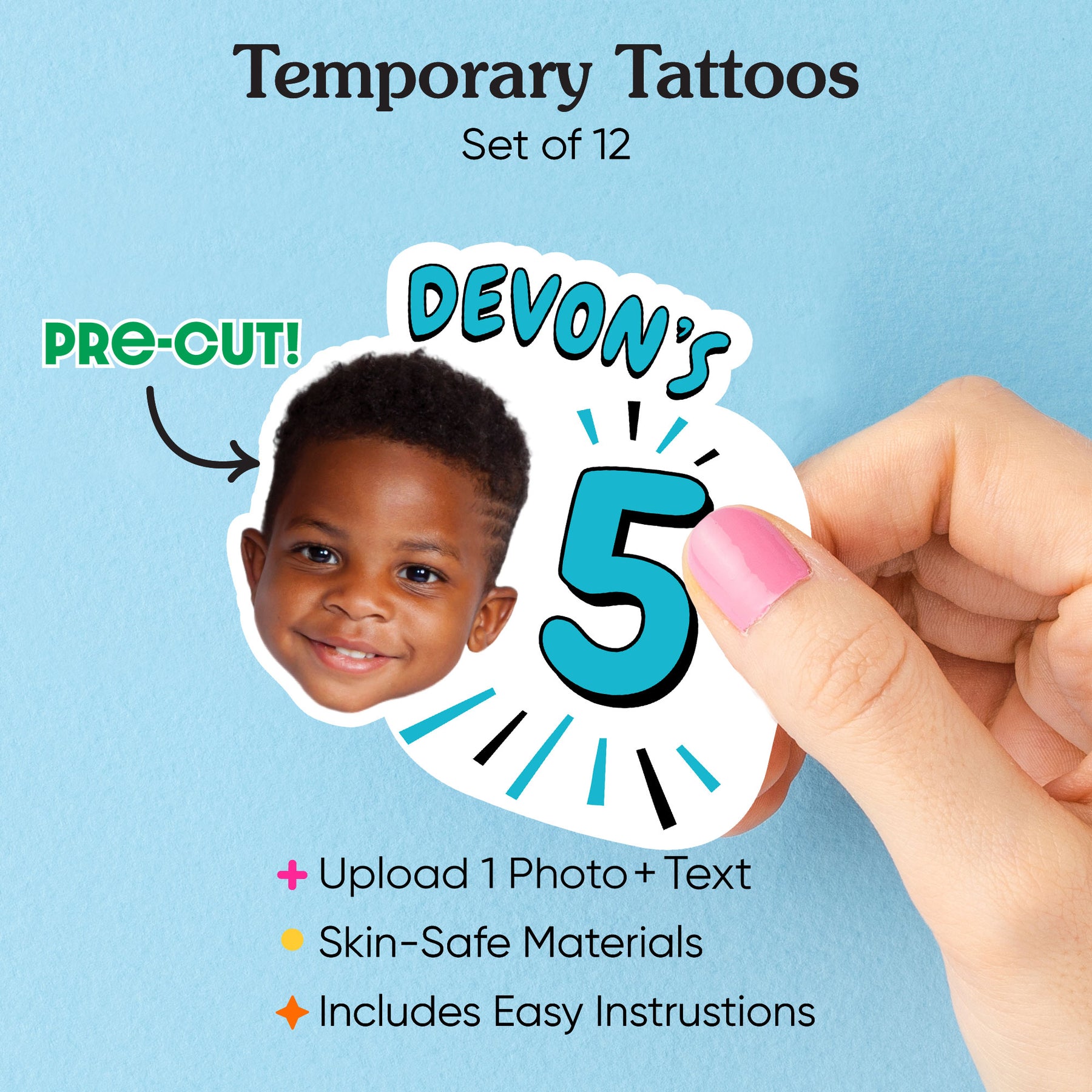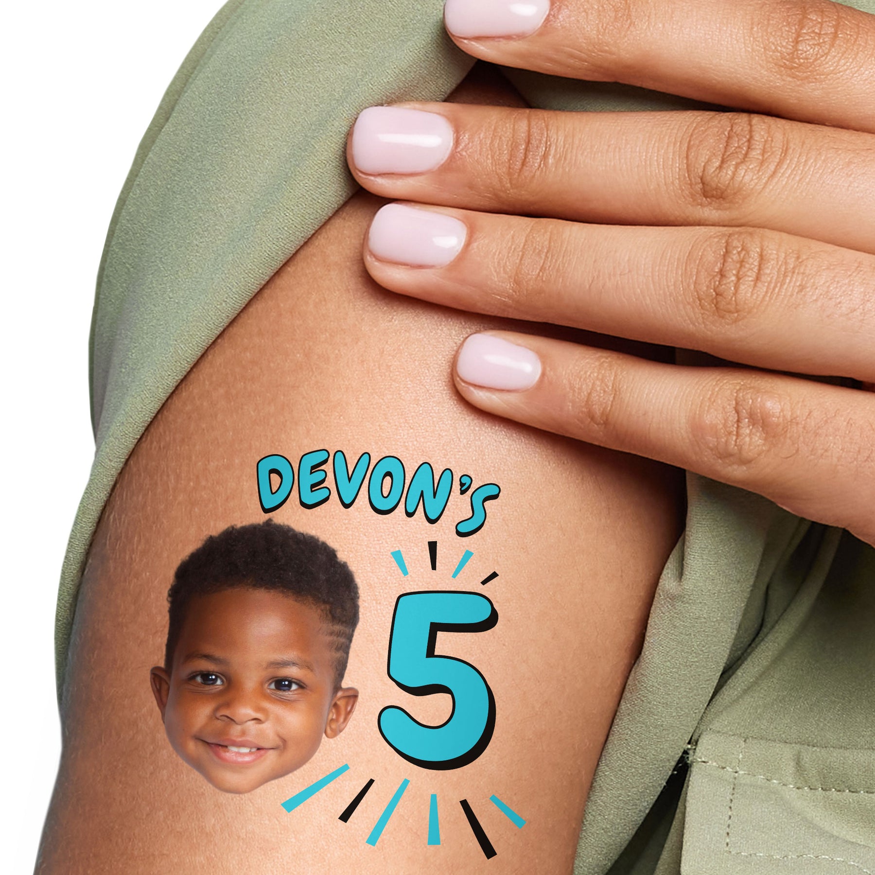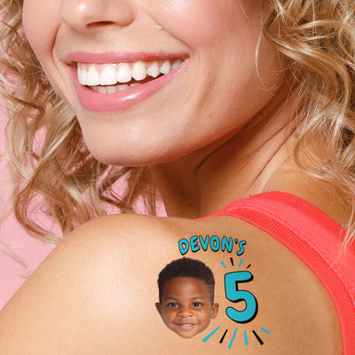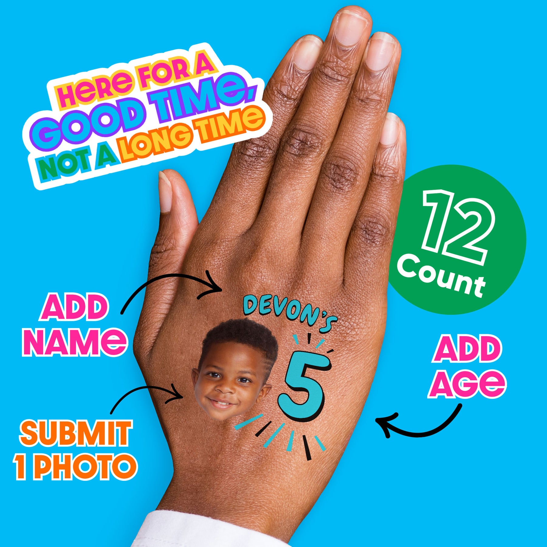 Say hello to our Custom Face Birthday Temporary Tattoos! Featuring your photo and playful blue bubble text with the name and age, these tattoos are a party essential for celebrating the birthday VIP.