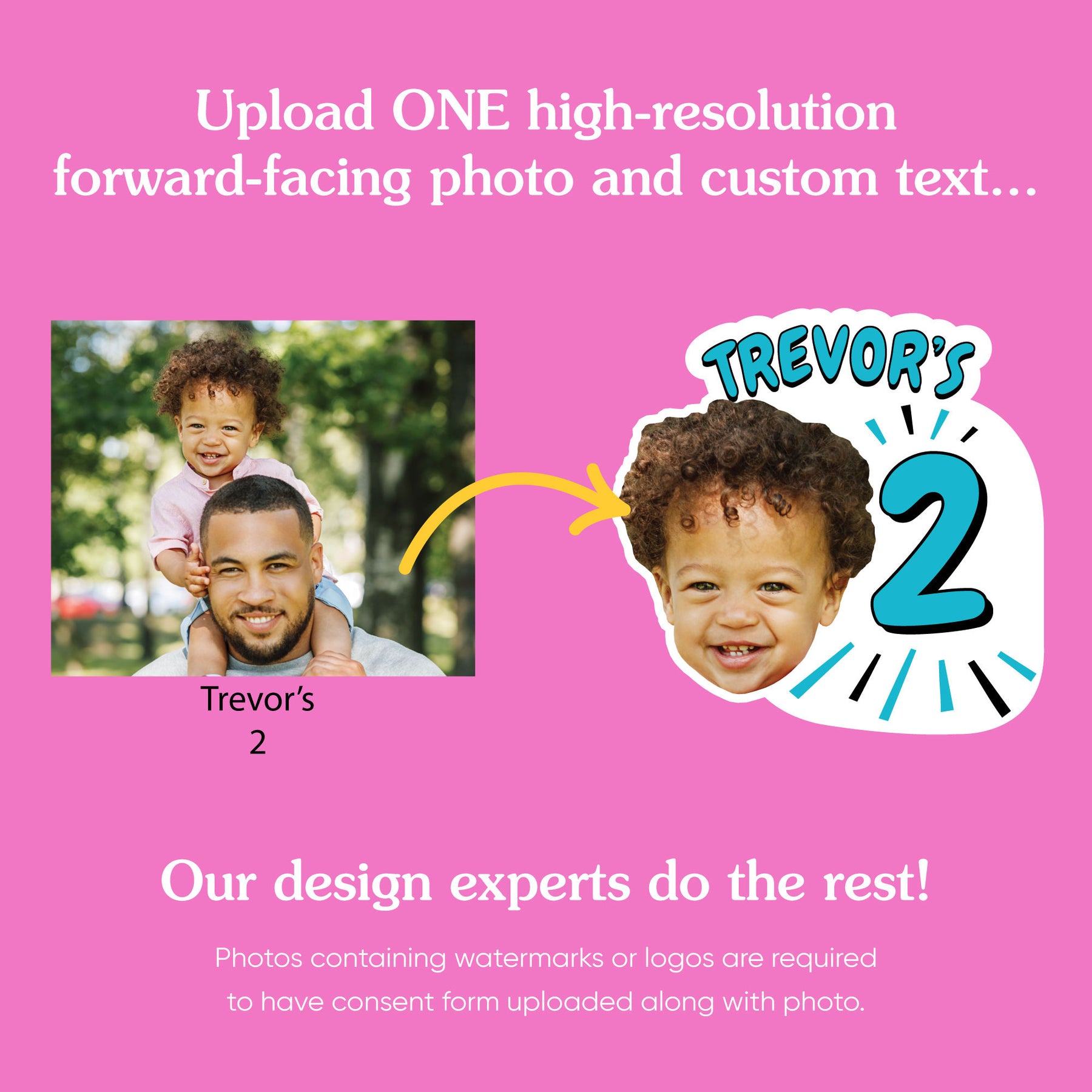 Just upload your fav face, add the name and age (like “Devon’s 2”), and we’ll handle the rest. Easy to apply with a damp cloth and just as easy to remove with baby oil or makeup remover.