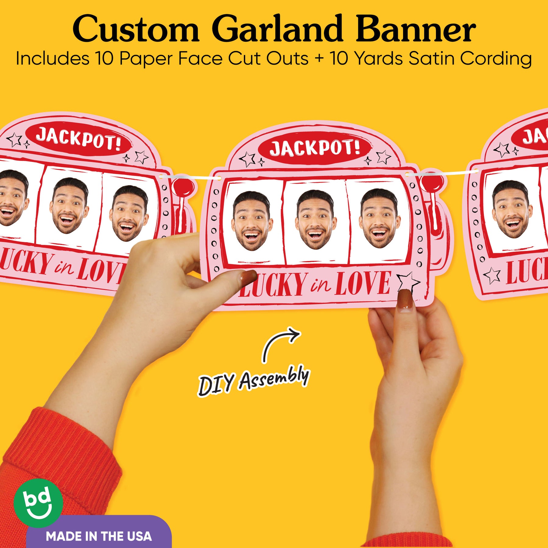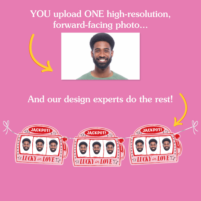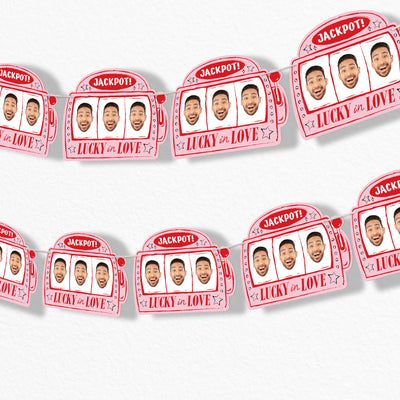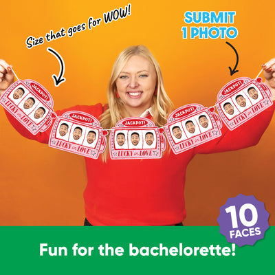 Add a playful, Vegas-inspired touch to your bachelorette party with our Lucky in Love Custom Face Garland Banner! This banner features 10 oversized jackpot slot machine designs- each with a 3 in a row face, and strung on white satin cording for an easy, customizable display. Upload your favorite forward-facing photo, and our designers will create a face-only cutout that’s sure to wow the whole bridal squad.