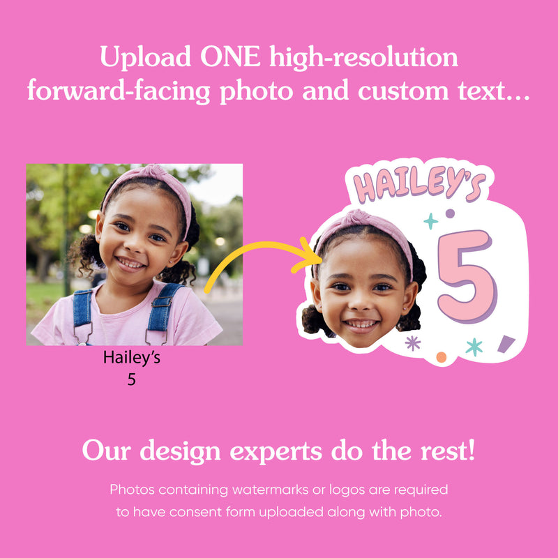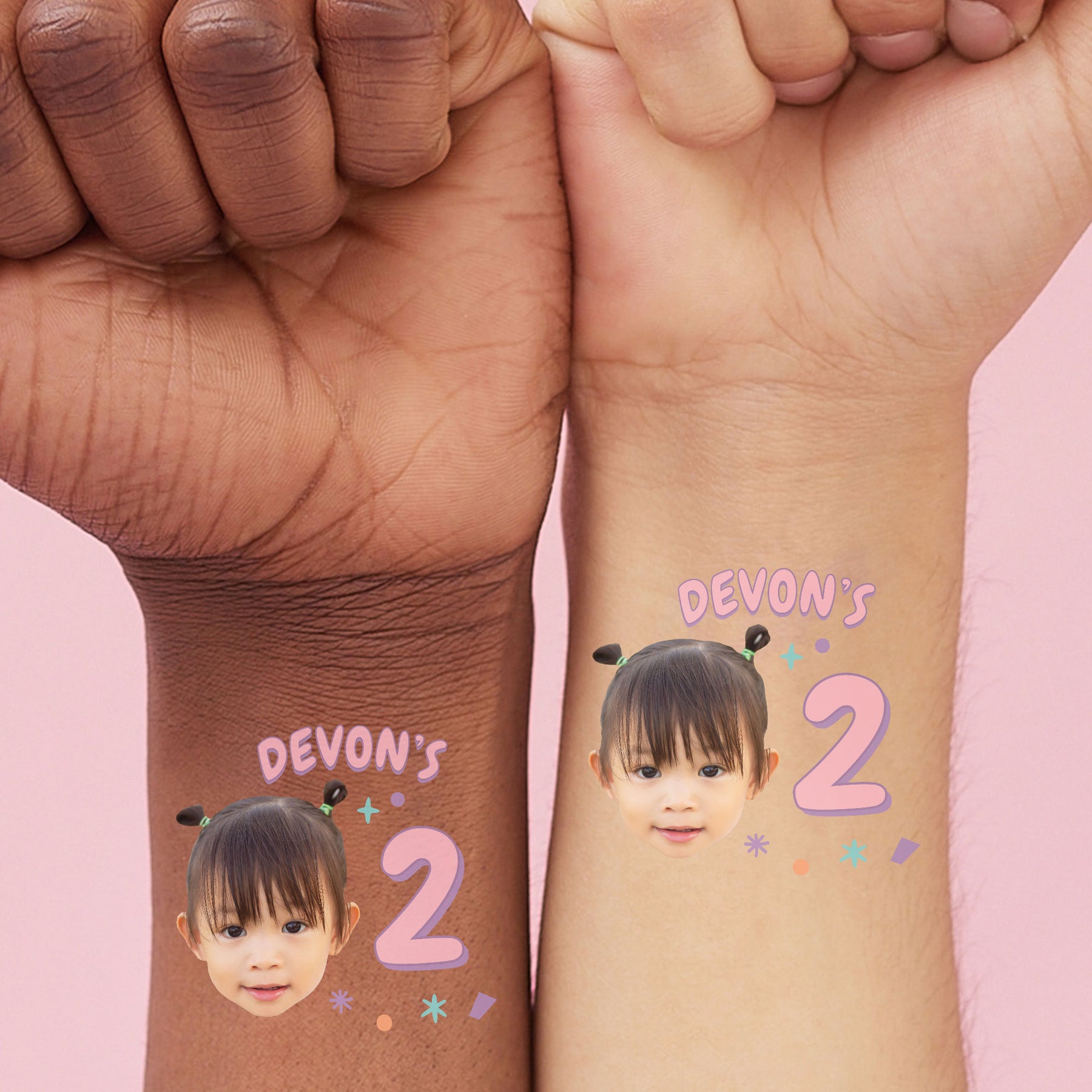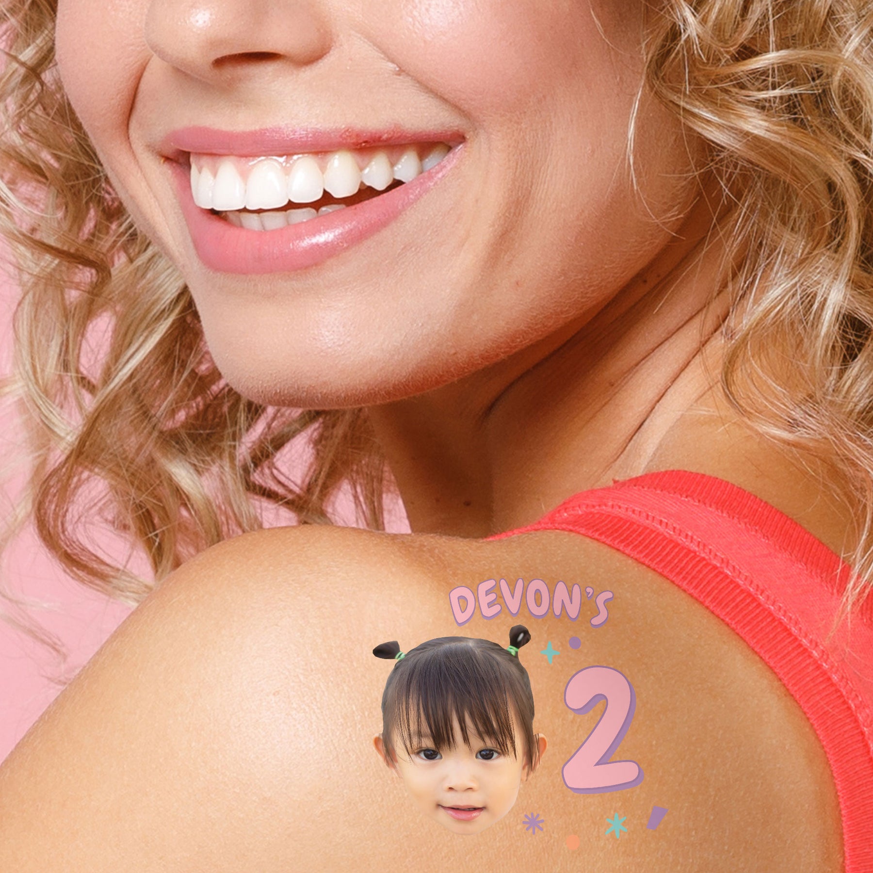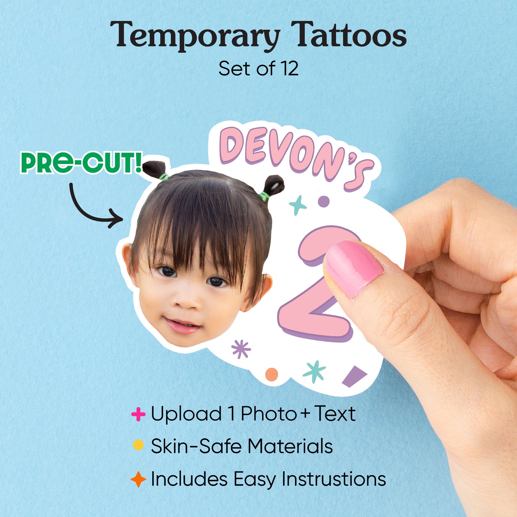 Say hello to our Custom Face Birthday Temporary Tattoos! Featuring your photo and playful pink bubble text with the name and age, these tattoos are a party essential for celebrating the birthday VIP.