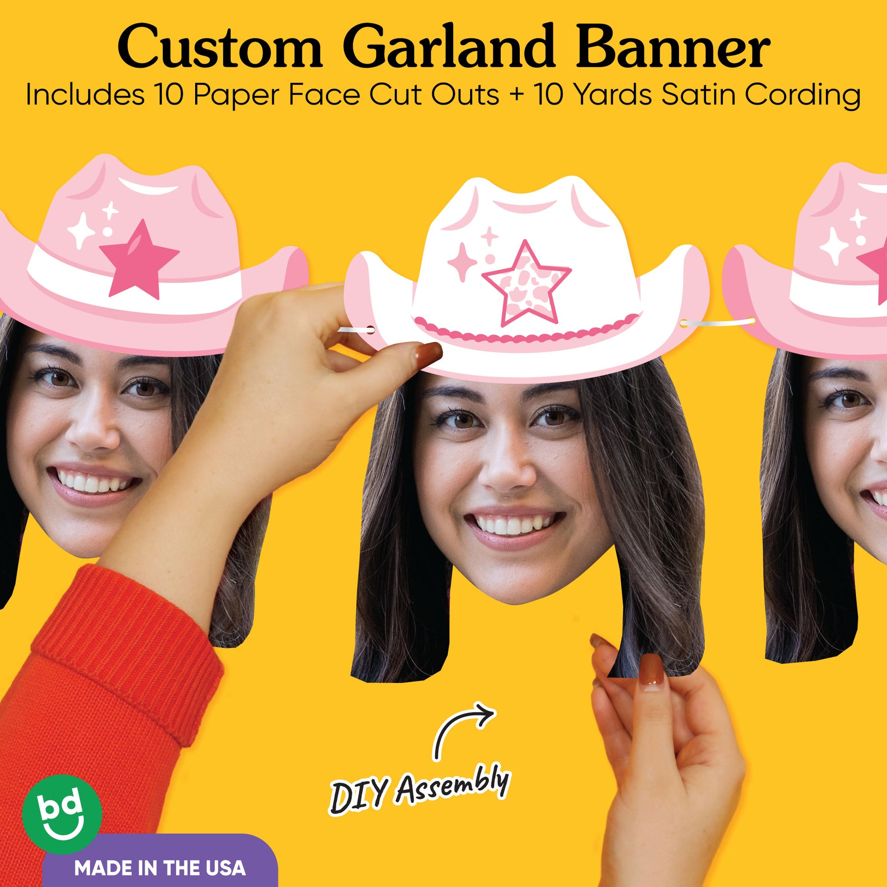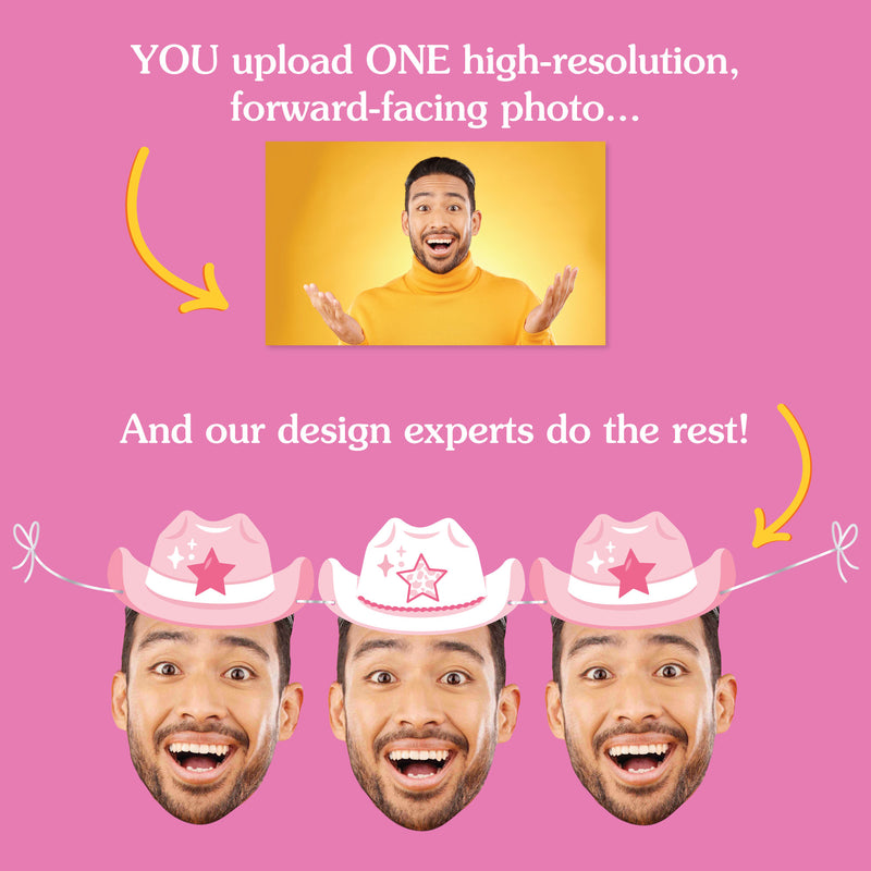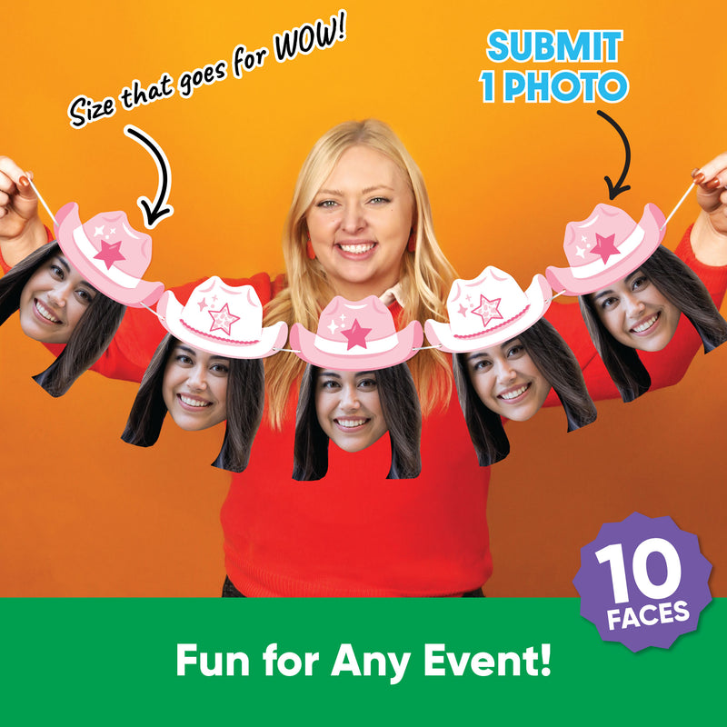 Add a personalized, fun touch to your western-themed party with our Custom Fun Face Garland Banner. This banner features 10 oversized face cutouts with an added-on pink cowgirl hat and white satin cording for a customizable display. Upload your favorite forward-facing photo, and our designers will create a face-only design to wow your guests. Crafted from sturdy cardstock and made in the USA, it’s easy to string up and enjoy. Think beyond the party table! Hang it across a dessert table, drape it as a photo booth backdrop, or use it to greet your guests at the welcome entrance.
