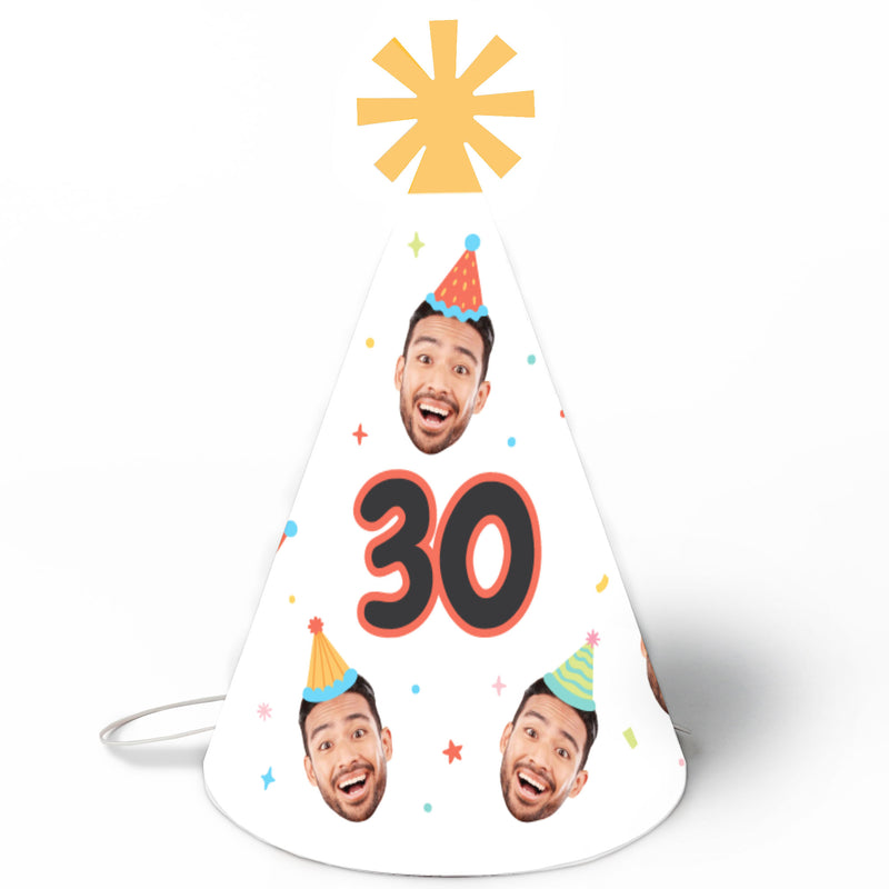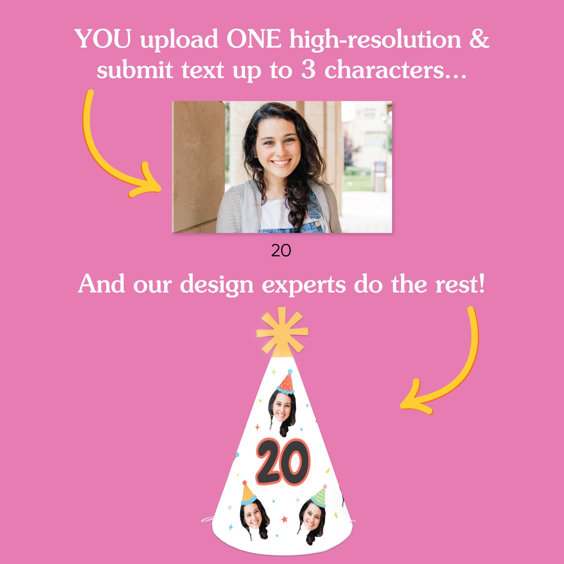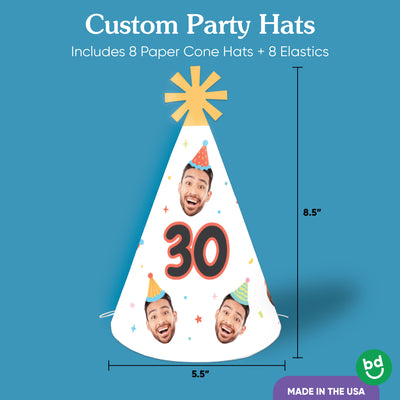 Personalize your party with Custom Fun Face Cone Party Hats! Perfect for a colorful-themed birthday bash. These hilarious hats feature your favorite face with a custom text line to display your birth year for a unique and playful touch. Each set includes 8 professionally printed hats made from sturdy cardstock, designed to fit adults and children alike. Perfect for group photos, fun party decor, or as an unforgettable party favor, these hats are proudly Made in the USA.