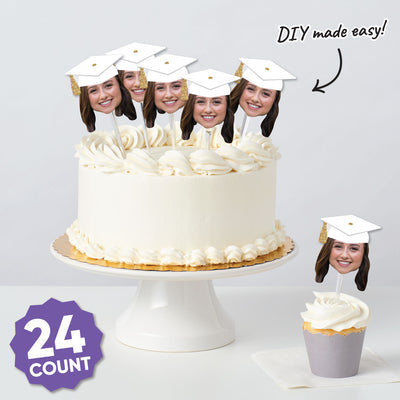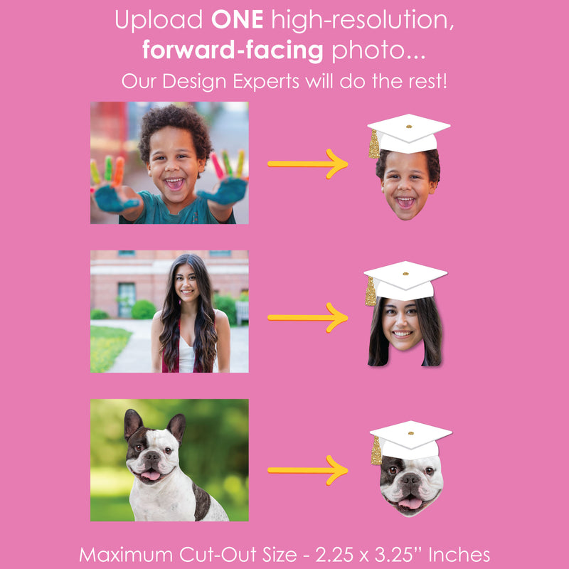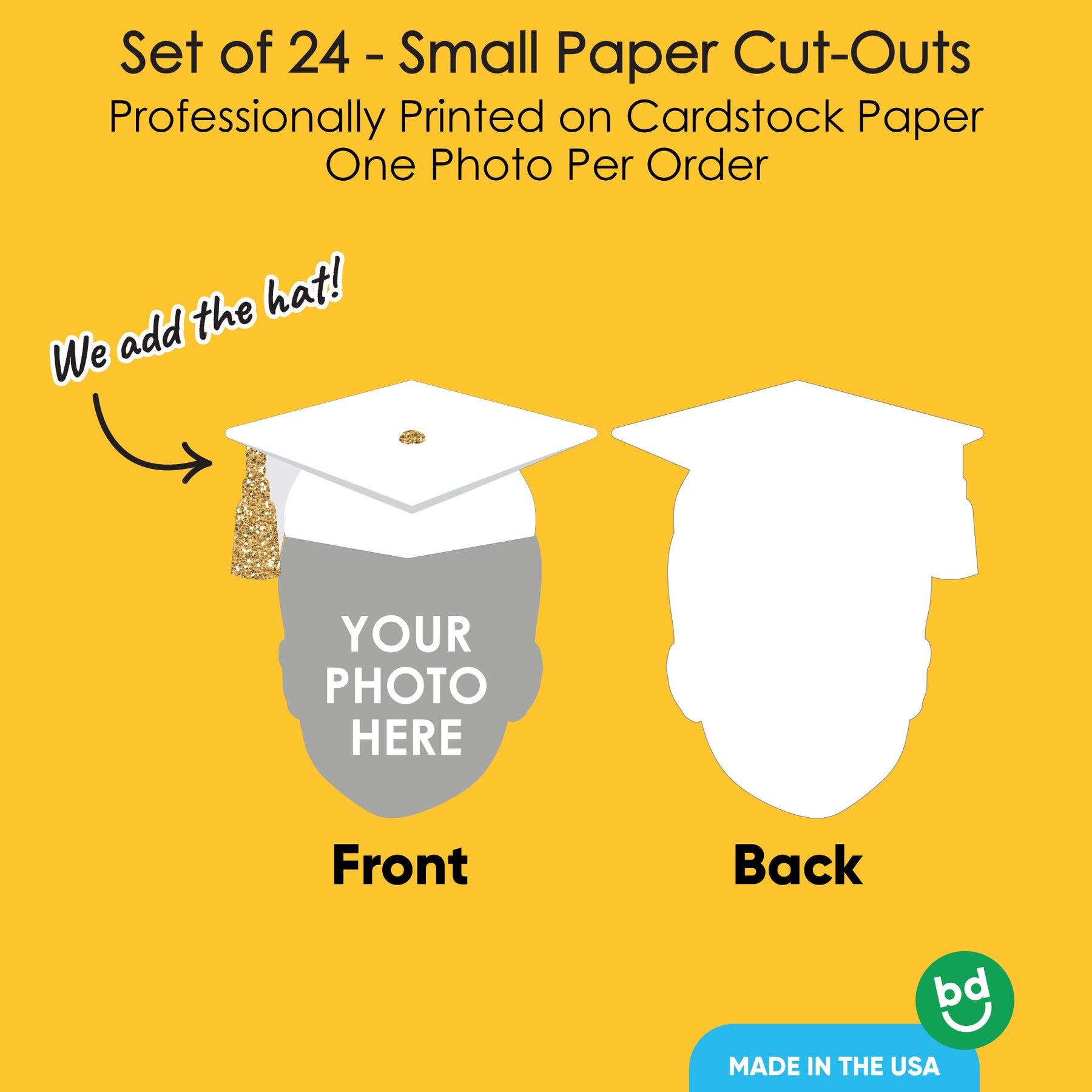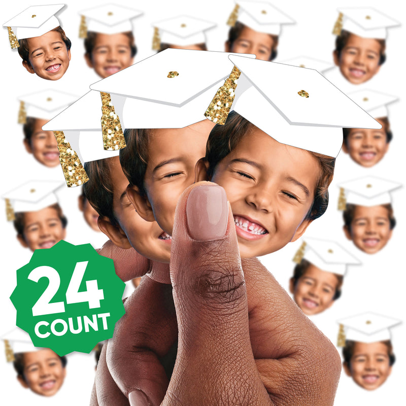 Make the graduate the center of attention with 24 custom Fun Face Cut-Outs - each topped with a white & gold Grad Cap! Perfect for decorating, turning into a garland, or adding some fun to the dessert table, these cutouts bring big laughs to any celebration.
