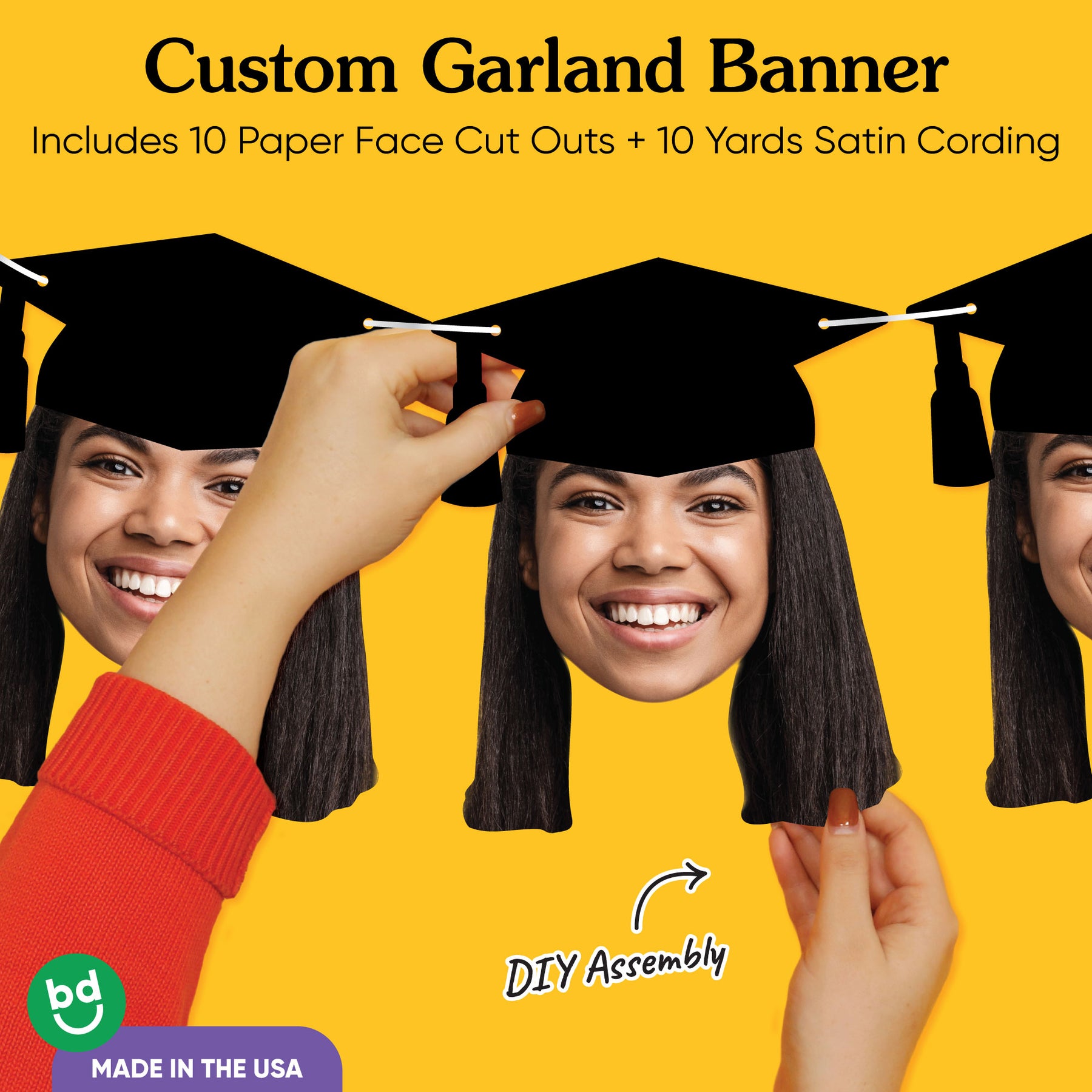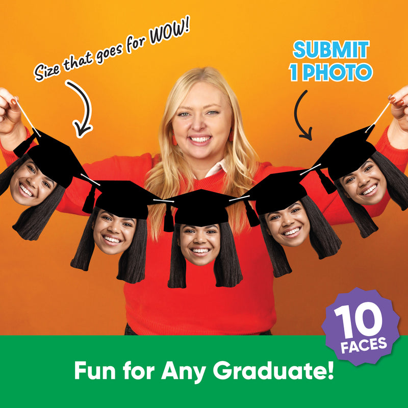 Add a personalized, fun touch to your graduation party with our Custom Fun Face Garland Banner. This banner features 10 oversized face cutouts with an added-on grad cap and white satin cording for a customizable display. Upload your favorite forward-facing photo, and our designers will create a face-only design to wow your guests. Crafted from sturdy cardstock and made in the USA, it’s easy to string up and enjoy. Think beyond the party table! Hang it across a dessert table, drape it as a photo booth backdrop, or use it to greet your guests at the welcome entrance.