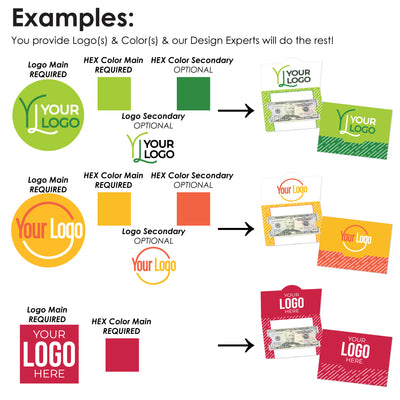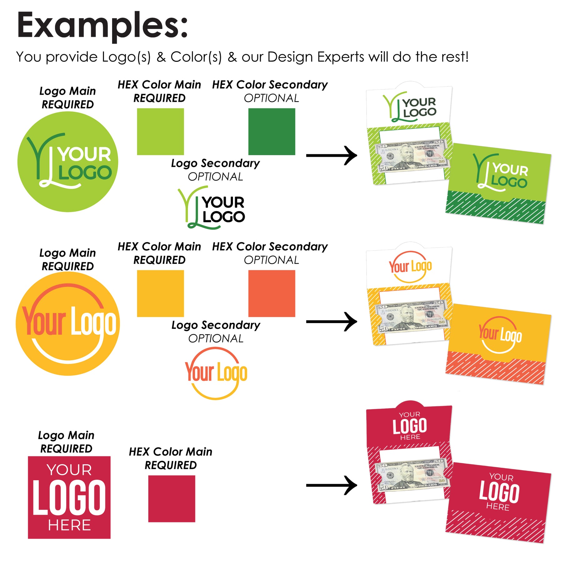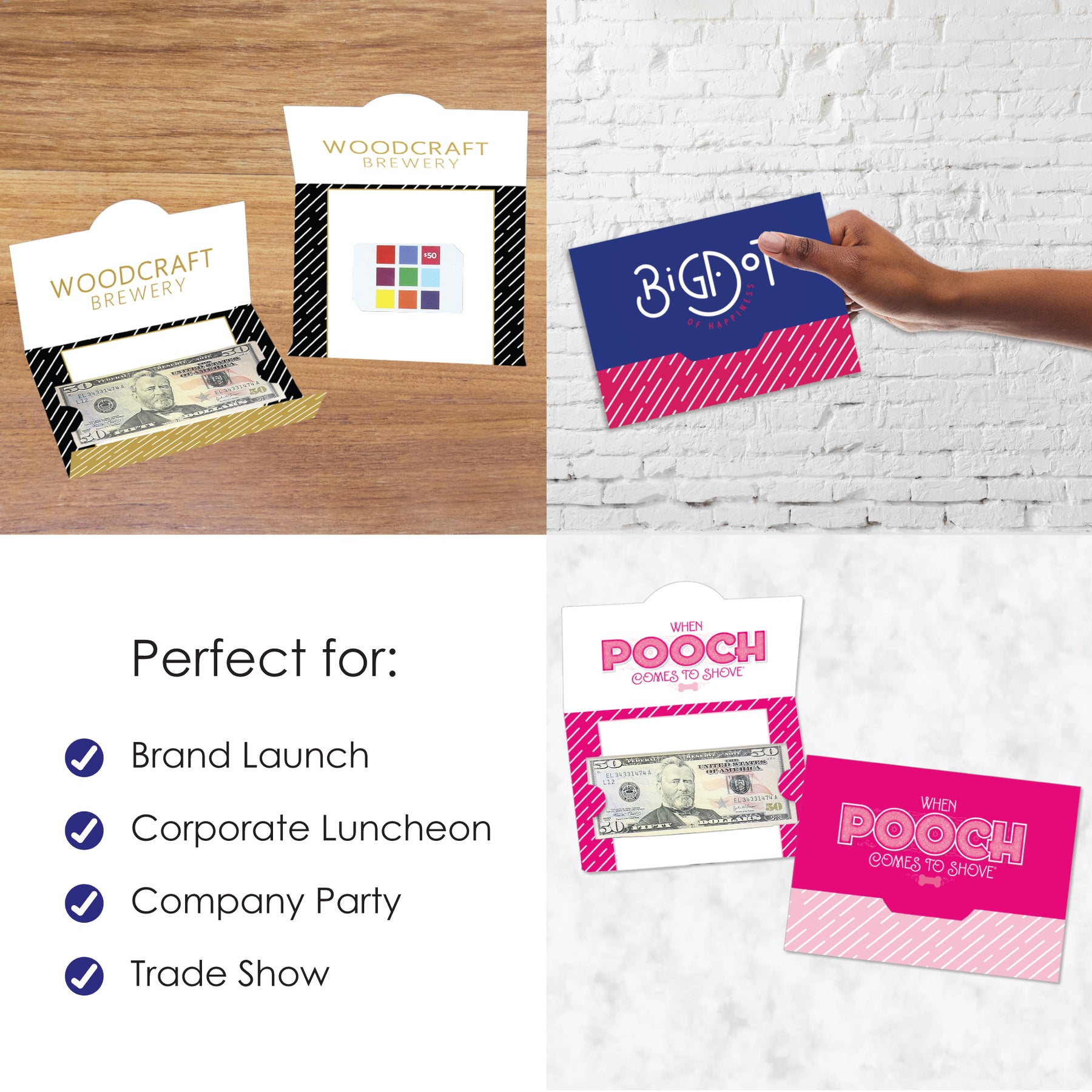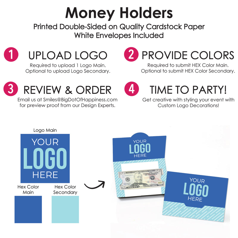 Put your brand front and center when you pass along a surprise that everyone will enjoy with the set of 8 Custom Logo Money Holder Cards! Great for brand launches, corporate gifting, company parties, and trade shows, these personalized cards are a fun and practical way to show you care! Each card is professionally printed double-sided on quality cardstock paper and will arrive ready to use with white envelopes included. Simply use the tabs to hold your money bills, and for a personal touch, handwrite a message in the blank space. Then fold your card, using the slot on the bottom flap to keep the card closed, and place it inside an envelope before presenting it to your recipient. The custom logo money holder cards are a must-have for all your business brand events!