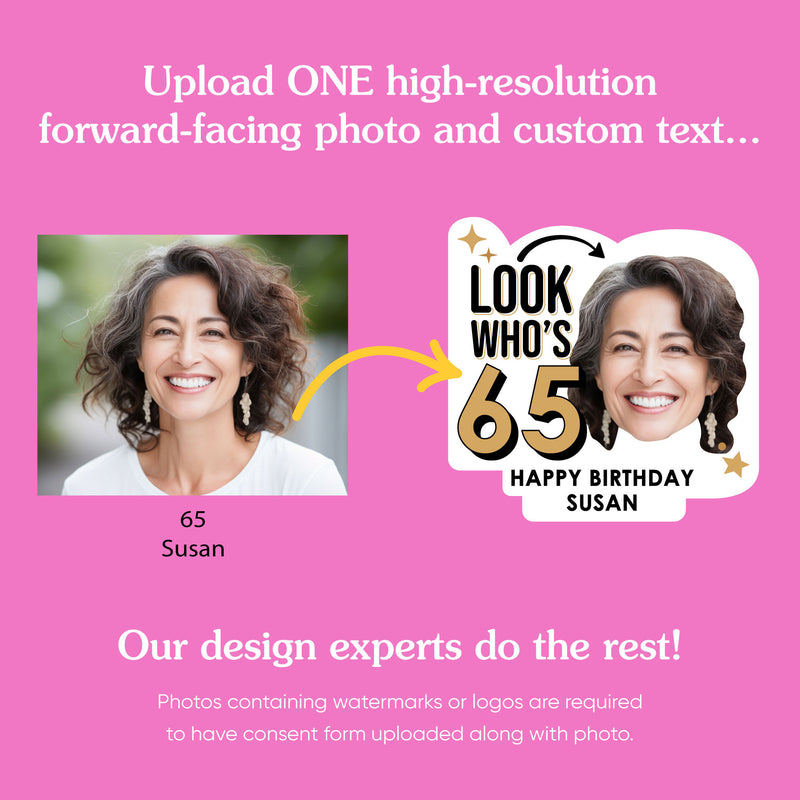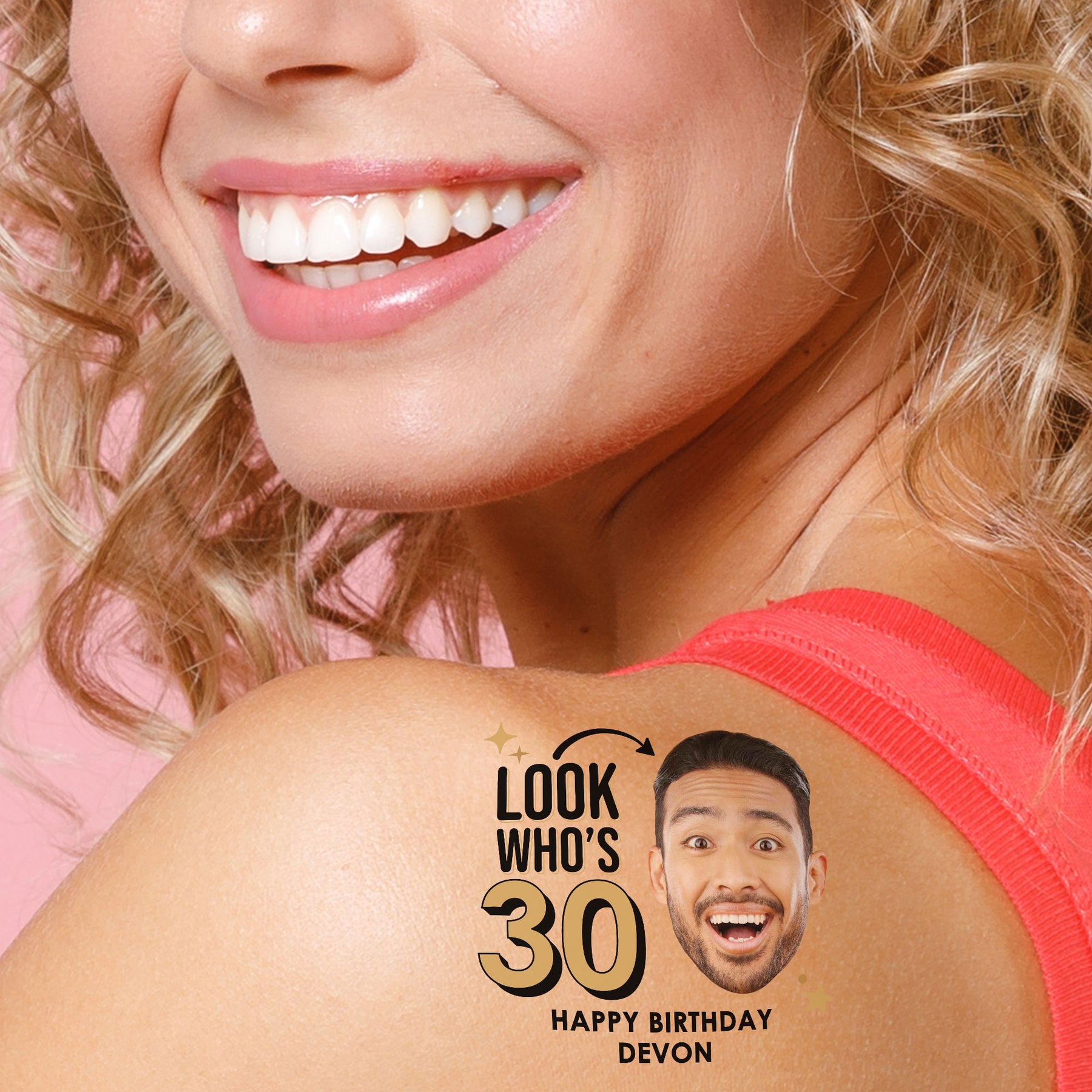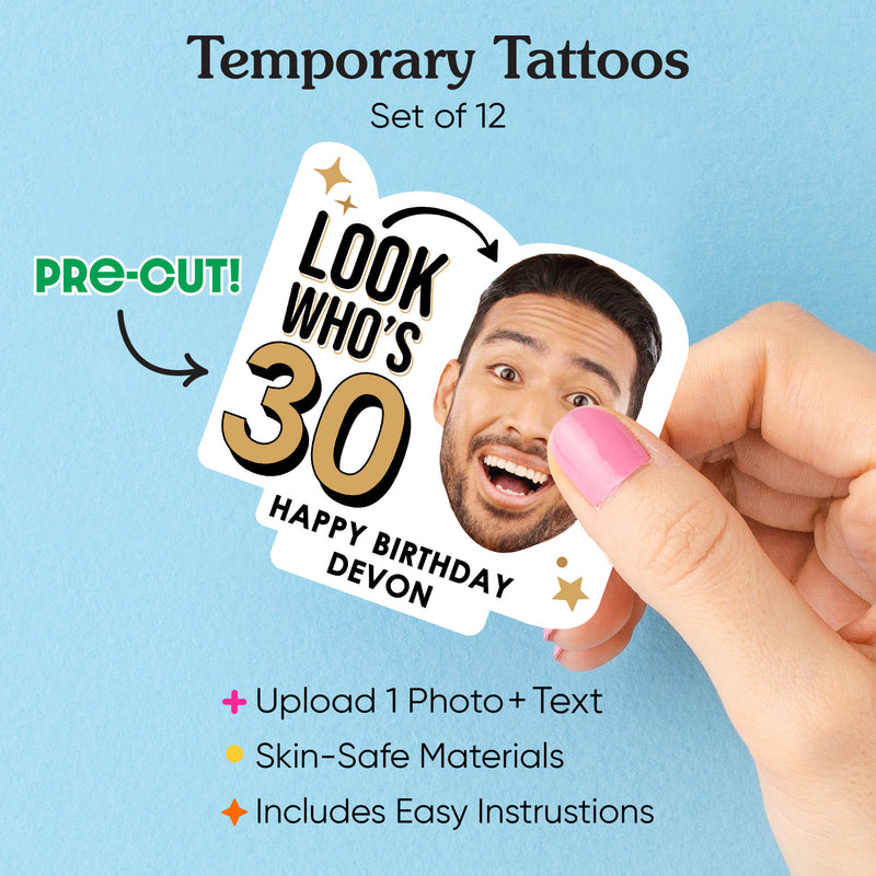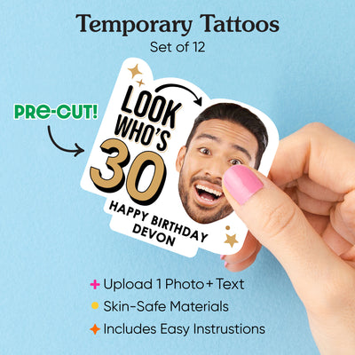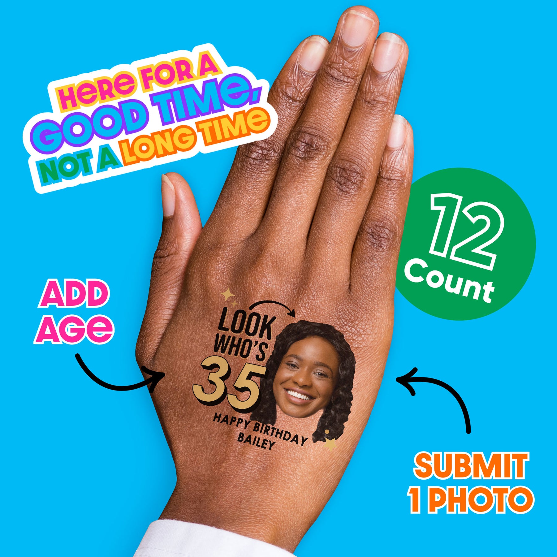 Say hello to our Look Who’s [AGE] Custom Face Tattoos, because no birthday is complete without a little (temporary) ink! These fun tattoos feature the birthday star’s face, the phrase “Look Who’s [AGE]” and a custom line like “Happy Birthday [Name]” to celebrate in personalized style.