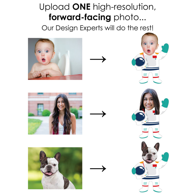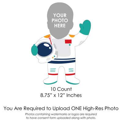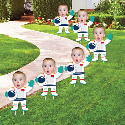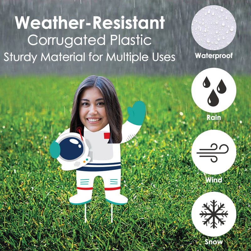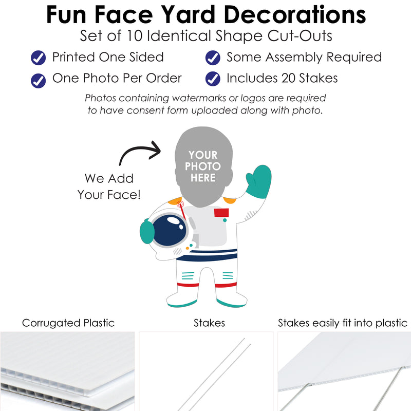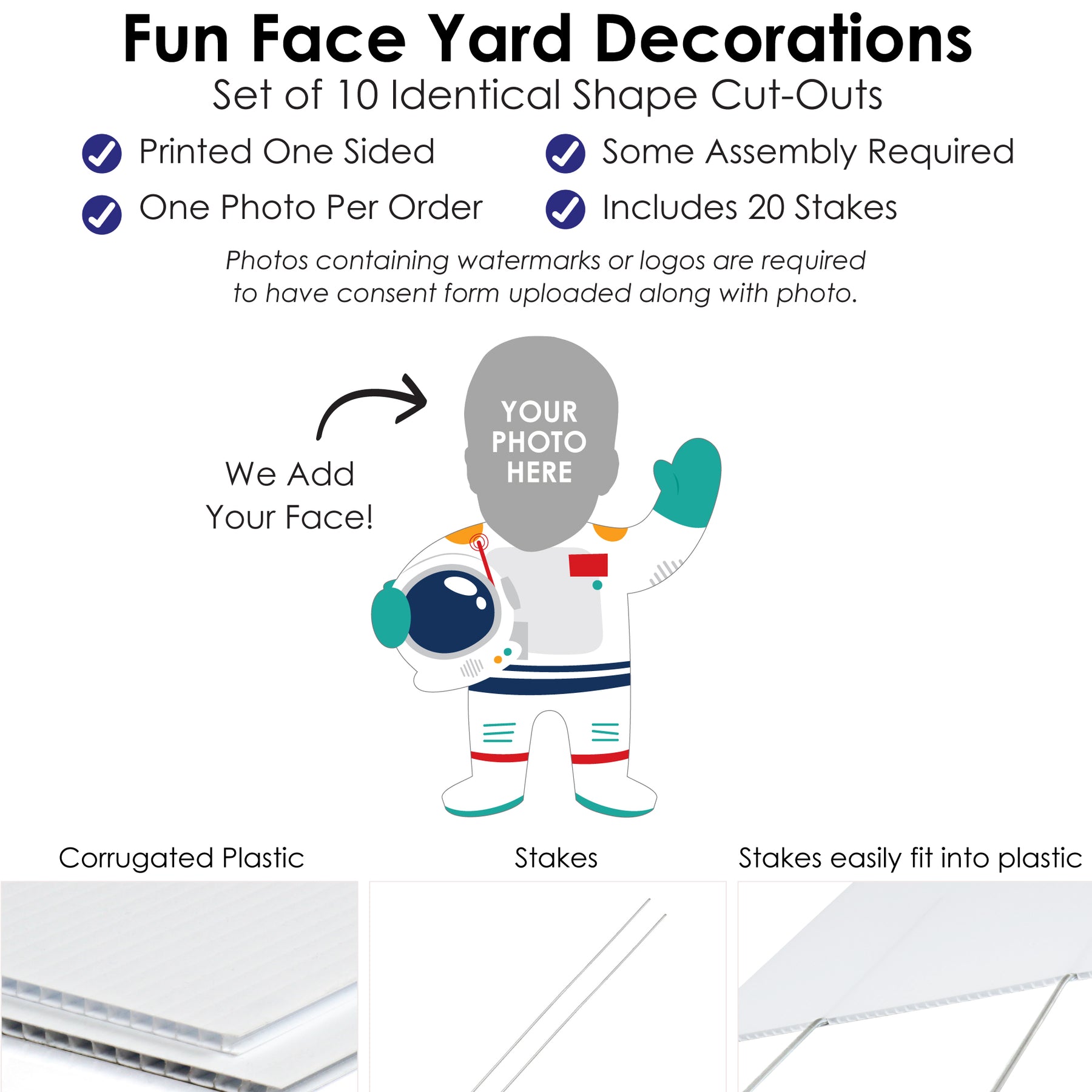 Create an impressive look at your Rocket Ship Birthday Party with the custom Blast Off to Outer Space Fun Face 10-Piece Yard Signs. This outdoor lawn decor set comes with 10 matching custom picture yard signs of ONE face photo cut-out and will have everyone ready for a silly time at your space celebration. A fun and creative way to spotlight the guest of honor, each outdoor shape comes with two stakes, making it easy to display on lawns, driveways, or courtyards. Simply insert the stakes into your yard signs and then firmly press them into the ground. Blast Off to Outer Space yard signs are professionally printed on corrugated plastic, making them waterproof and weather resistant. They are perfect for short-term display but can be used multiple times with proper care. Alternatively, the yard signs can be displayed on a wall when you use your own wall mounts and are the perfect memory keepsakes after the party is over. Make a lasting impression when you display the custom astronaut photo yard signs.