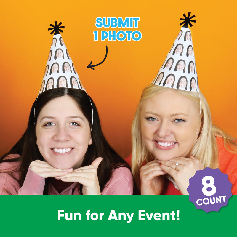 Personalize your party with Custom Fun Face Cone Party Hats! Whether it’s a first birthday, milestone celebration, or bachelorette bash, these hilarious hats feature your favorite face with a black starburst design for a unique and playful touch. Each set includes 8 professionally printed hats made from sturdy cardstock, designed to fit adults and children alike. Perfect for group photos, fun party decor, or as an unforgettable party favor, these hats are proudly Made in the USA.