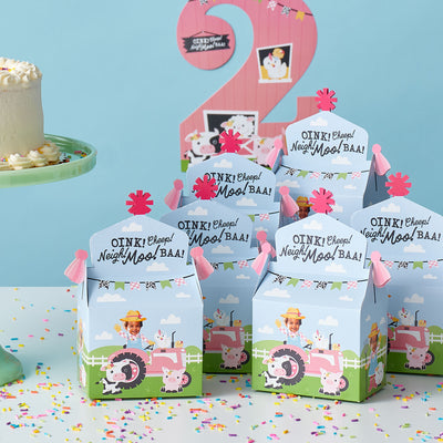 Prepare a splendid surprise for your Birthday Party guests with the Girl Farm Animals Fun Face Gable Boxes. Coming in a set of 12, these DIY party favor boxes will feature ONE custom photo face cutout that will surely be a hit at your celebration! Fill your barnyard gable boxes with all sorts of goodies like sweet treats, non-edible swag bag items, and small party trinkets that will delight your guests. Professionally printed double-sided on cardstock paper, the Girl Farm Animals gable party boxes will arrive flat with some easy assembly required. Each custom picture gable party box has a closed top, creating extra excitement for partygoers. Display the personalized treat boxes at your dessert table for all to grab or surprise your guests by handing them out at the end of your celebration! Make your party unforgettable when you use the fun and quirky famers gable boxes!