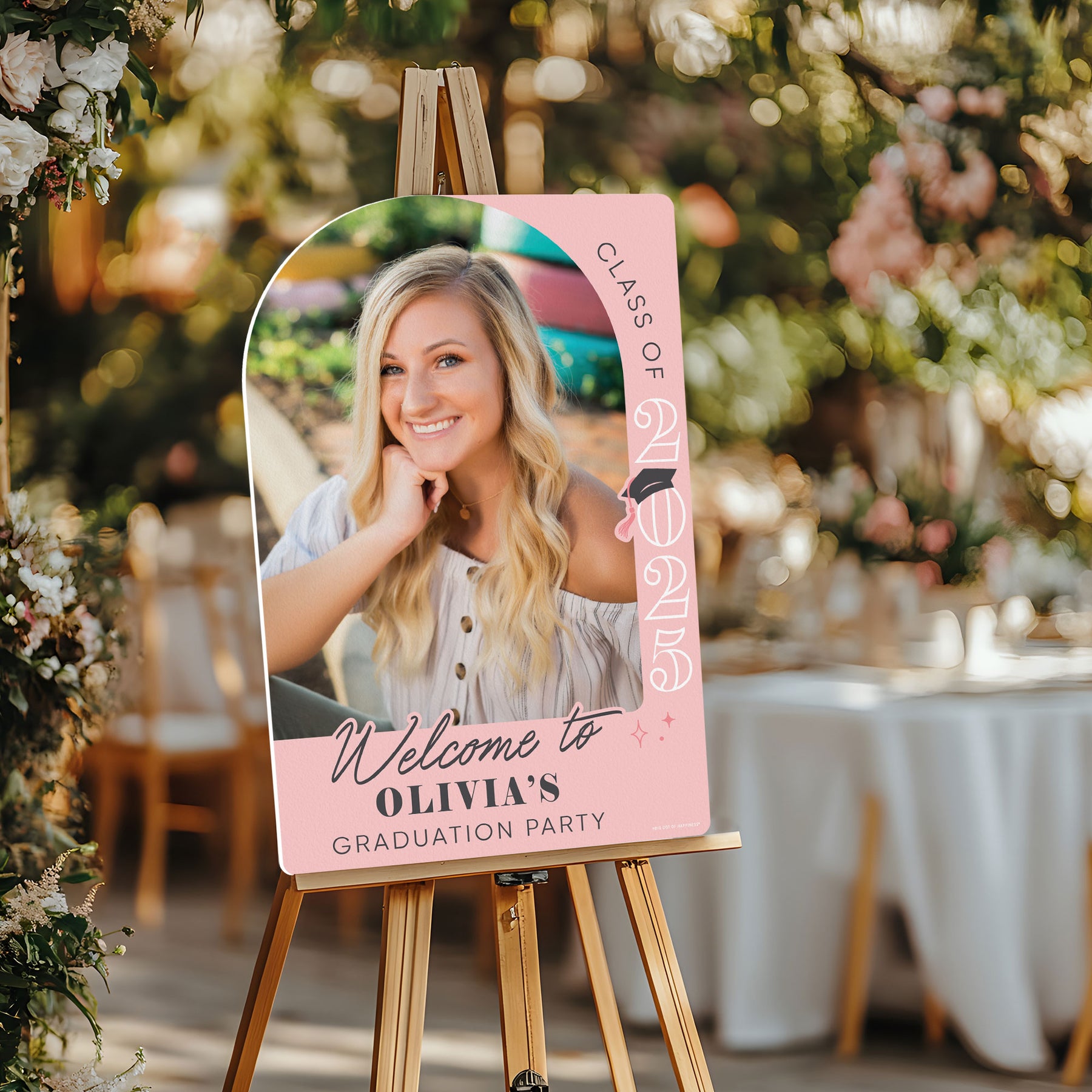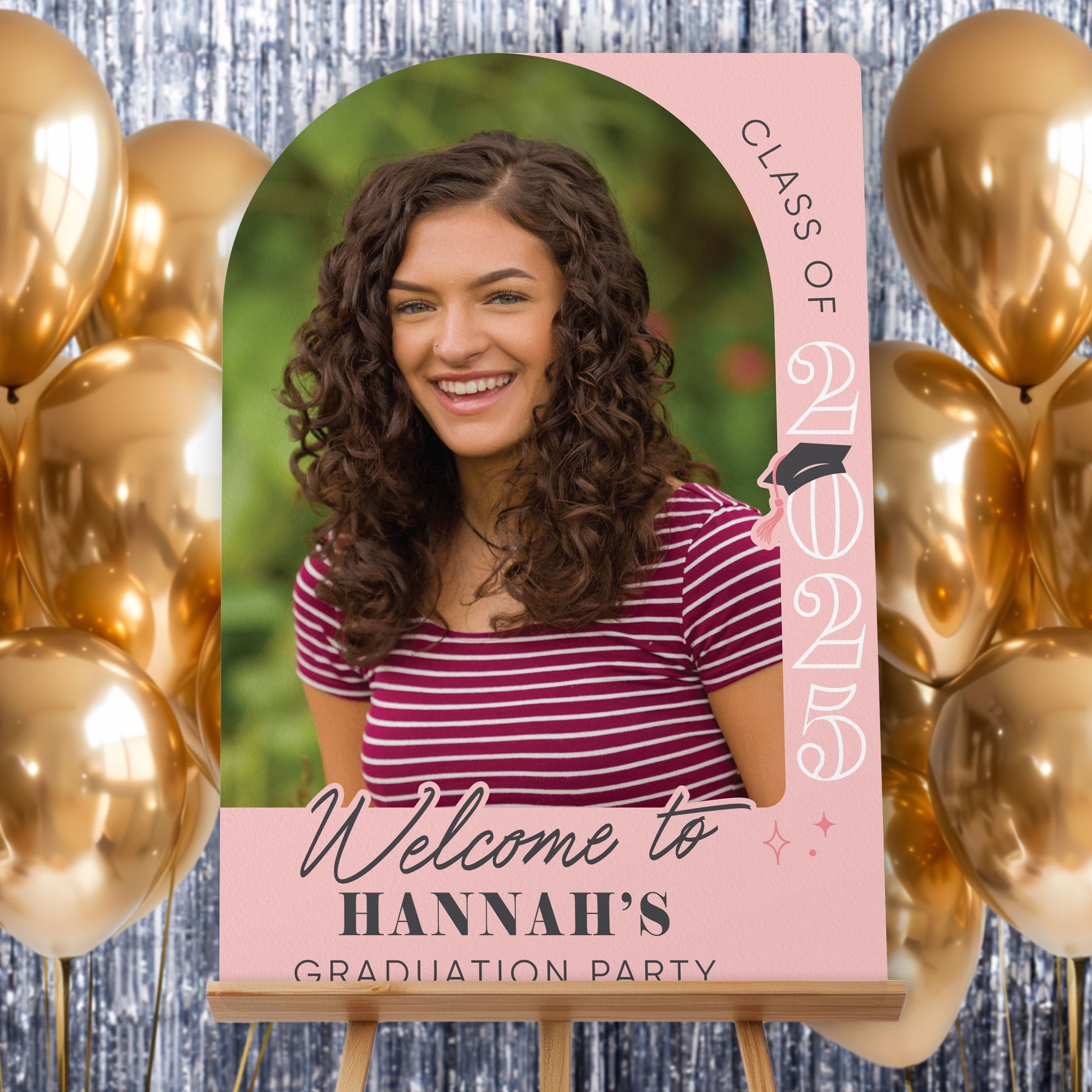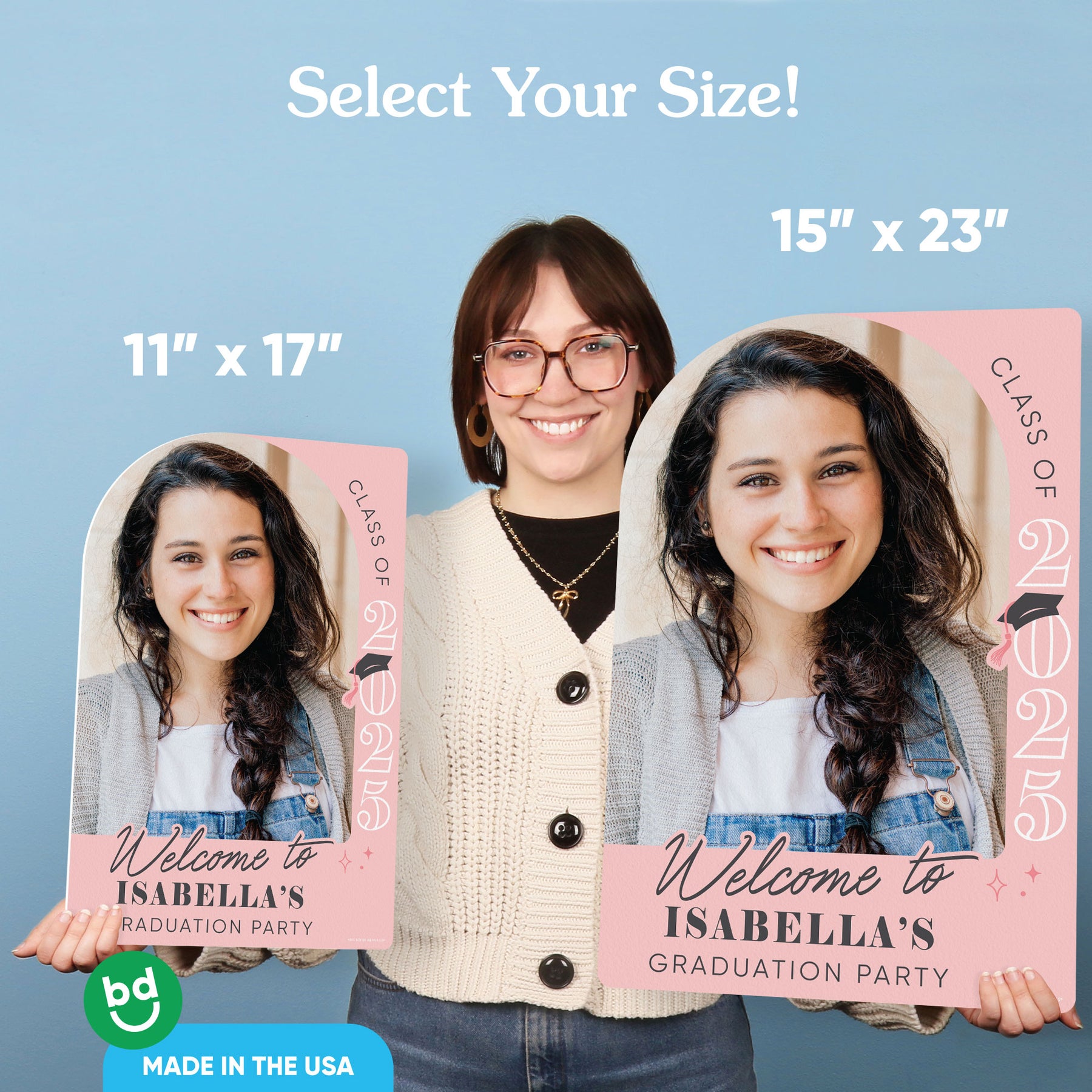 Welcome your graduate in style with our Custom Photo Rose Gold Graduation Welcome Sign—a unique way to celebrate their achievements! Designed to showcase their personality, this sign features a high-resolution photo and a customizable name. Available in two sizes—11x17 inches or 15x23 inches—so you can pick the perfect fit for your celebration.