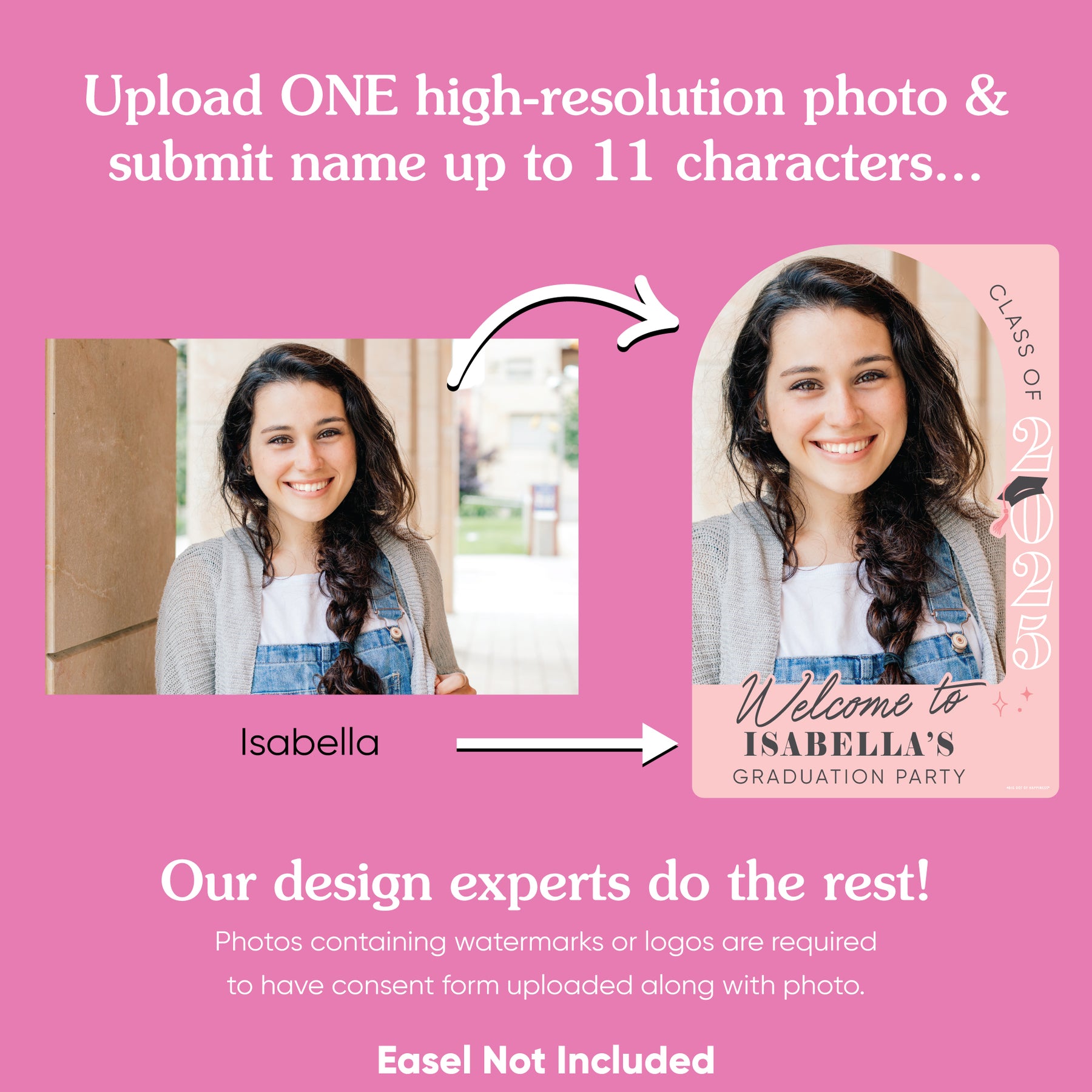• Custom Photo: Upload one high-quality image—a senior portrait, cap-and-gown photo, or a favorite childhood candid—to make this sign truly personal. • Custom Name: Add the graduate’s name (up to 11 characters; our designers will add the 's).
