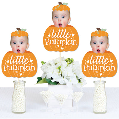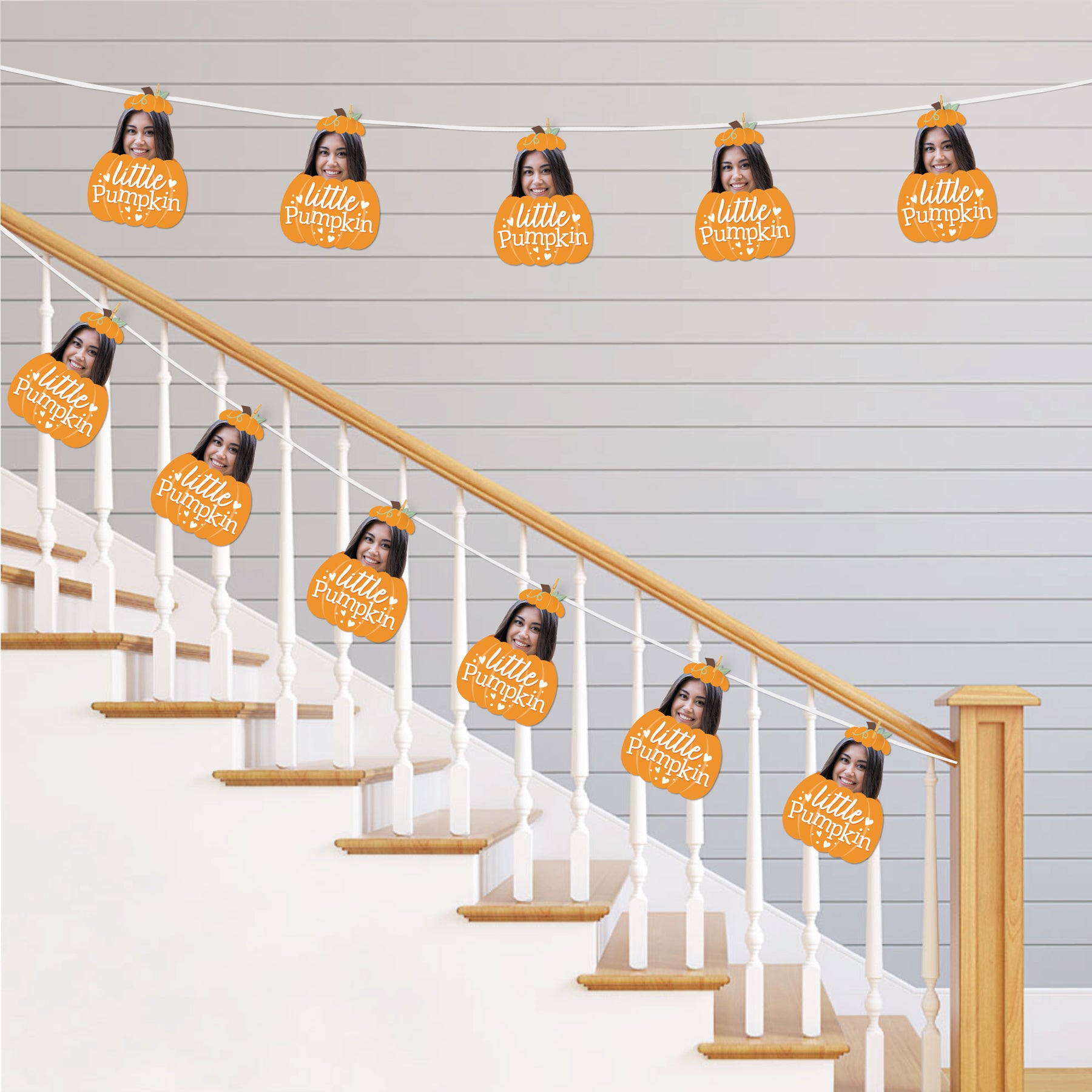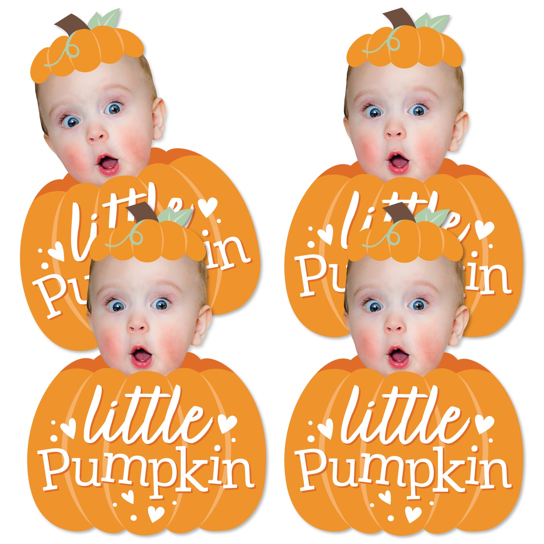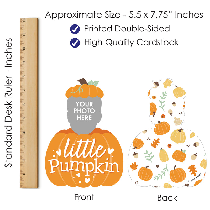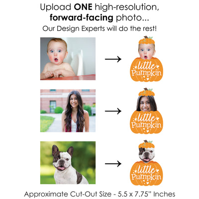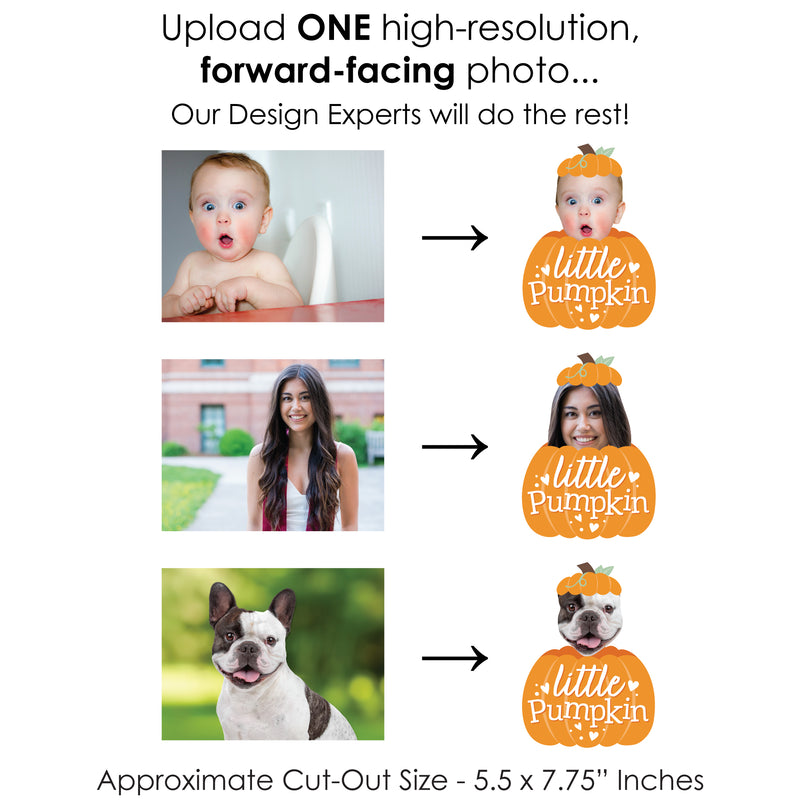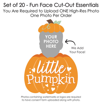 Get creative when you decorate with the set of 20 custom Little Pumpkin Fun Face Essentials. The perfect way to spotlight your guest of honor, these custom paper shapes will feature ONE face photo on pumpkin designs that will transform your Birthday Party into an unforgettable celebration! Professionally printed double-sided on cardstock paper, the customized Little Pumpkin cutouts are a versatile DIY party decoration that will have you ready to unleash your creativity. You can scatter the fall large shaped cut-outs throughout your venue, hang them in a garland banner, or use them as eye-catching centerpieces for a unique tablescape. The face cutouts will make a statement however you choose to use them! Have fun decorating when you honor your family member, friend, or beloved pet with these fun and quirky custom fall pumpkin face essential cutouts.