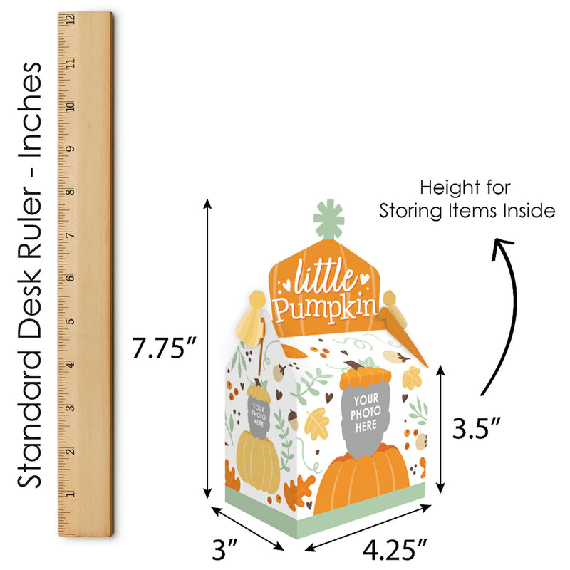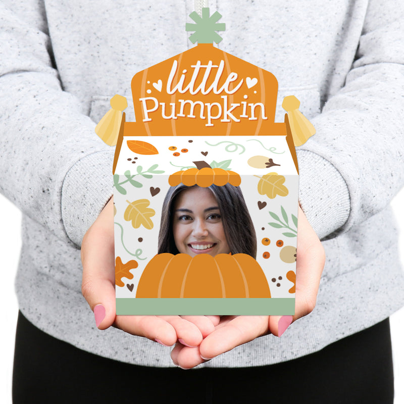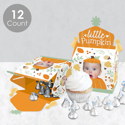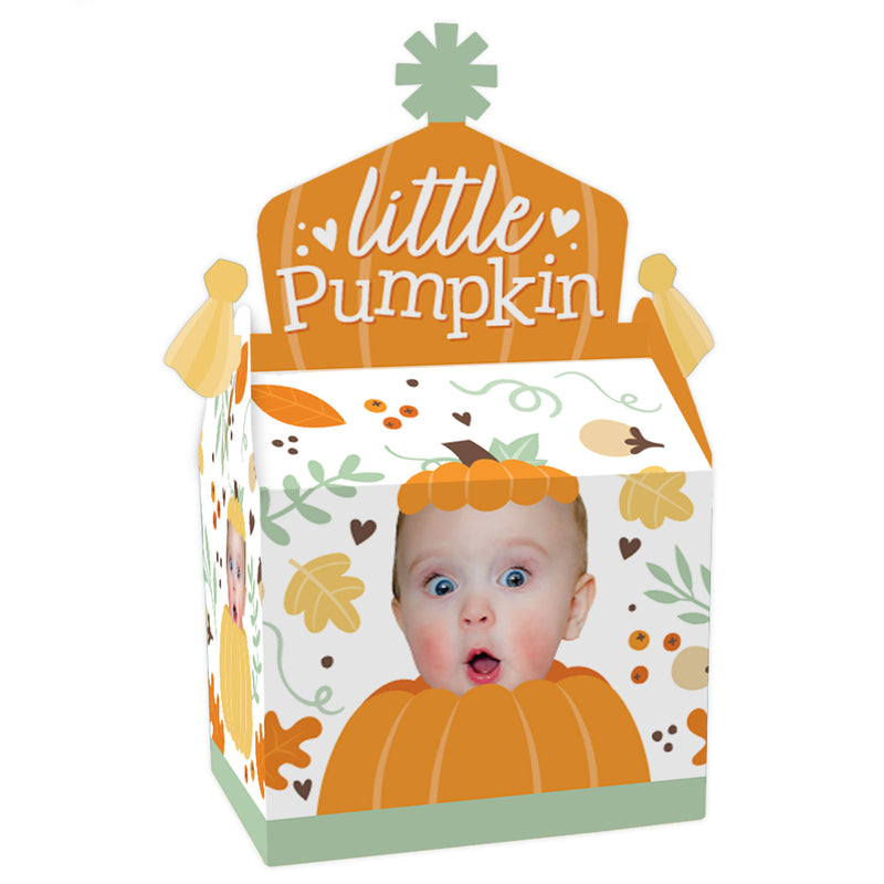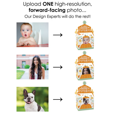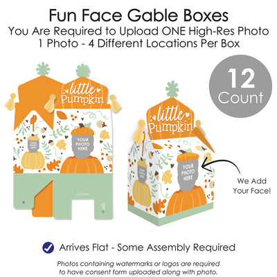 Prepare a splendid surprise for your Fall Birthday Party guests with the Little Pumpkin Fun Face Gable Boxes. Coming in a set of 12, these DIY party favor boxes will feature ONE custom photo face cutout that will surely be a hit at your celebration! Fill your pumpkin gable boxes with all sorts of goodies like sweet treats, non-edible swag bag items, and small party trinkets that will delight your guests. Professionally printed double-sided on cardstock paper, the Little Pumpkin gable party boxes will arrive flat with some easy assembly required. Each custom picture gable party box has a closed top, creating extra excitement for partygoers. Display the personalized treat boxes at your dessert table for all to grab or surprise your guests by handing them out at the end of your celebration! Make your party unforgettable when you use the fun and quirky fall gable boxes!