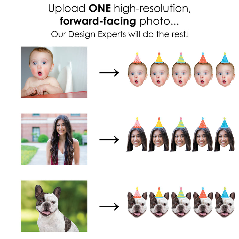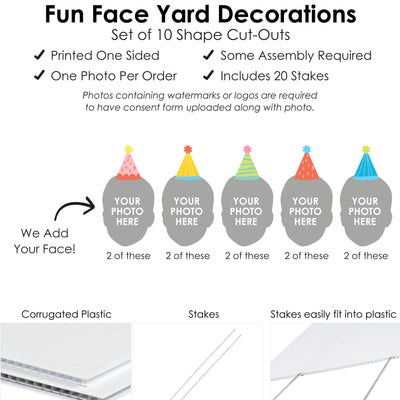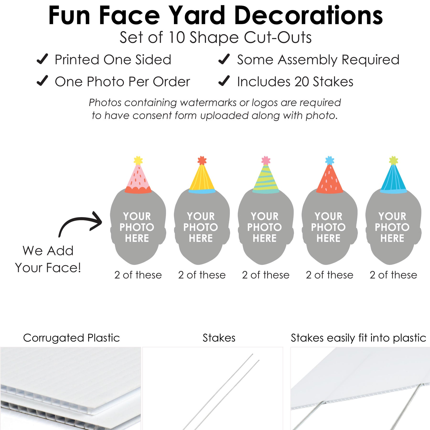 Get the party started before guests even walk in with our Custom Face Yard Signs! This hilarious set of 10 custom photo cut-outs features one face of your choice, each topped with a bright and colorful party hat for extra celebration energy.