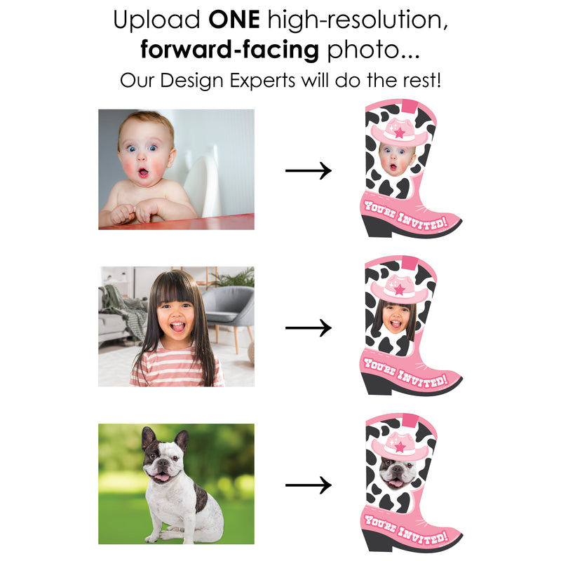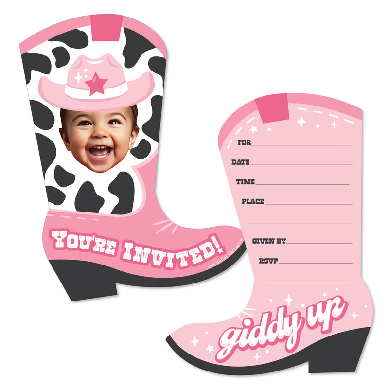 Build excitement for your upcoming Cowgirl 1st Birthday Party with the Pink First Rodeo Fun Face Shaped Invites! These fun and quirky invitation cards come in a set of 12 with white envelopes included and will feature ONE custom picture face cut-out. Professionally printed double-sided on high-quality cardstock paper, the Cowboy boot cards come with a photo-like shine on the front and a matte finish on the back, making it easy to handwrite all your party information. Enclose the invites in an envelope and then you can either hand-deliver the invitations or send the invites via snail mail. Your recipients will be delighted when they receive their Pink First Rodeo party stationery and can also keep the invite card as a fun photo keepsake! Make your celebration extra special when you prepare for your party with the pink western custom photo invitation set!