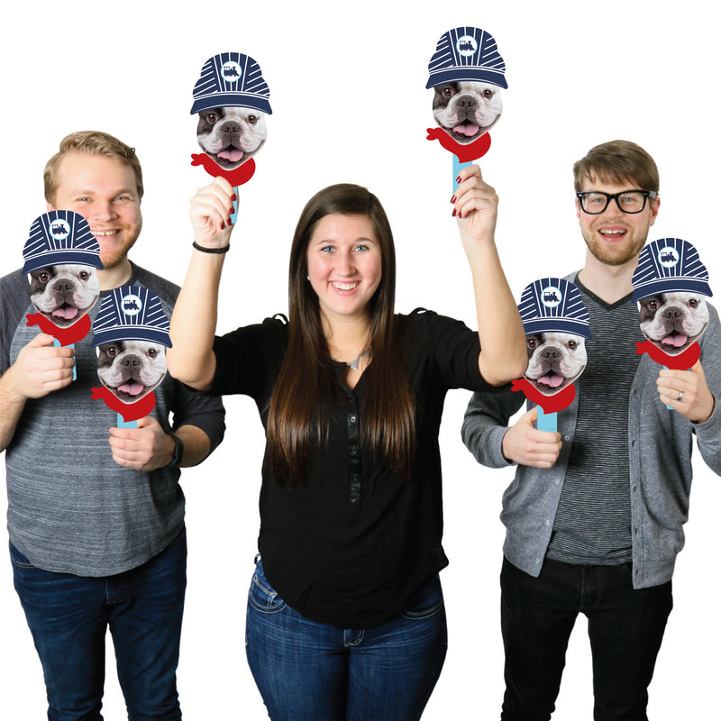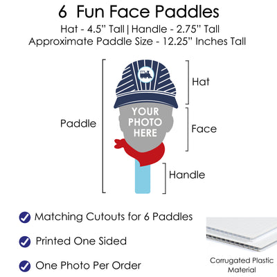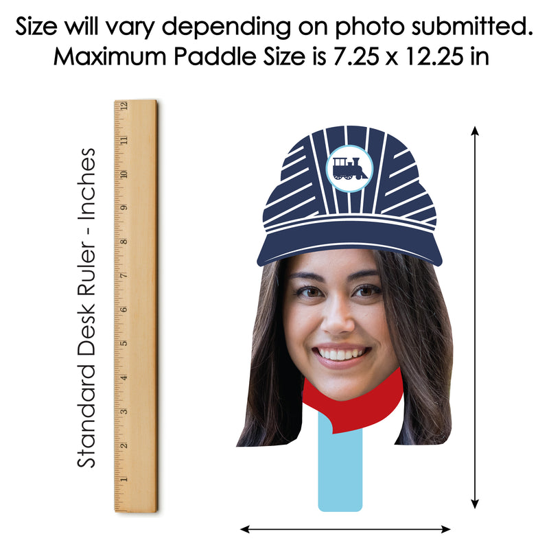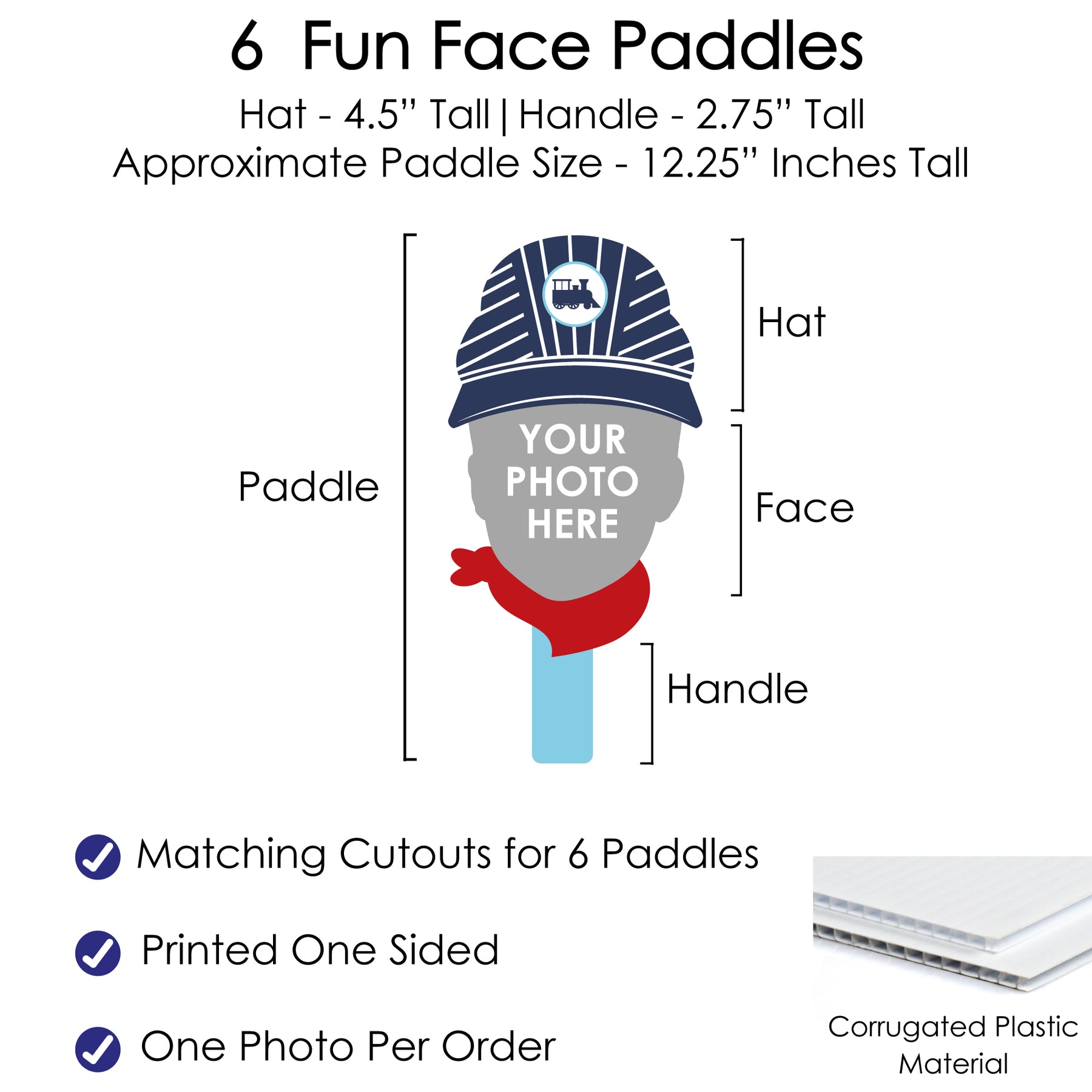 There’s no better way to shine the light on that special someone than with the Railroad Party Crossing Fun Face Cutout Paddles. Perfect for your Birthday or Baby Shower Party, this set of 6 matching face cut-out paddles will feature ONE custom photo face cut-out with a Conductor design and are a unique party accessory that will have everyone in the mood for a good time. Professionally printed one-sided on corrugated plastic, the kids train face cutouts are waterproof and weather resistant. They are suitable for indoor and outdoor use, and with proper care, they can be used more than once. Capture silly snapshots when you use them as photo booth props or keep yourself cool when you use the Railroad Party Crossing face paddle as a handheld fan. A fun and quirky way to honor your family member, friend, or beloved pet, the steam train-themed photo decorations will ignite laughter and create memories of a lifetime.