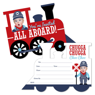 Invites & Thank YousBuild excitement for your upcoming Baby Shower or Birthday Party with the Railroad Party Crossing Fun Face Shaped Invites! These fun and quirky invitation cards come in a set of 12 with white envelopes included and will feature ONE custom picture face cut-out. Professionally printed double-sided on high-quality cardstock paper, the red steam train cards come with a photo-like shine on the front and a matte finish on the back, making it easy to handwrite all your party information. Enclose the invites in an envelope and then you can either hand-deliver the invitations or send the invites via snail mail. Your recipients will be delighted when they receive their Railroad Party Crossing party stationery and can also keep the invite card as a fun photo keepsake! Make your celebration extra special when you prepare for your party with the vintage train custom photo invitation set!