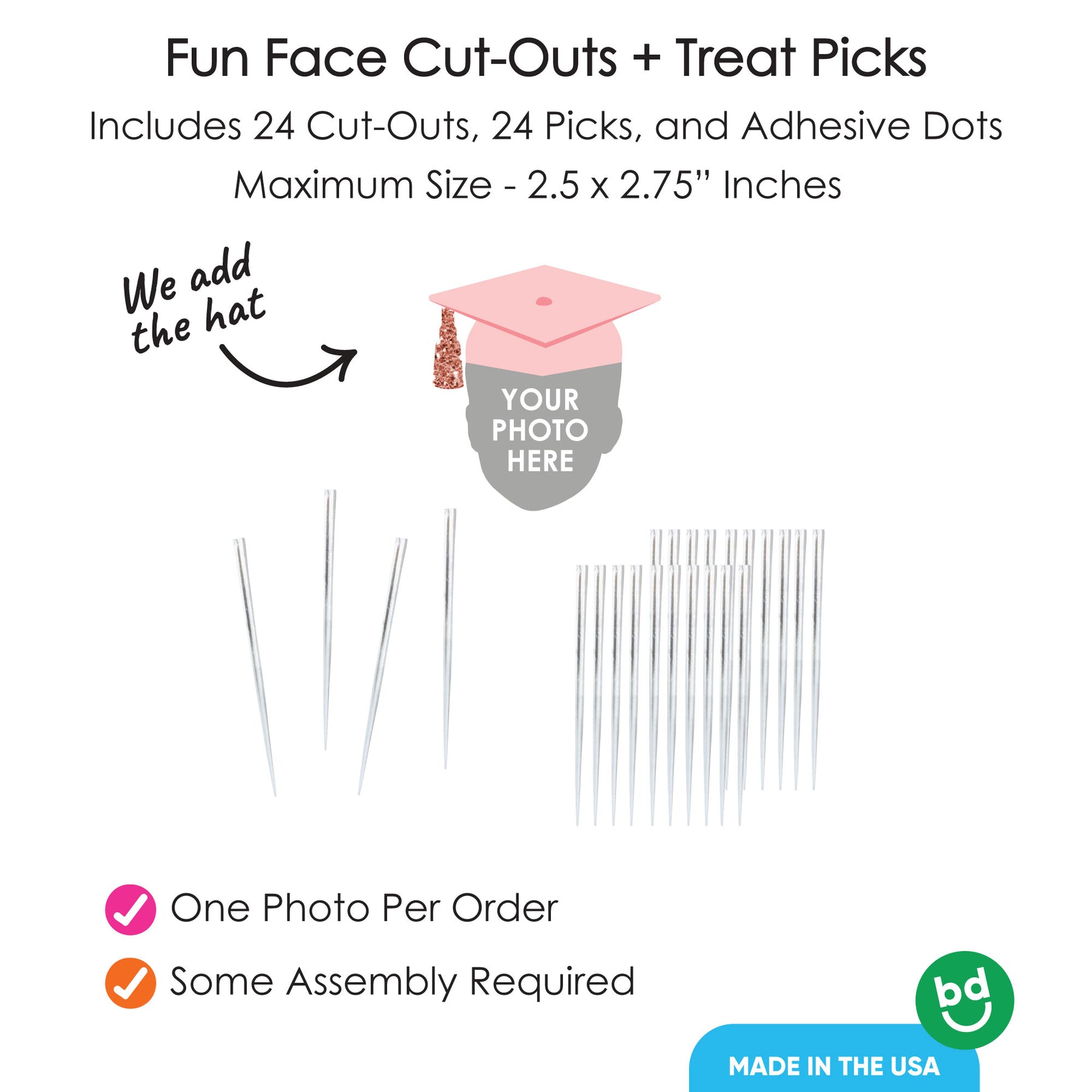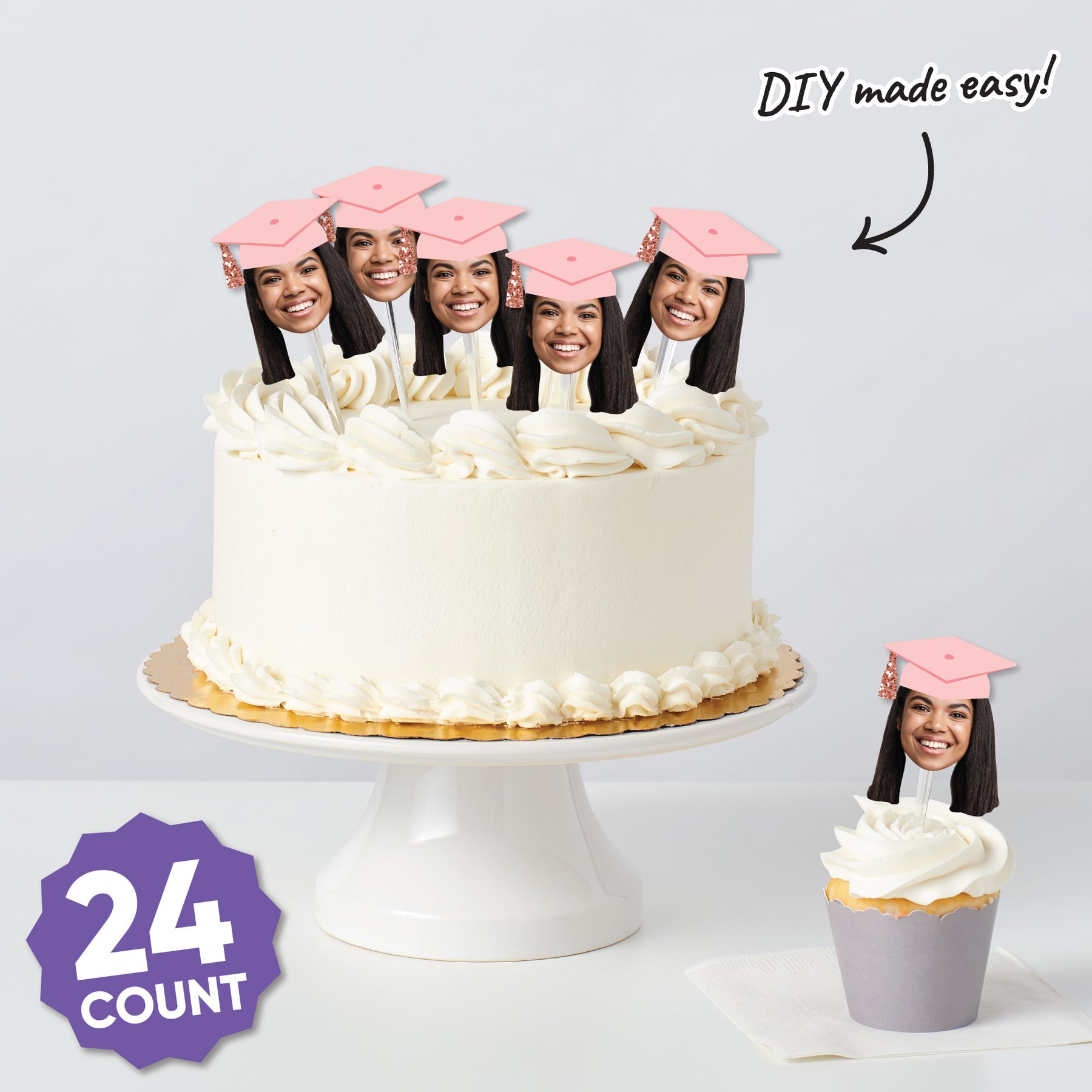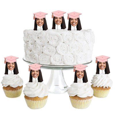 Give your grad’s dessert table a personal touch with Fun Face Graduation Treat Picks! This set of 24 features your grad’s smiling face - complete with a pink grad cap - on clear treat picks, ready to top cupcakes, brownies, donuts, and more. Just peel, stick, and let the celebrations begin! Whether you're sweetening up the dessert bar or adding flair to appetizers, these custom picks make every bite more fun. A delicious way to cheer on your grad!