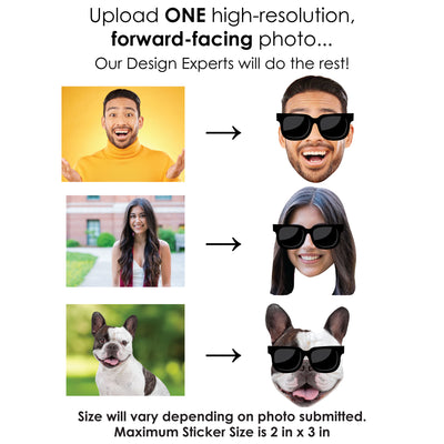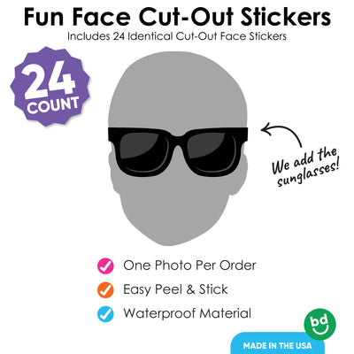 Get ready for some fun with the Photo Fun Face Cut-Out Stickers. This set of 24 die cut stickers features ONE face picture on 1 cut-out design with sunglasses and will be a great addition at your Party. Get creative when you incorporate them into your decorations by sticking them onto invitations, party hats, or wrapped treats. Or, hand them out to guests as playful party favors that can be used to adorn water bottles, electronics, planners, scrapbooks, and more! Professionally printed on waterproof sticker paper, the shaped Photo stickers are easy to use. Simply peel and stick on your desired surface. Whether you're celebrating a family member, dear friend, or even your beloved pet, these customized head cut-out stickers will add a charming and quirky touch to your occasion. From party decorations to everyday items, add some fun to your world with the personalized stickers!