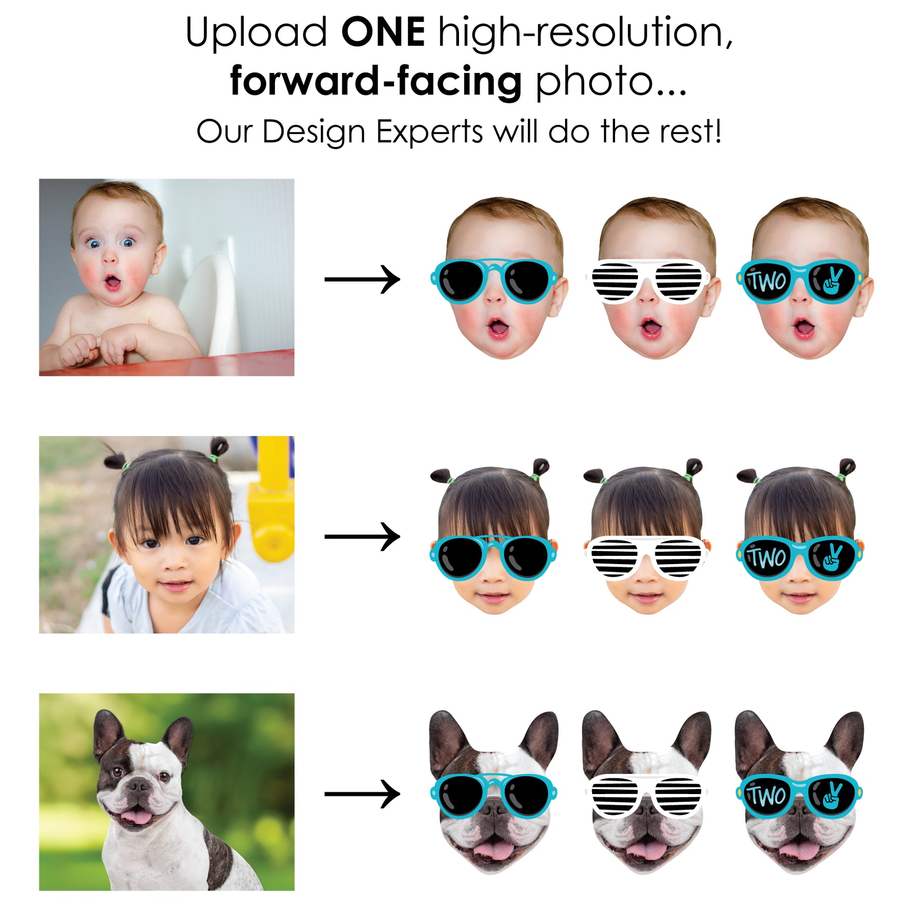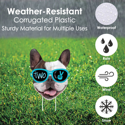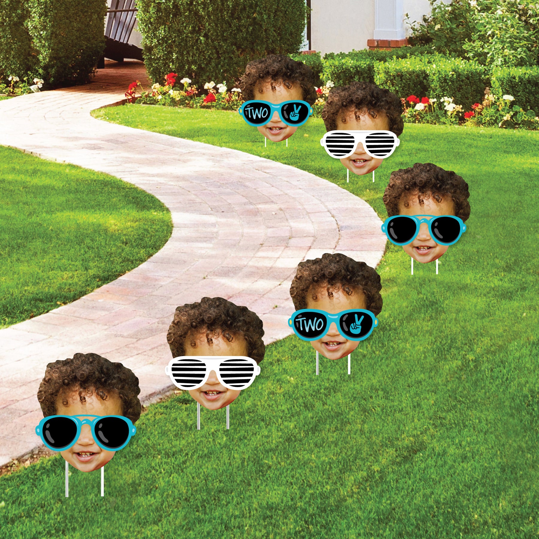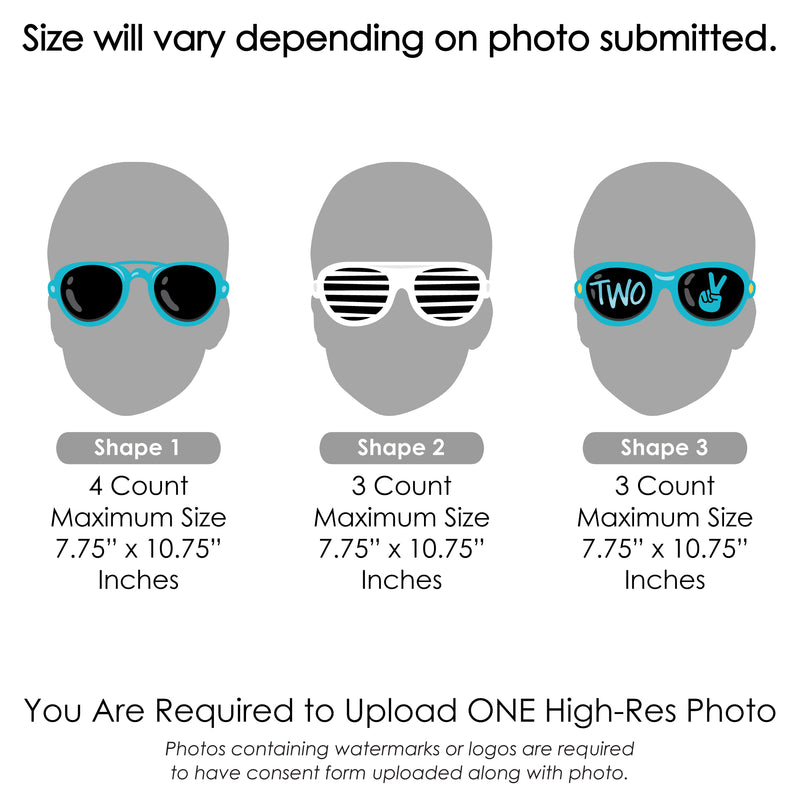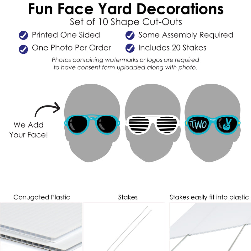 Create an impressive look at your Blue 2nd Birthday Party with the custom Two Cool - Boy Fun Face 10-Piece Yard Signs. This outdoor lawn decor set comes with 10 matching custom picture yard signs of ONE face photo cut-out and will have everyone ready for a silly time at your Toddler celebration. A fun and creative way to spotlight the guest of honor, each outdoor shape comes with two stakes, making it easy to display on lawns, driveways, or courtyards. Simply insert the stakes into your yard signs and then firmly press them into the ground. Two Cool - Boy yard signs are professionally printed on corrugated plastic, making them waterproof and weather resistant. They are perfect for short-term display but can be used multiple times with proper care. Alternatively, the yard signs can be displayed on a wall when you use your own wall mounts and are the perfect memory keepsakes after the party is over. Make a lasting impression when you display the custom Sunglasses photo yard signs.