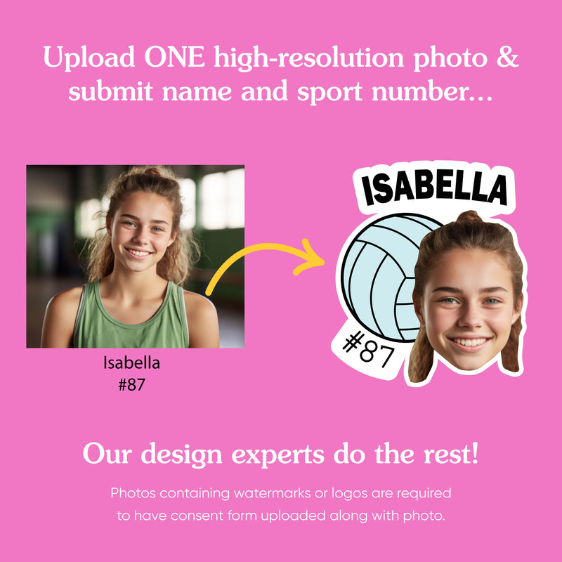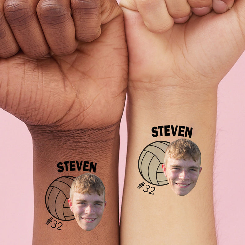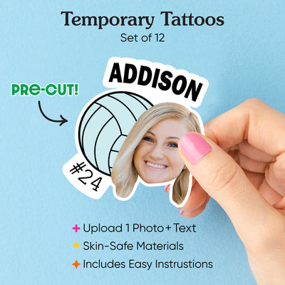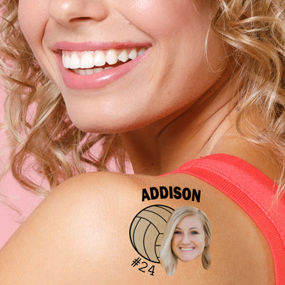 Serve Up Some Team Spirit - With Your Face! Customize these volleyball-themed temporary tattoos with a name, jersey number, and a face for a fun and personal touch. Each set includes 12 tattoos, making them a great addition to tournaments, team events, and volleyball parties. Wear your love for the game with pride!