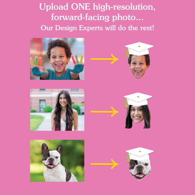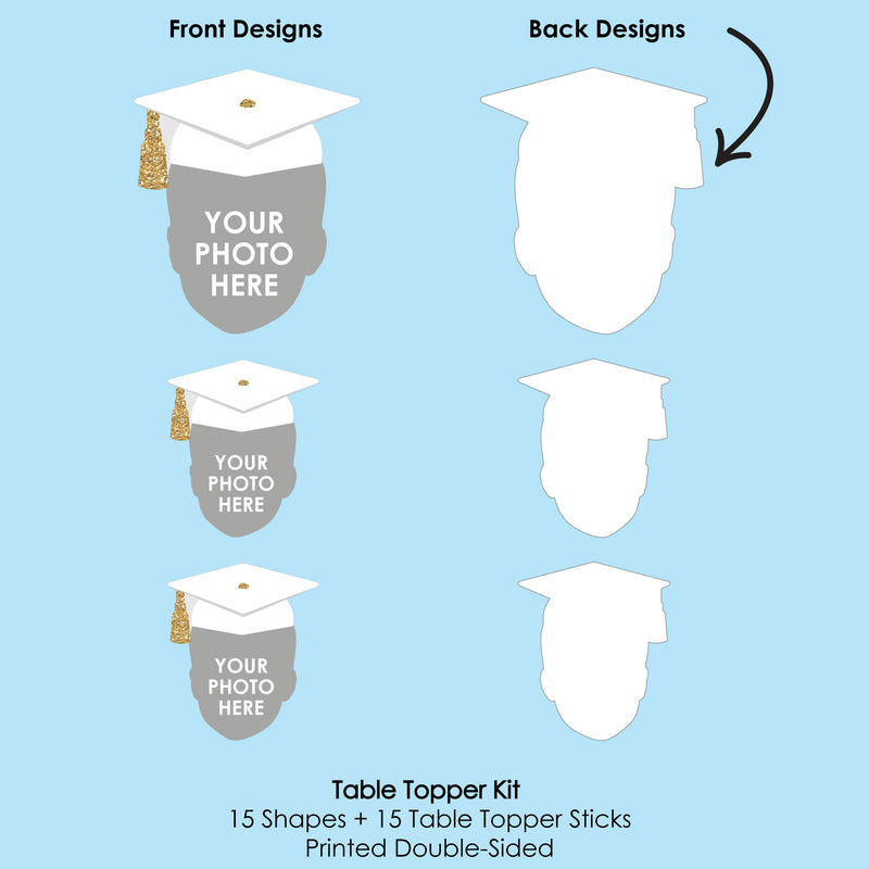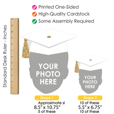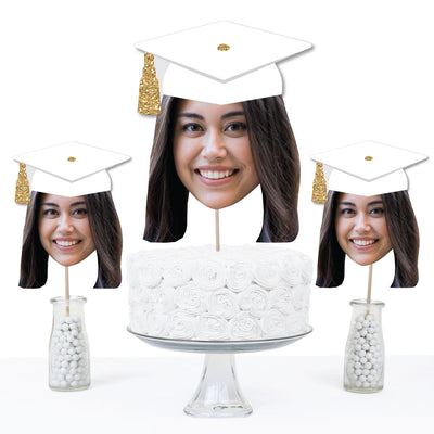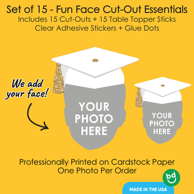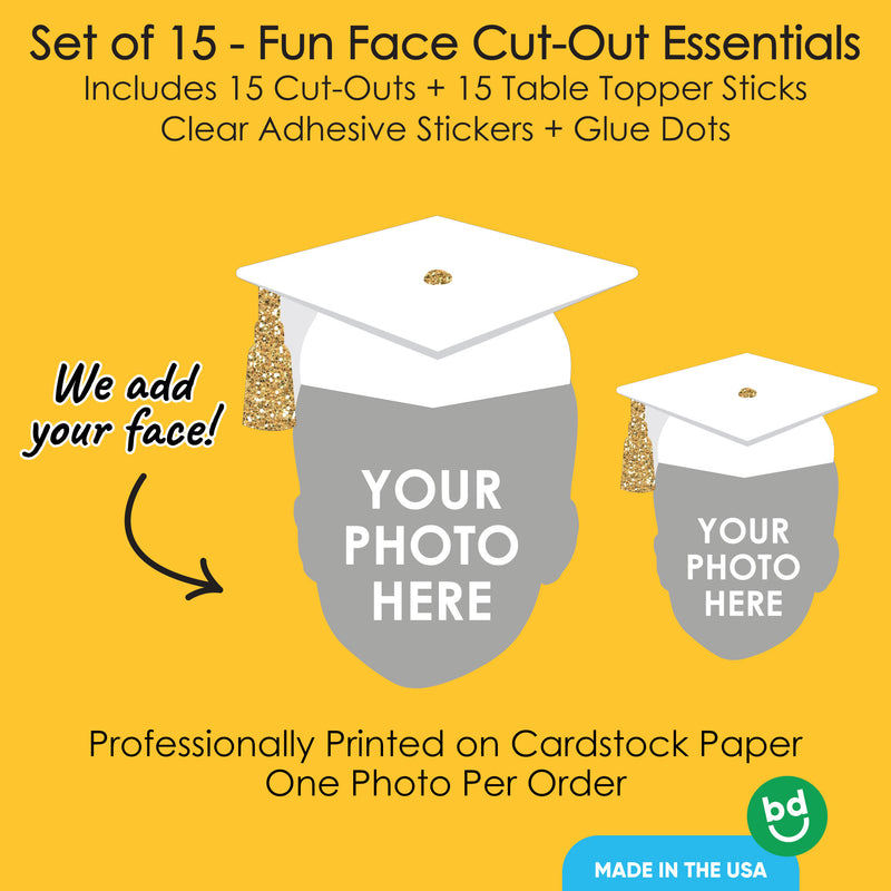 Make your graduation party extra fun with White & Gold Grad Cap Fun Face Cutout Centerpiece Sticks! This set includes 15 custom photo table toppers in two sizes, plus sticks and stickers for easy assembly. Perfect for centerpieces, candy buffets, or photo booths, these cutouts add a personalized touch to your celebration. Professionally printed on heavyweight cardstock with a glossy finish, they’re proudly made in the USA. Upload your favorite grad’s photo and let the party begin!