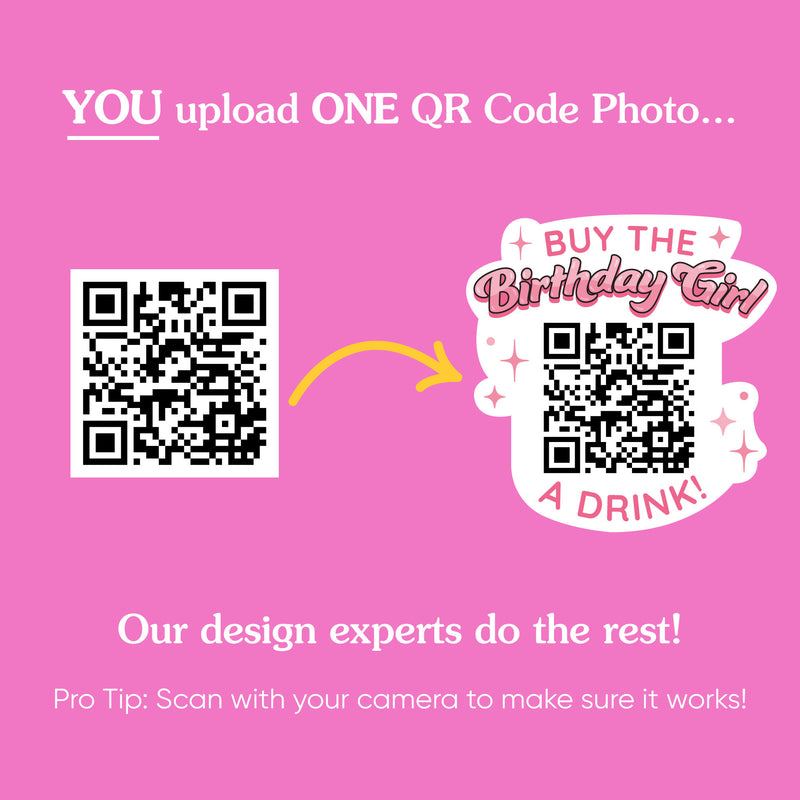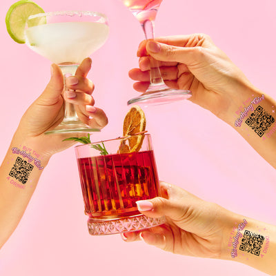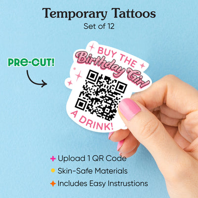 Cheers to the birthday girl! Our “Buy The Birthday Girl A Drink!” Custom QR Code Temporary Tattoo is the ultimate birthday party favor. Upload your custom QR code, and guests can scan it to treat the birthday girl to a drink and keep the celebration going.