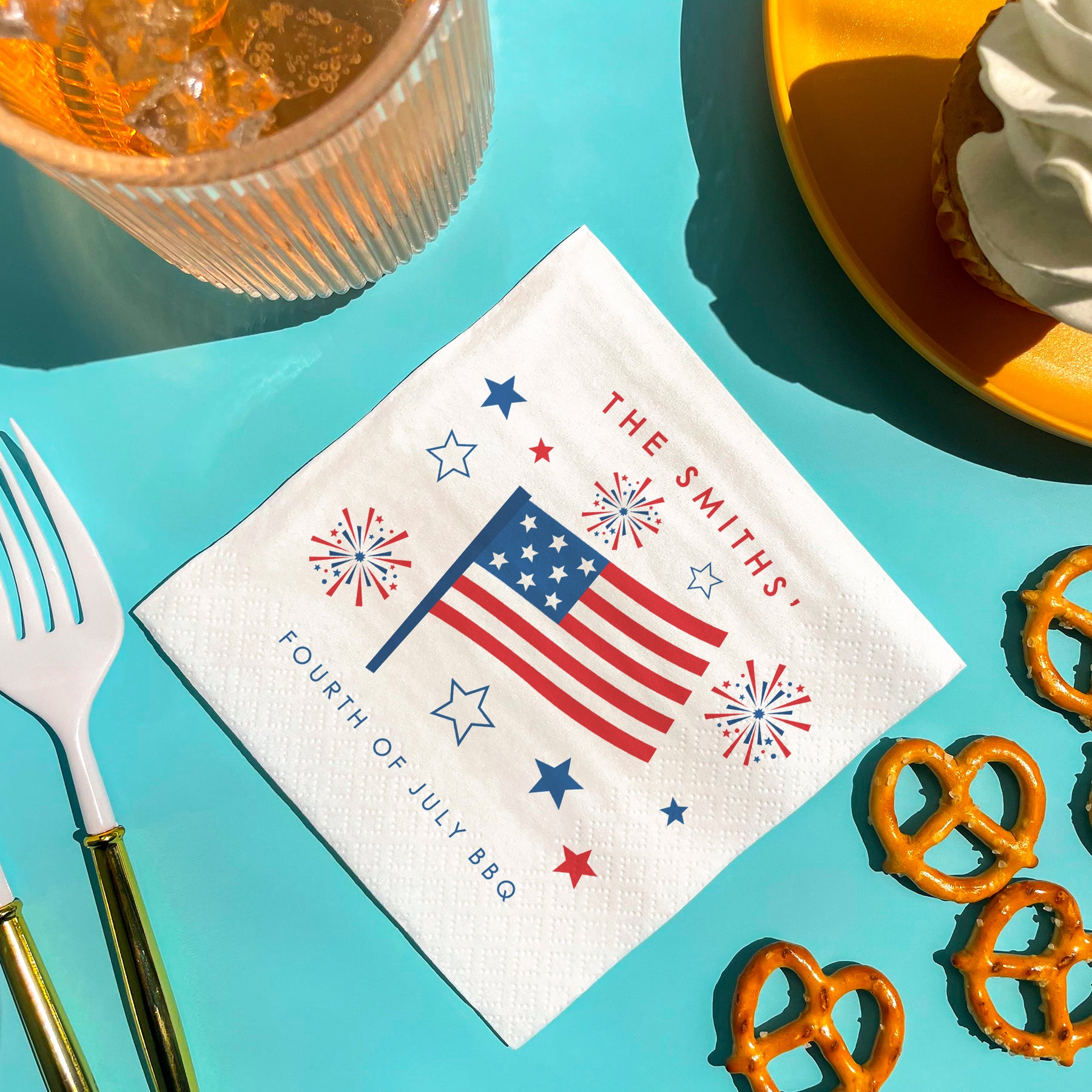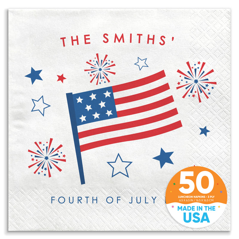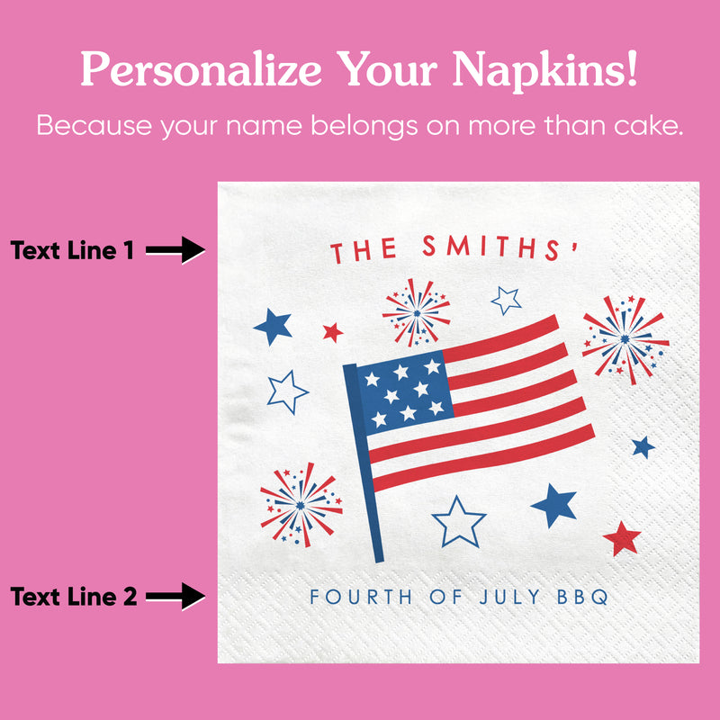 Party in the USA—and make it personal! These red, white, and blue napkins are ready to celebrate your 4th of July BBQ, Veterans Day program, or family cookout in star-spangled style. Add custom text like names, dates, or your own fun message to create a look that’s all yours. Available in beverage and luncheon sizes, each napkin is printed on soft 3-ply paper and sold in packs of 50 or 150—so you’re covered from appetizers to fireworks. Proudly made in the USA and perfect for any all-American gathering!