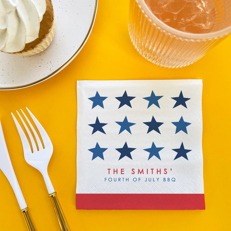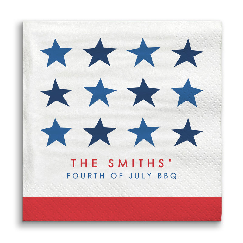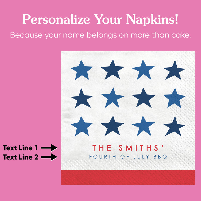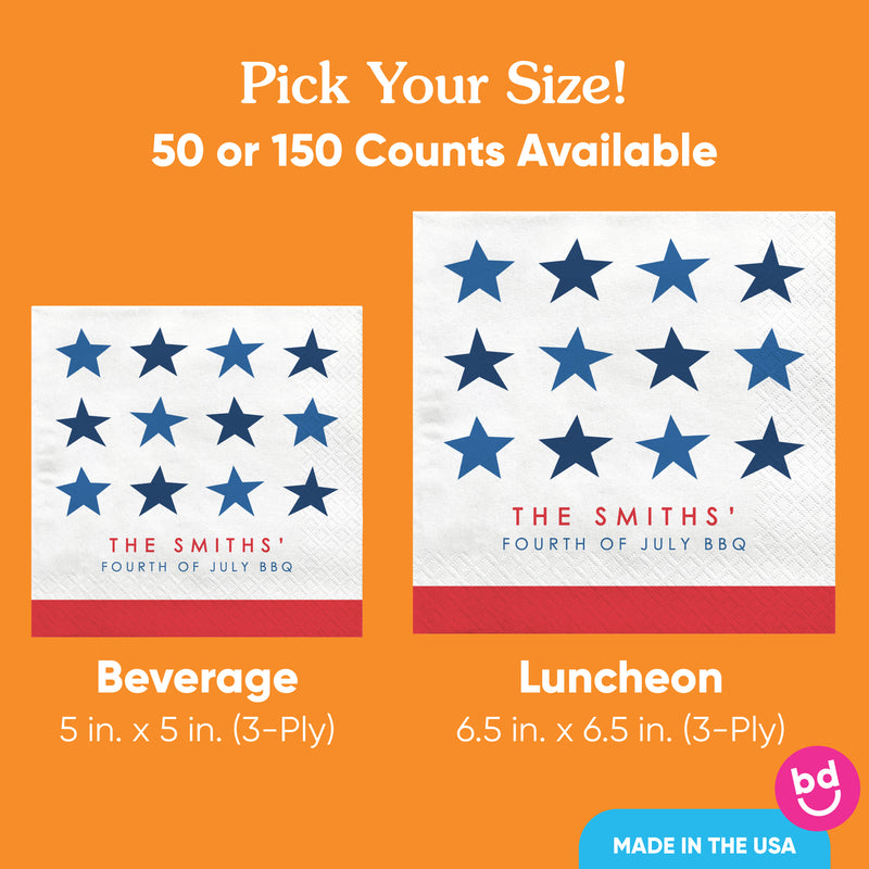 Party in the USA—and make it personal! These red, white, and blue napkins are ready to celebrate your 4th of July BBQ, Veterans Day program, or family cookout in star-spangled style. Add custom text like names, dates, or your own fun message to create a look that’s all yours. Available in beverage and luncheon sizes, each napkin is printed on soft 3-ply paper and sold in packs of 50 or 150—so you’re covered from appetizers to fireworks. Proudly made in the USA and perfect for any all-American gathering!