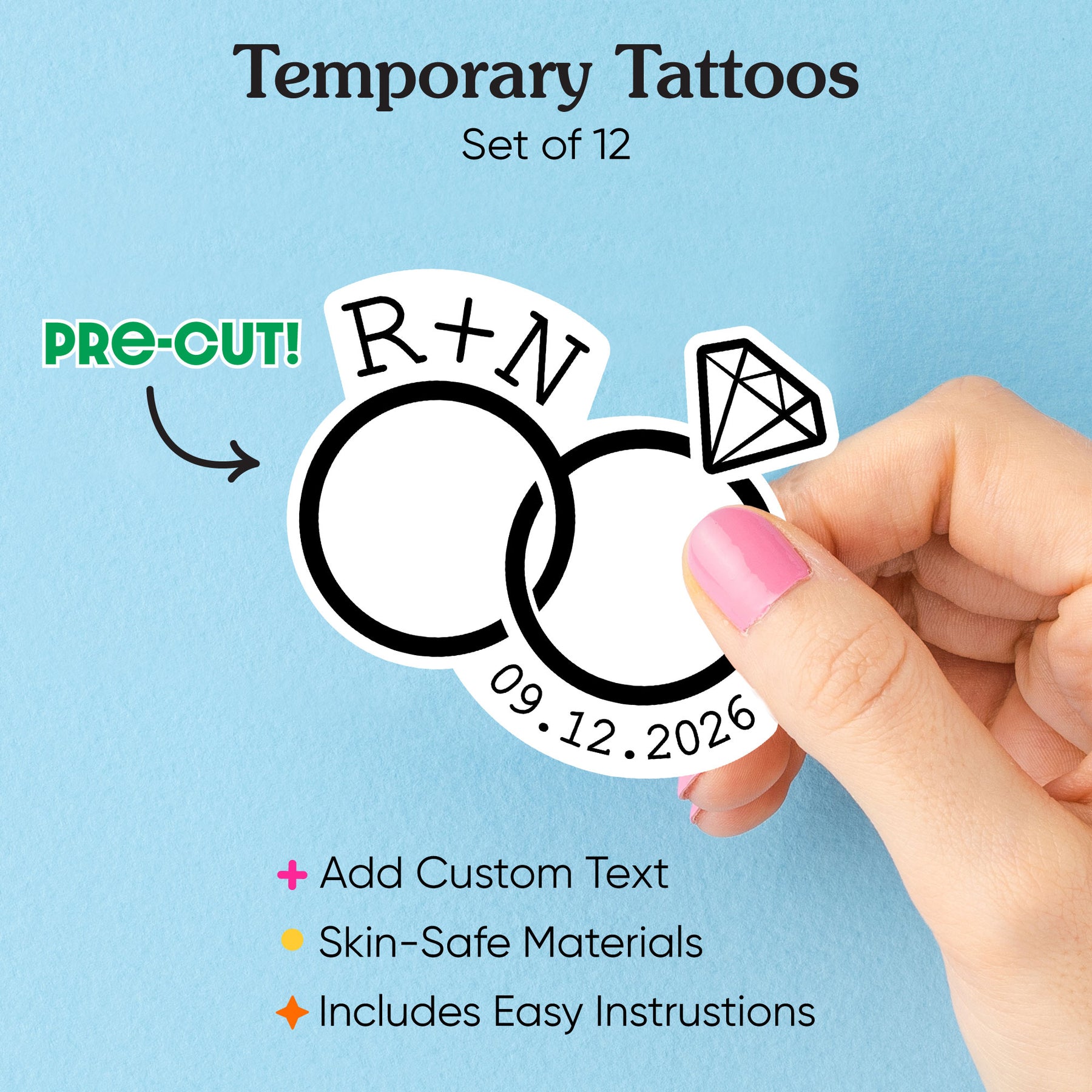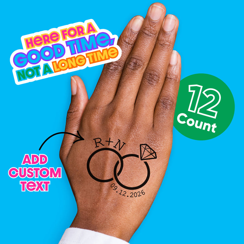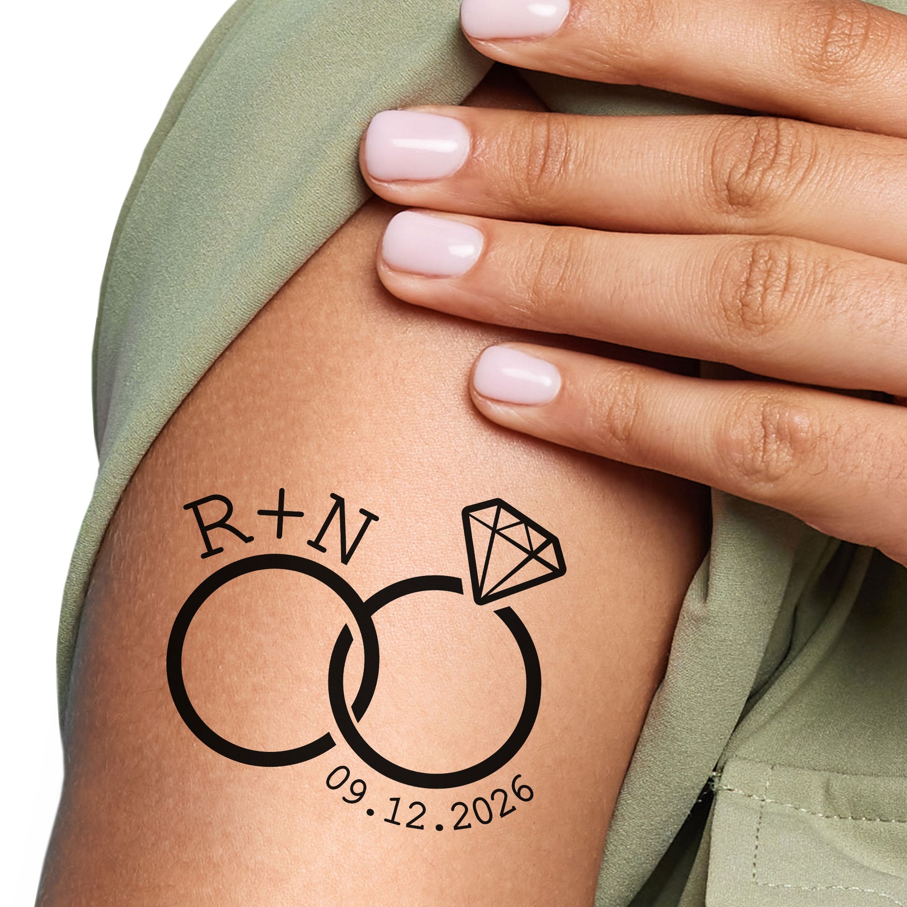 Say hello to our Custom Wedding Ring Temporary Tattoos! Featuring two interlocked rings with space for your initials and wedding date, these tattoos are a sweet and stylish way to celebrate your big day.