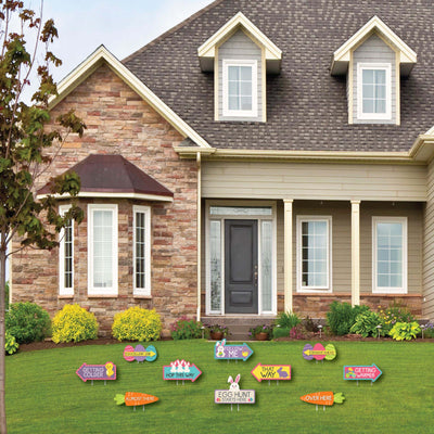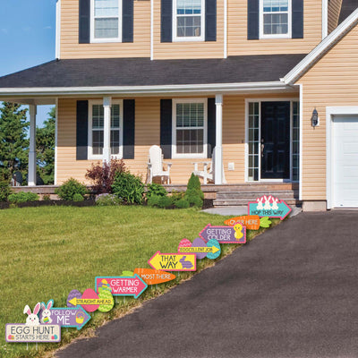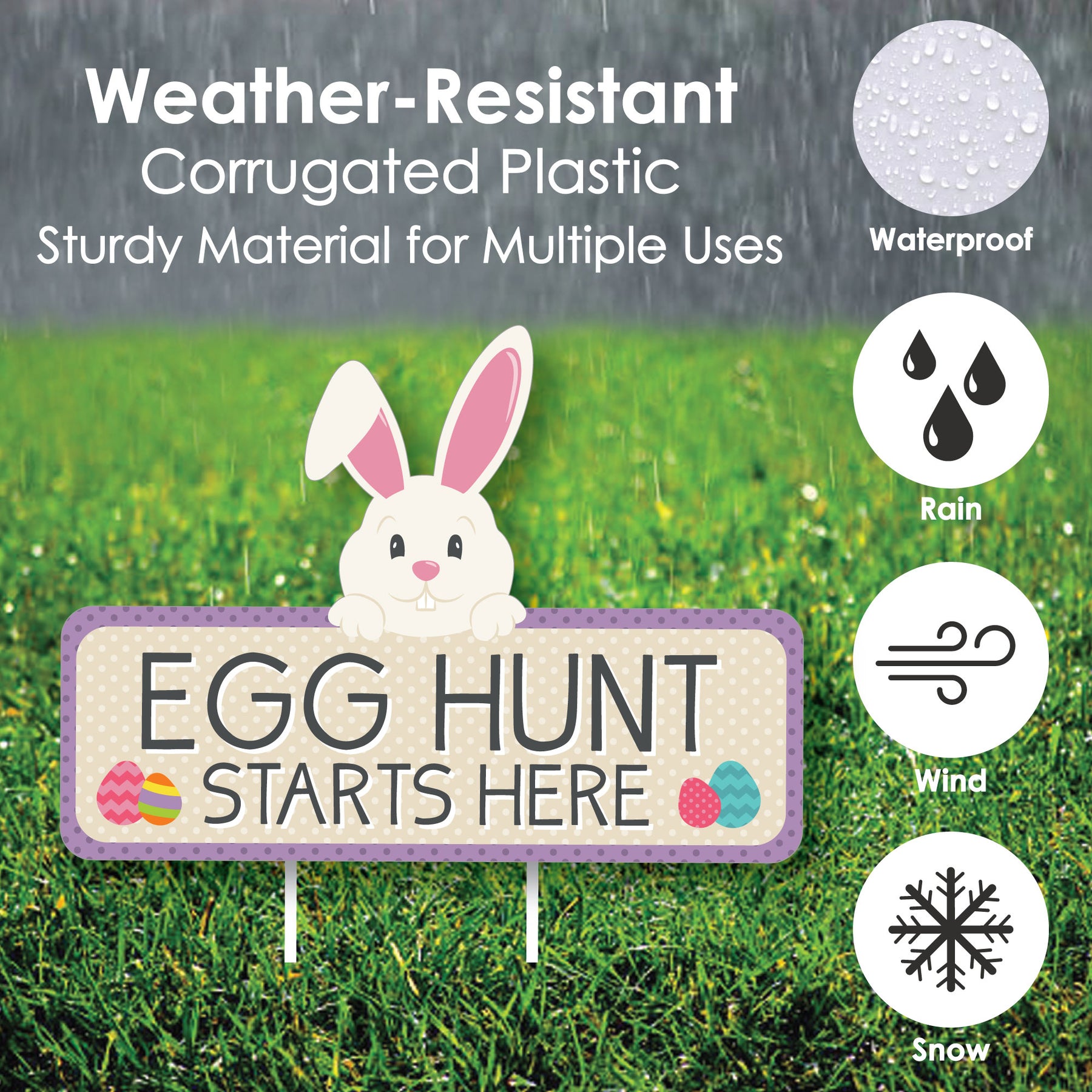 An impressive Easter yard sign is sure to delight your guests and surprise everyone. This 10-piece set of Easter Egg Hunt Arrow Yard Signs is professionally printed with vivid colors to really make a statement wherever it is used. Each shaped outdoor Easter arrow comes with two stakes, making it easy to display on lawns, driveways or courtyards. Best of all, Easter Egg Hunt shapes are cut separately so you can arrange them any way you please. This decorative yard sign is made of waterproof plastic and is weather resistant, perfect for short-term display but can be used again and again with proper care.