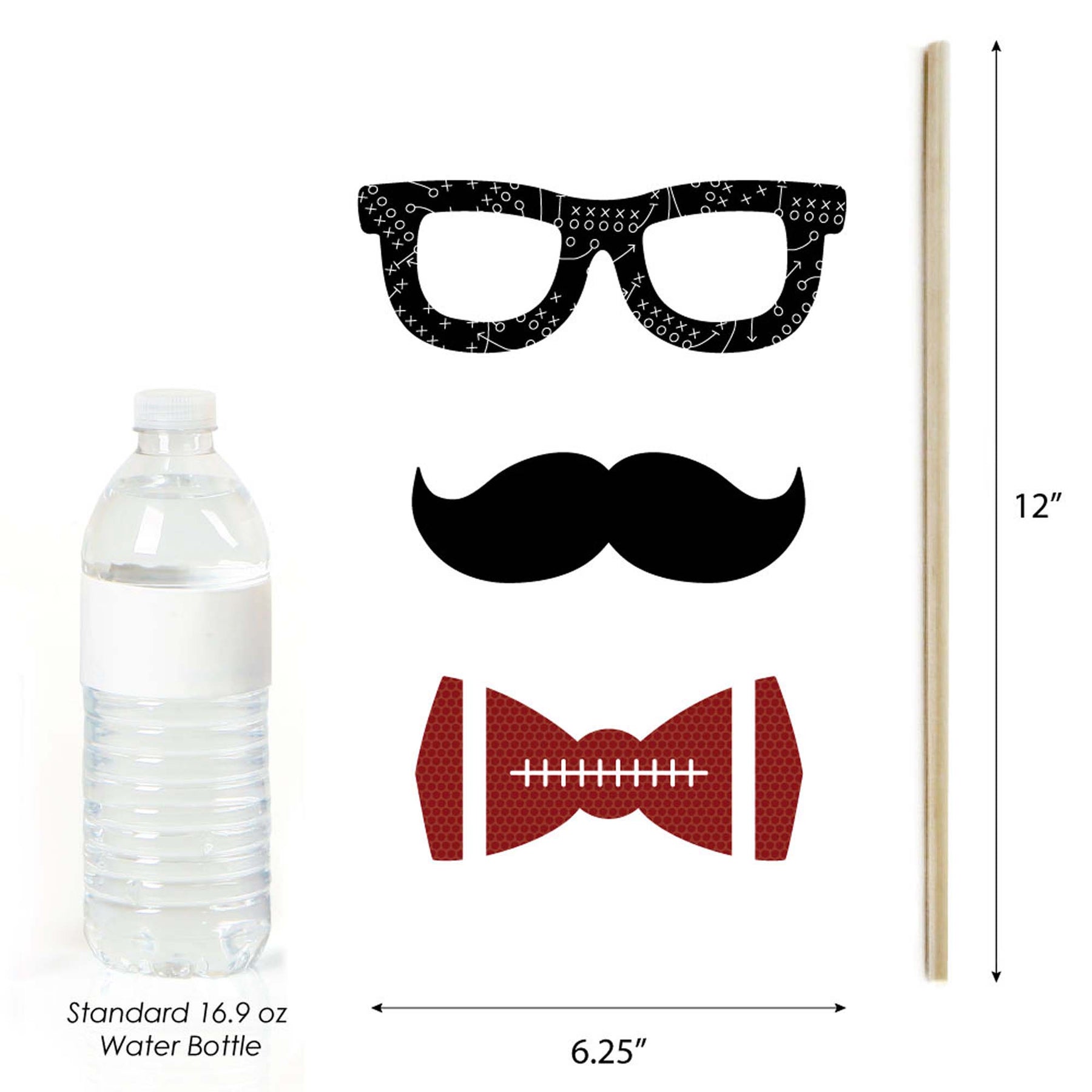 The perfect photo booth begins with fabulous photo booth props. Our printed and cut kit will help you easily create fun party photos at your next baby shower or birthday party. This End Zone - Football party photo booth props kit comes with 20 pieces and ready for quick assembly. Simply add the included prop kit sticks to each prop, attaching with the included clear stickers, and display alongside a fun photo booth backdrop. Your party guests will love the mustaches, bowties, lips, glasses, hats and talk bubbles!