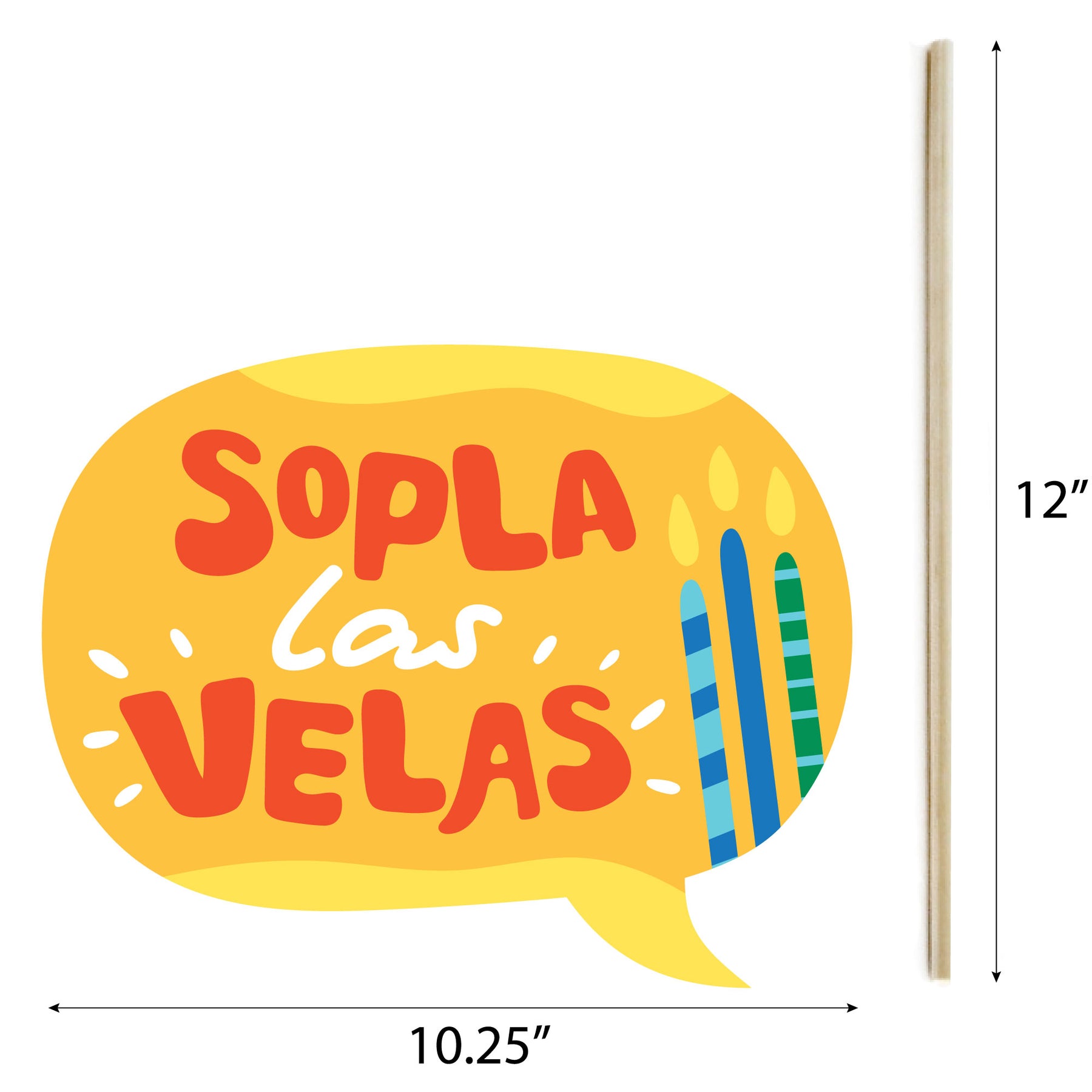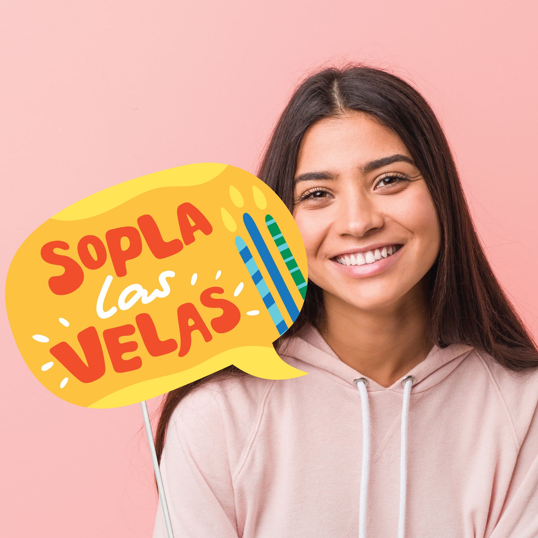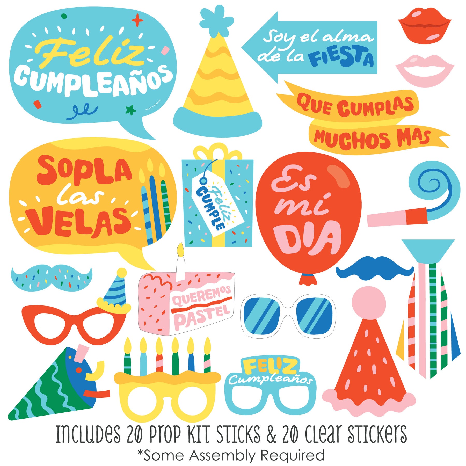 The perfect photo booth begins with fabulous photo booth props. Our printed and cut kit will help you easily create fun party photos at your next Spanish Birthday Party. This Feliz Cumpleano party photo booth props kit comes with 20 pieces, and is ready for quick assembly. Simply add the included prop kit sticks to each prop, attaching with the included clear stickers, and display alongside a fun photo booth backdrop. Your party guests will love the mustaches, bow ties, lips, glasses, hats and talk bubbles!
