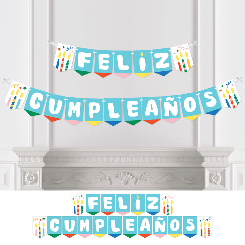 The Feliz Cumpleanos, Spanish Birthday Party Banner, is a must-have decoration for your fiesta-themed celebration. Featuring bright candle-themed party pennants and "Feliz Cumpleanos" lettered pennants, this banner adds the perfect touch to your Bday party decor. Easily assemble the bunting banner with the included white ribbon and create a charming focal point for your celebration.