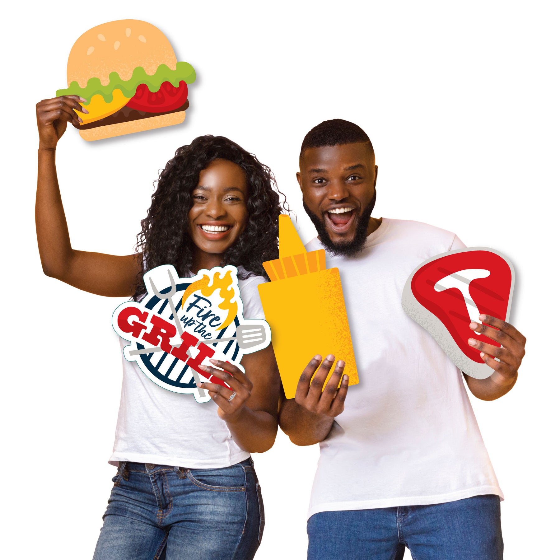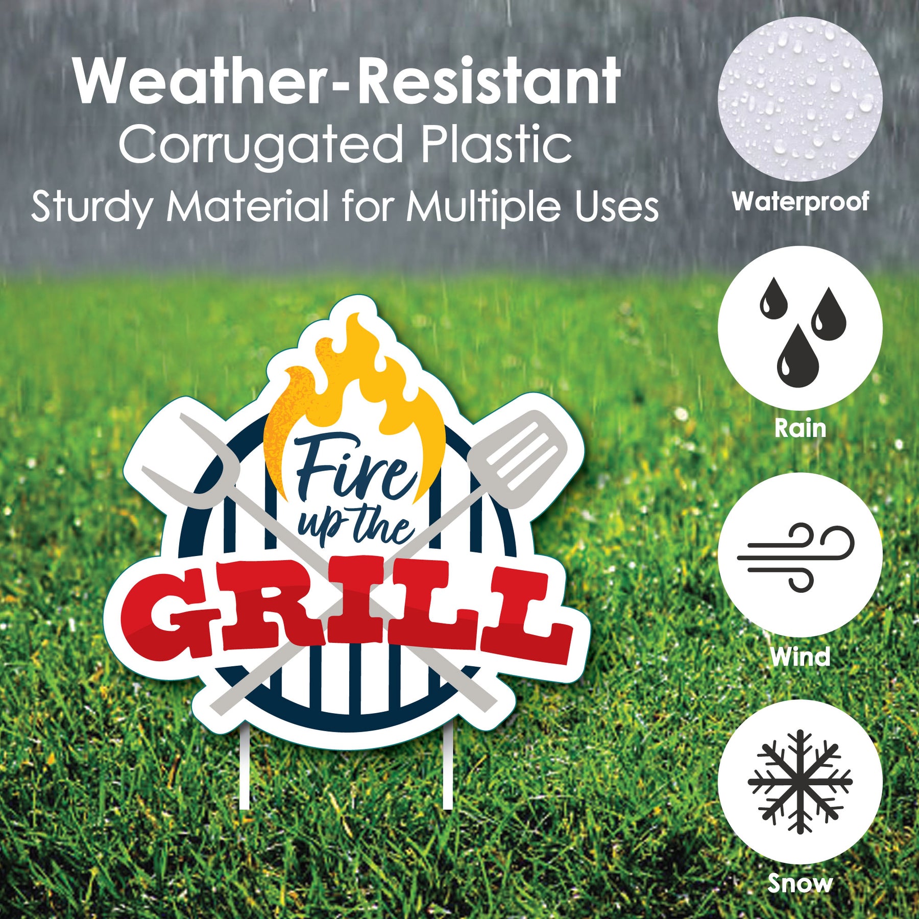 An impressive Fire Up the Grill yard sign is sure to delight your guests and surprise everyone. This 8-piece set of Fire Up the Grill lawn decorations is professionally printed with vivid colors to really make a statement wherever it is used. Each outdoor shape comes with two stakes, making it easy to display on lawns, driveways or courtyards. Best of all, Fire Up the Grill shapes are cut separately so you can arrange them any way you please. These decorative yard signs are made of waterproof plastic and are weather resistant, perfect for short-term display but can be used again and again with proper care.